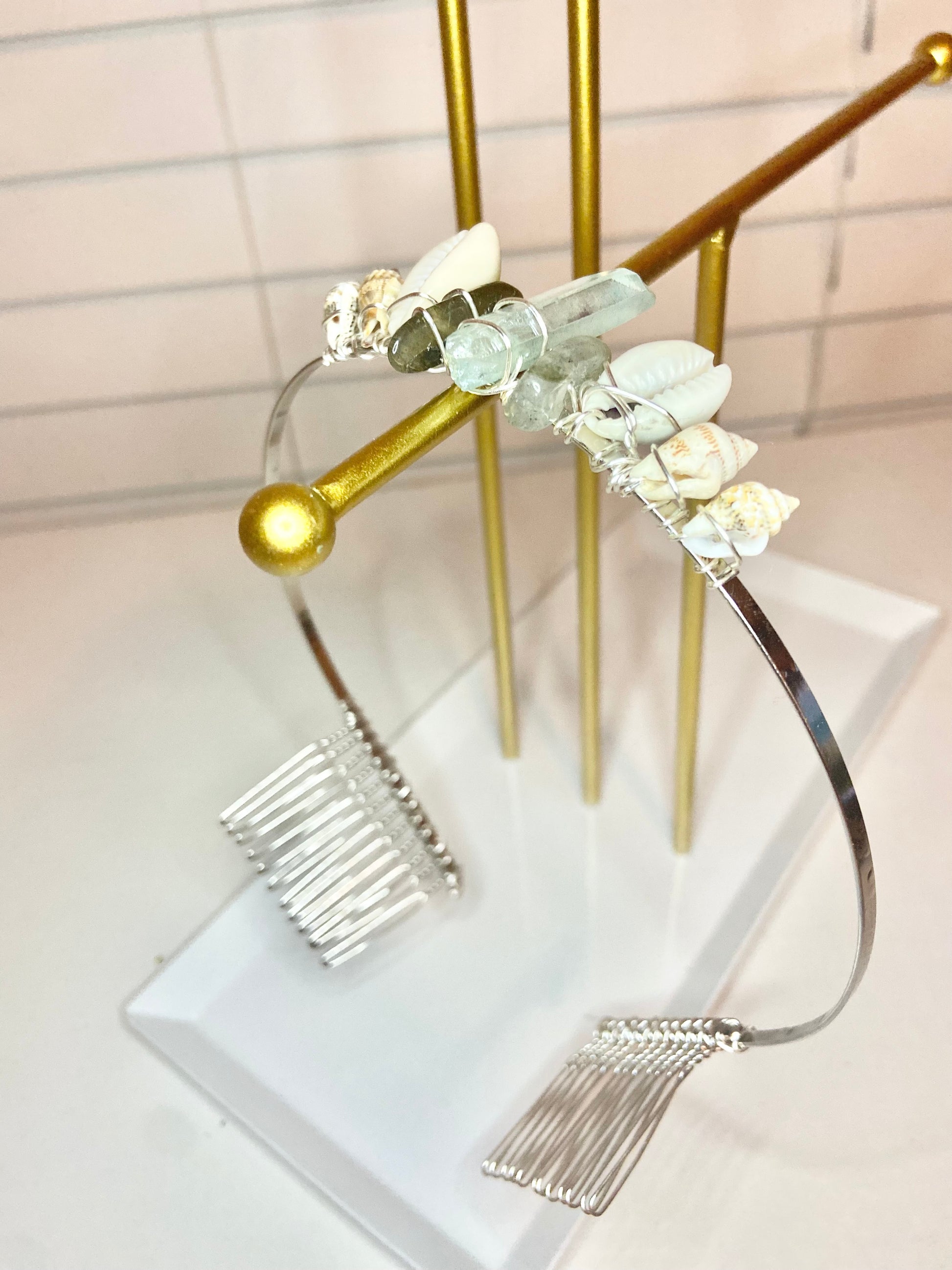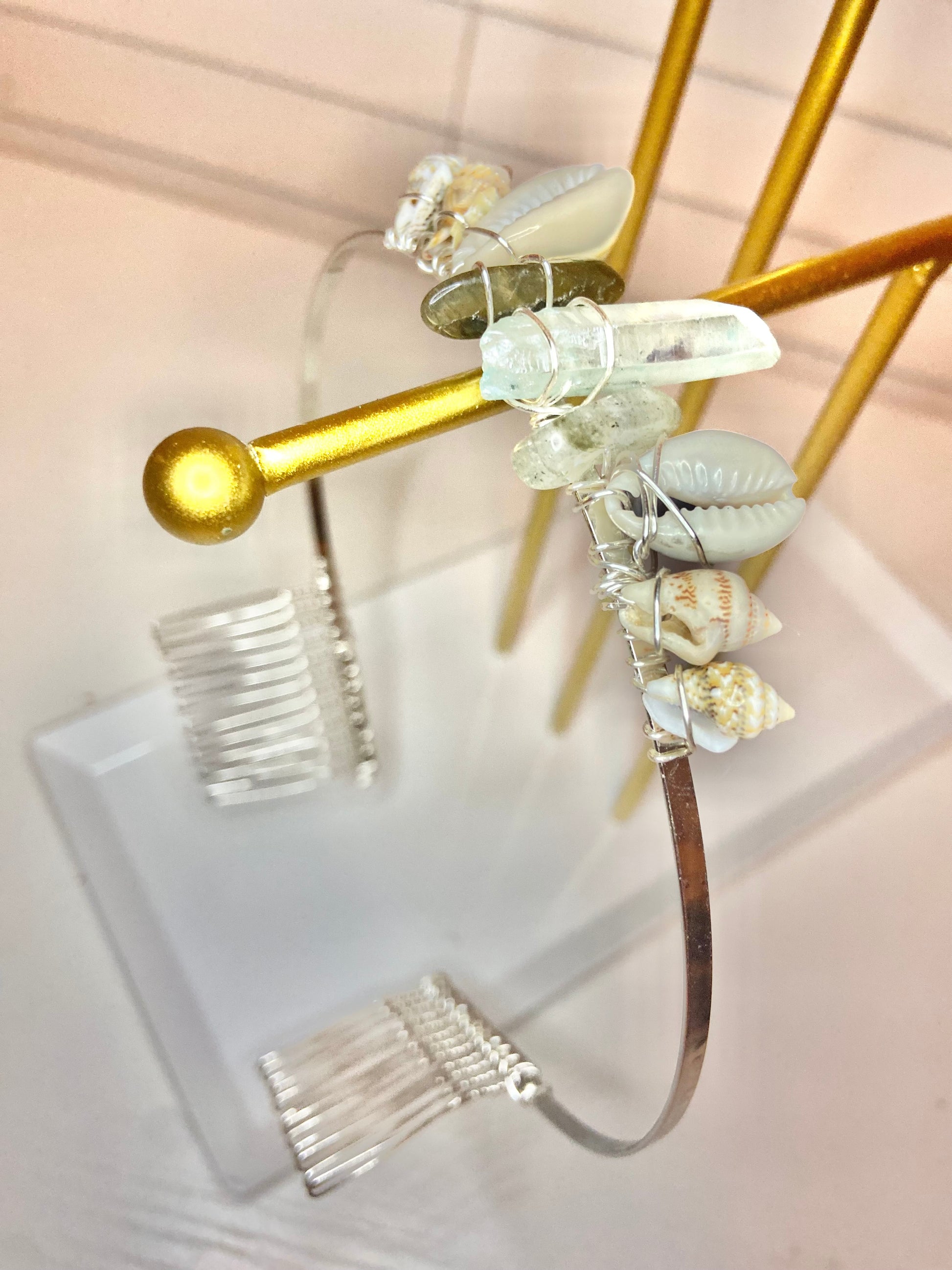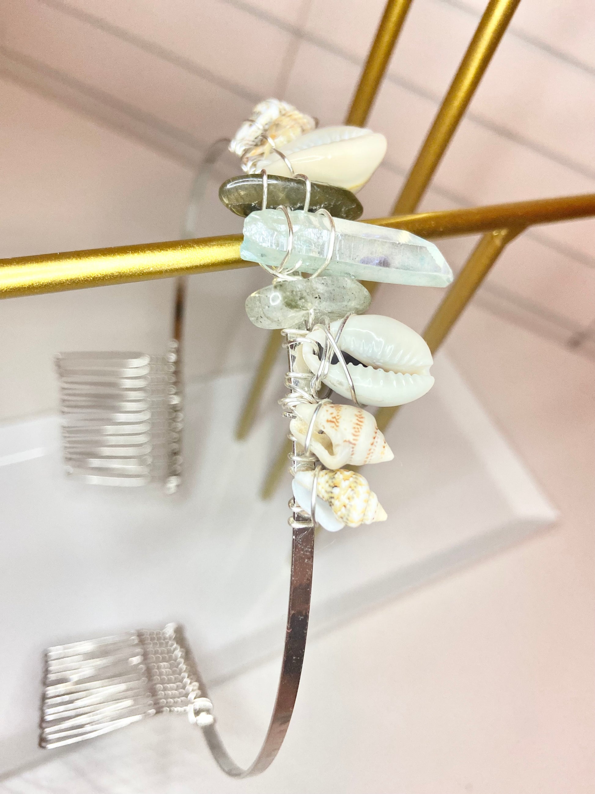 Tiara made with aquamarine and labradorite crystals and seashell wrapped with silver wire.