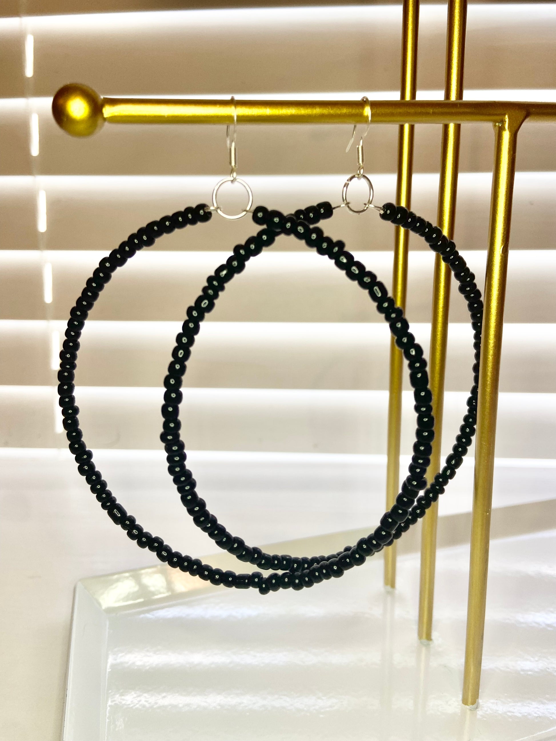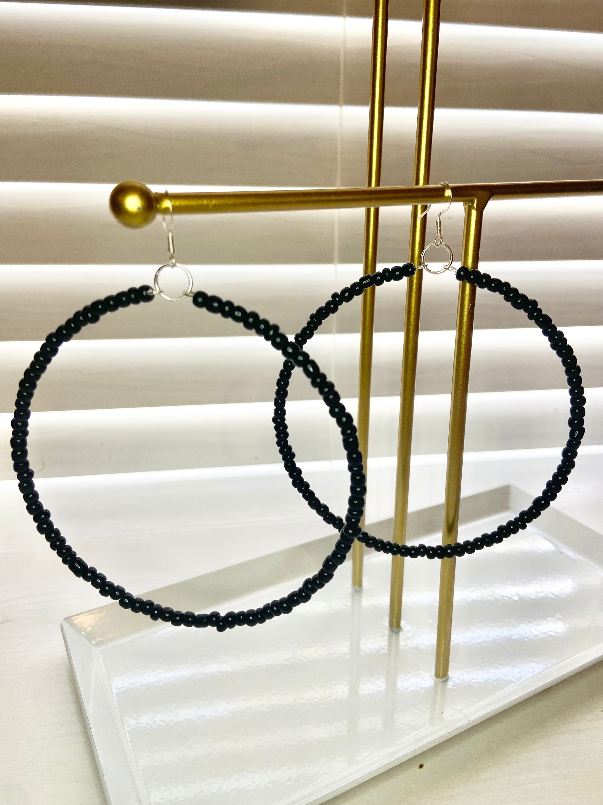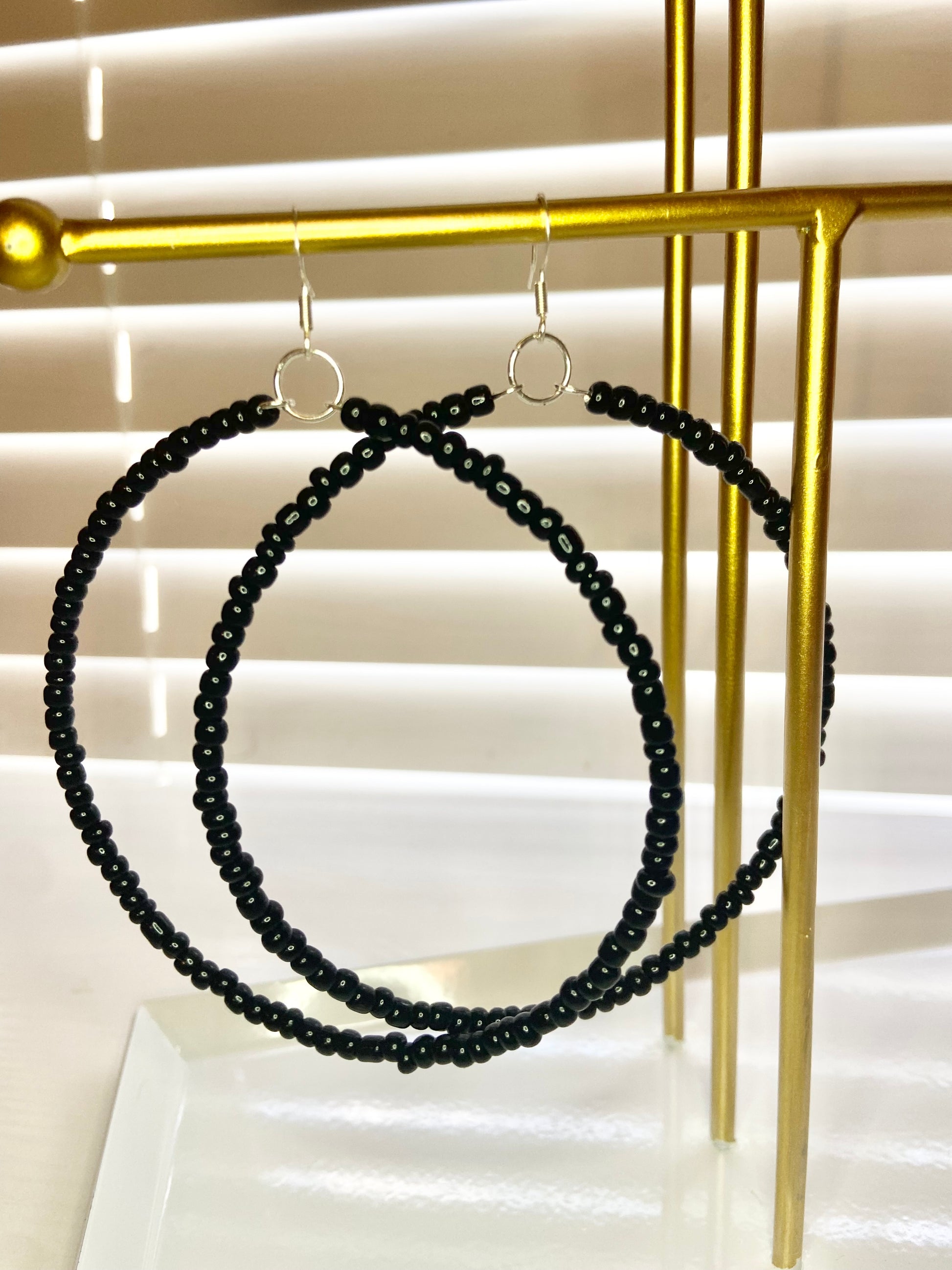 Large hoop earrings made with black seed beads.