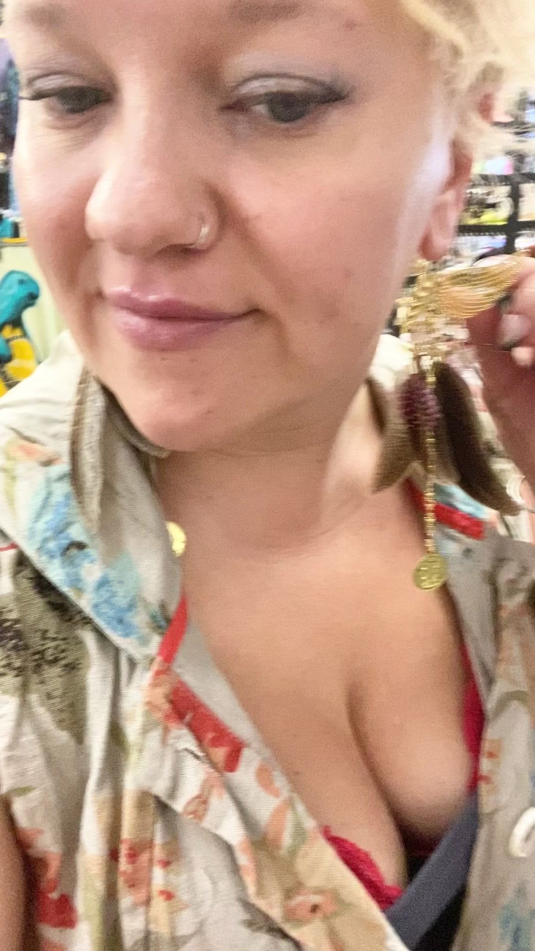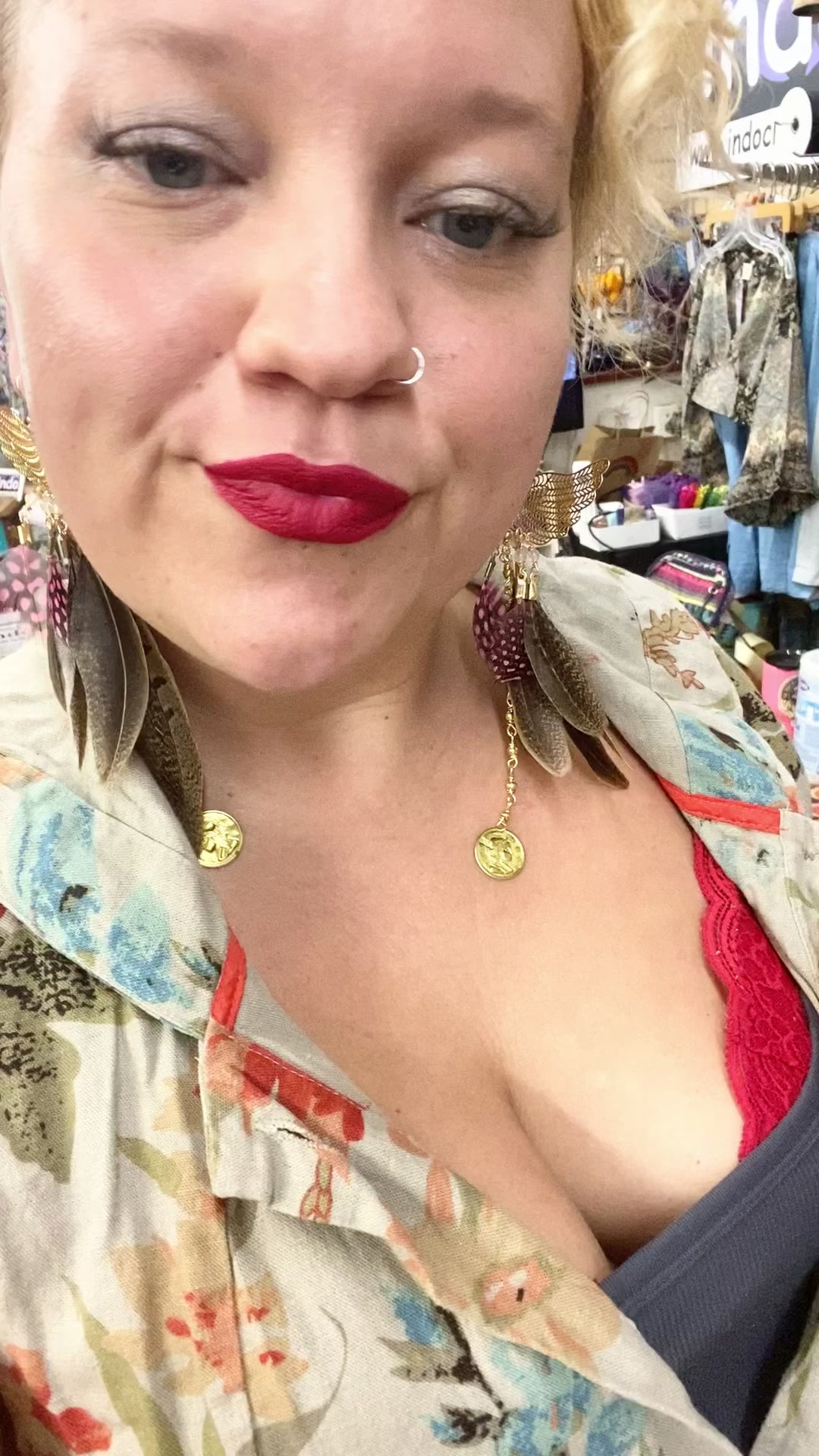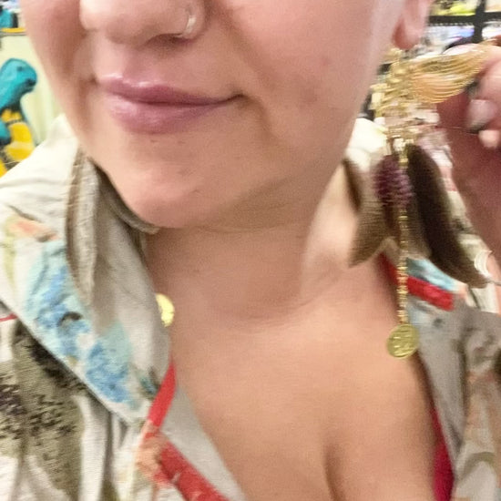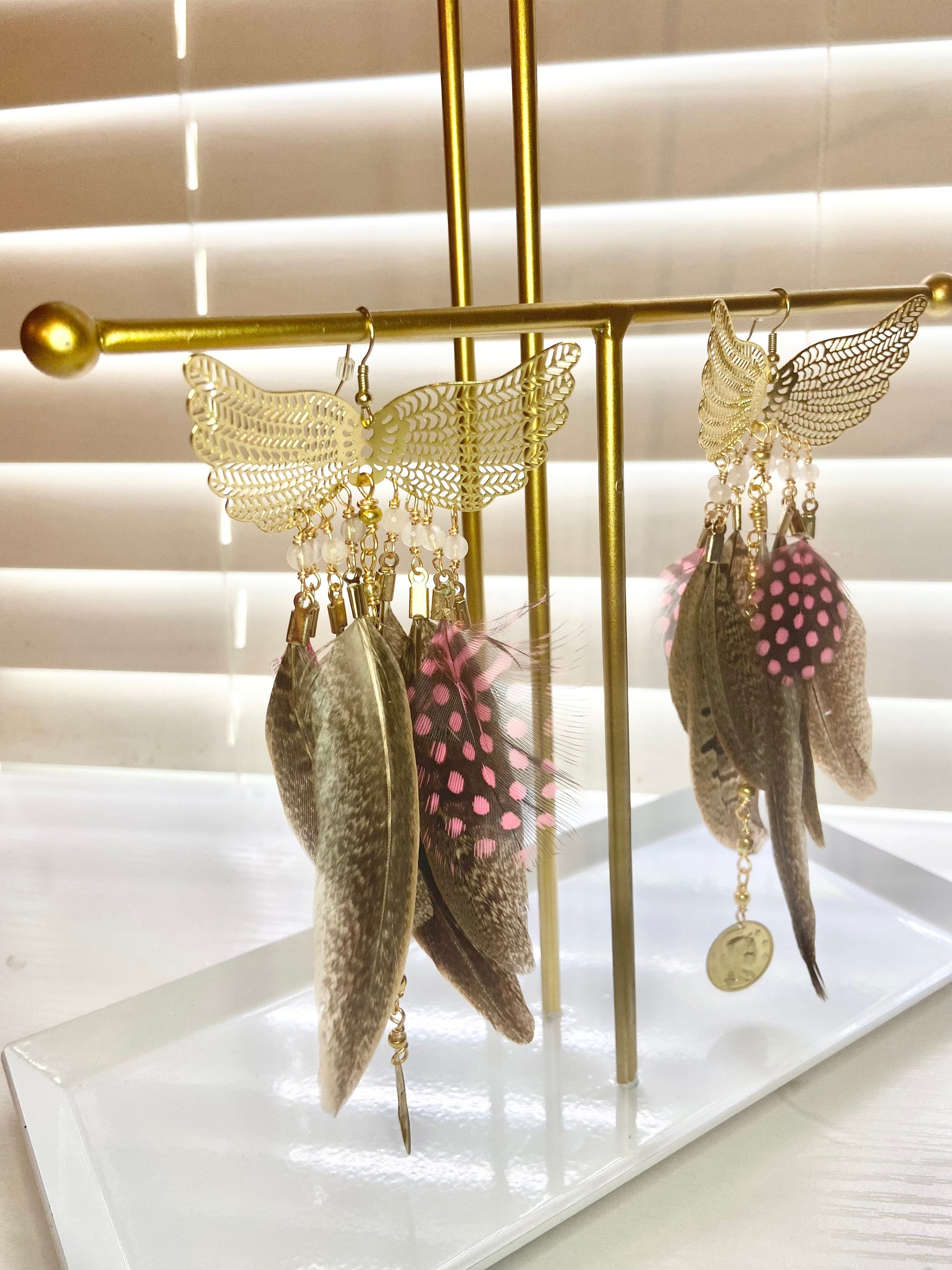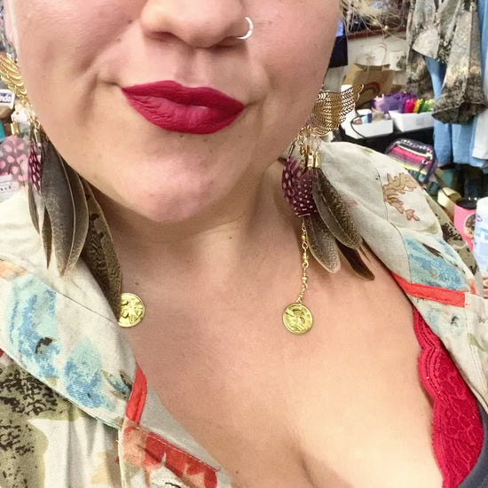 Earrings made with peasant feathers, and pink chicken, feathers, and gold seed beads with a gold coin charm.