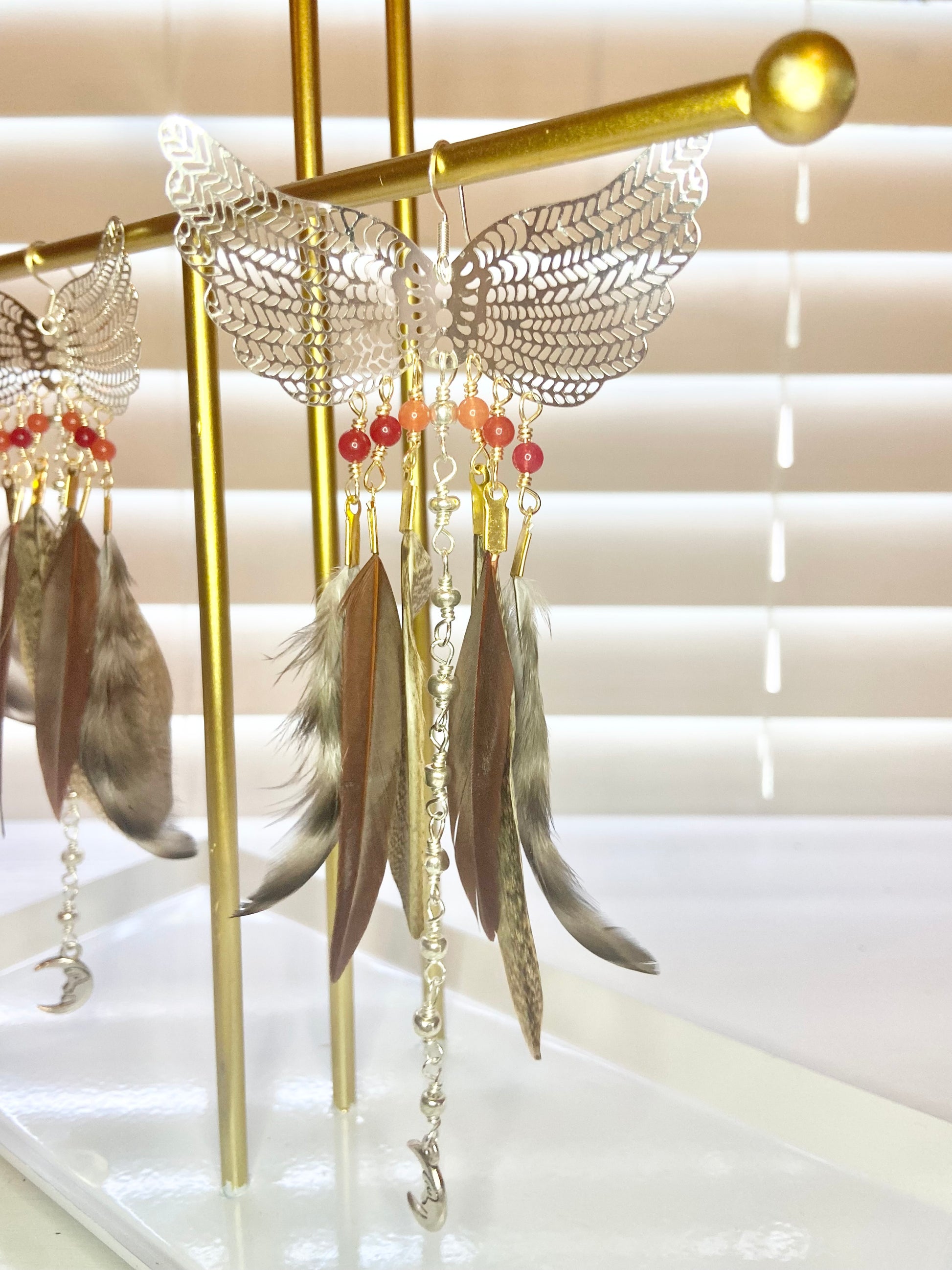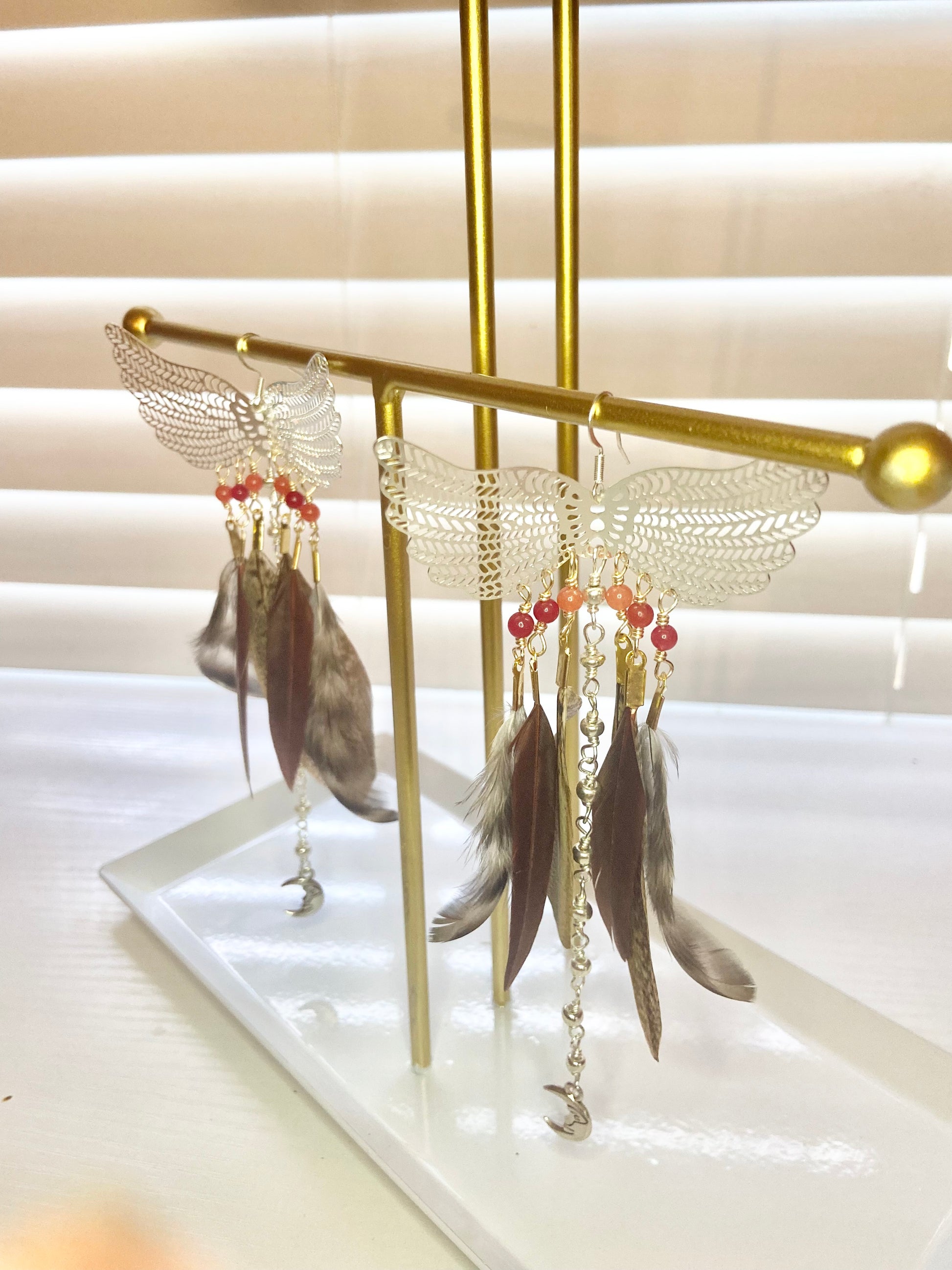 Earrings made with silver colored wings with chicken and faux feathers, carnelian seed beads and a silver moon charm.