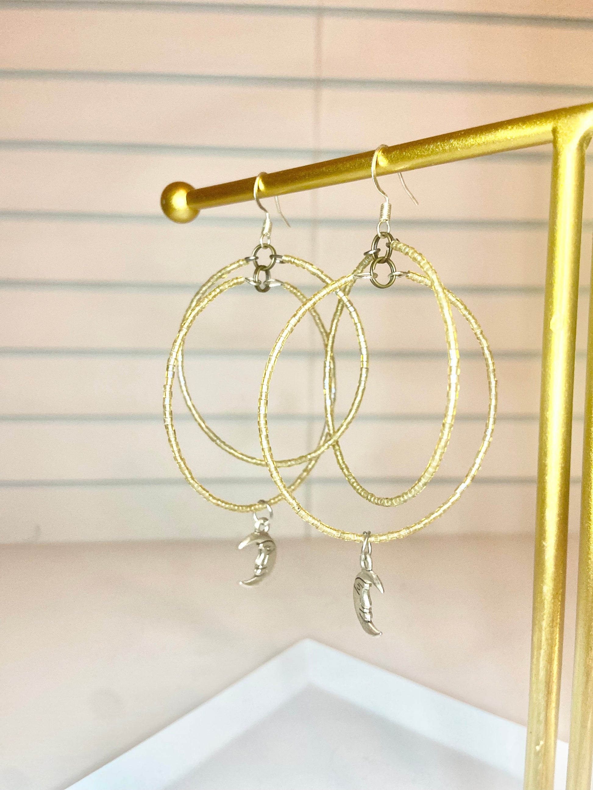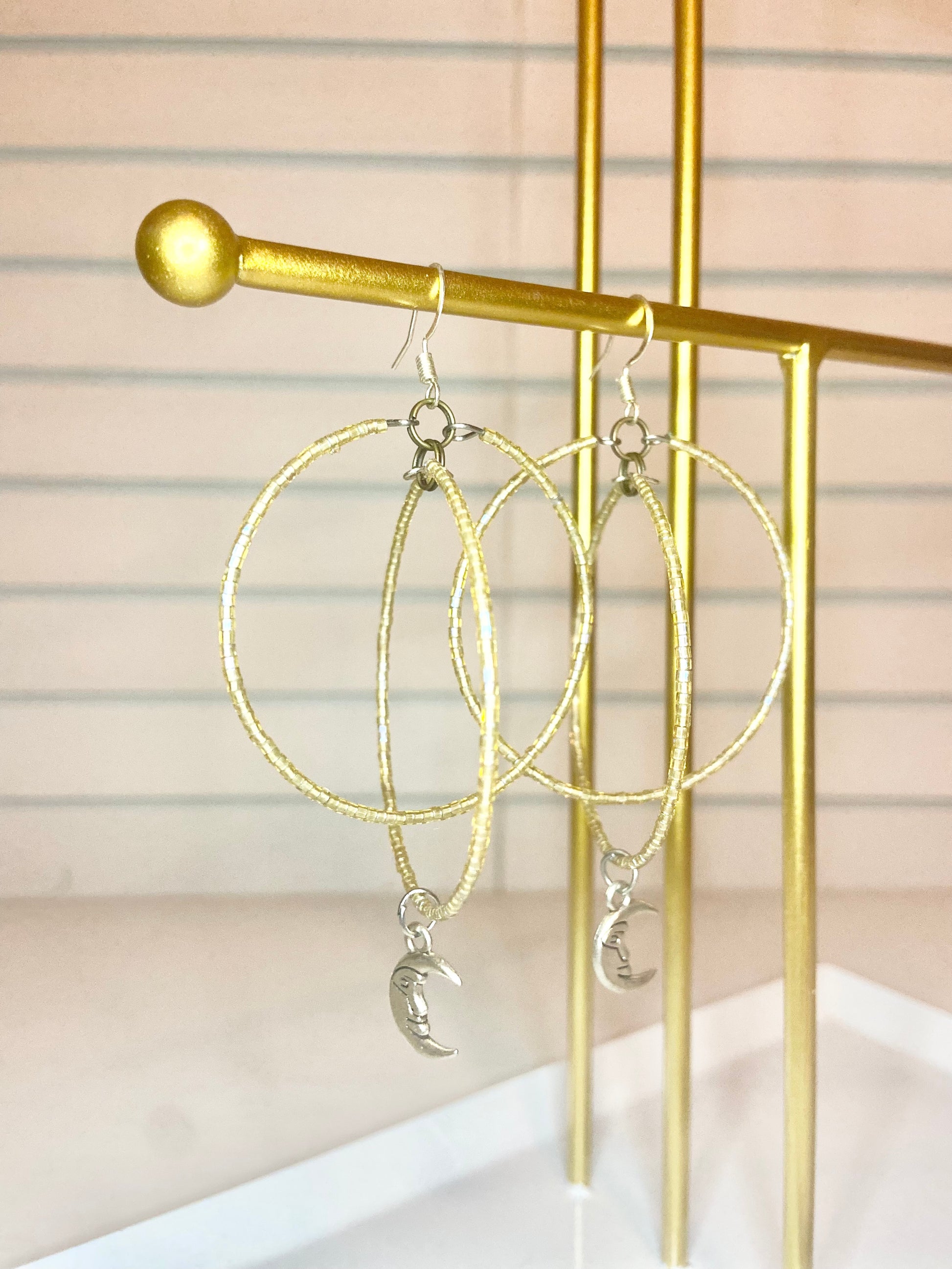 Medium size hoops made with small gold colored seed beads and a silver moon charm.