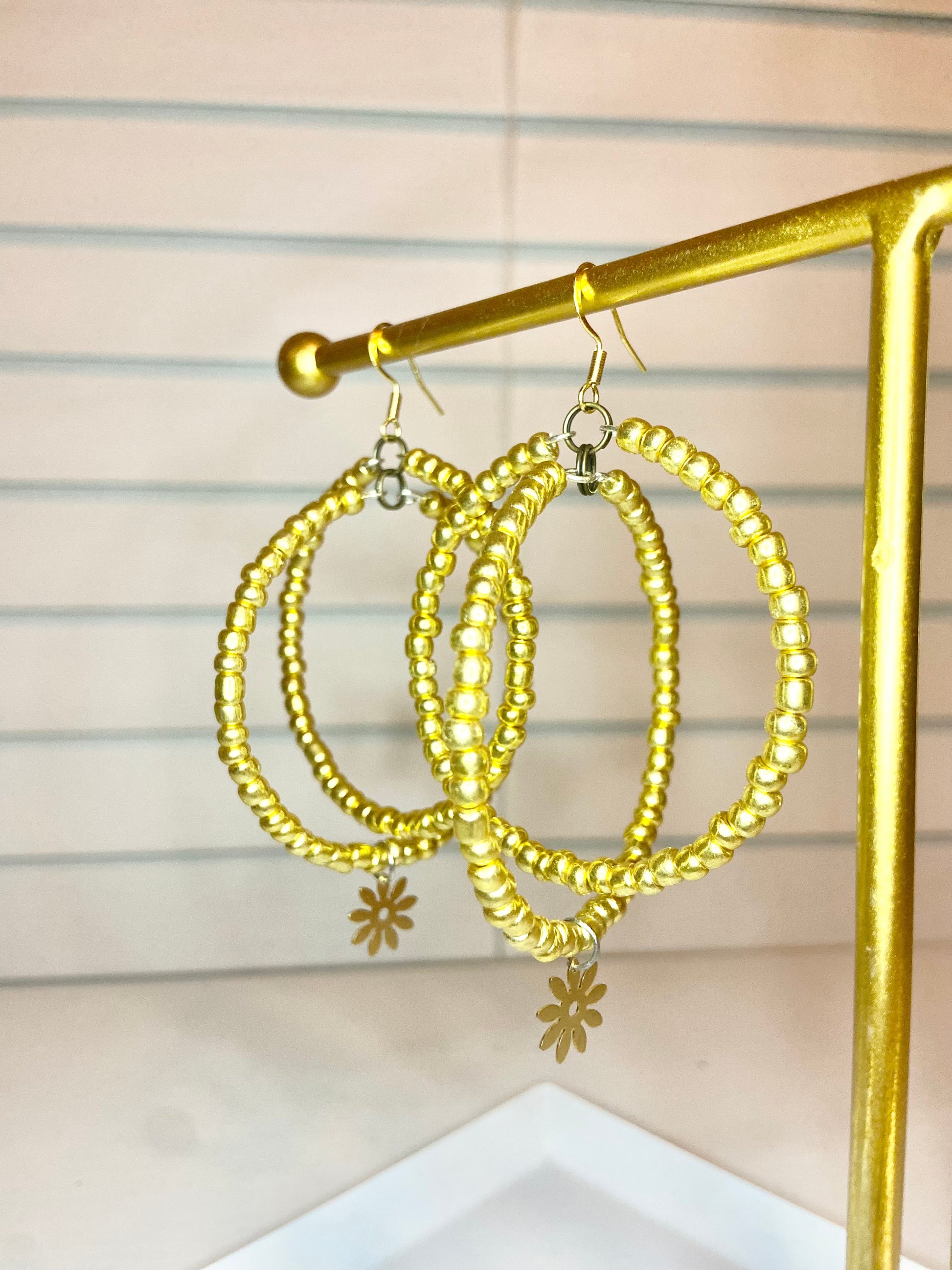 Medium hoops made with gold seed beads and a gold flower charm.