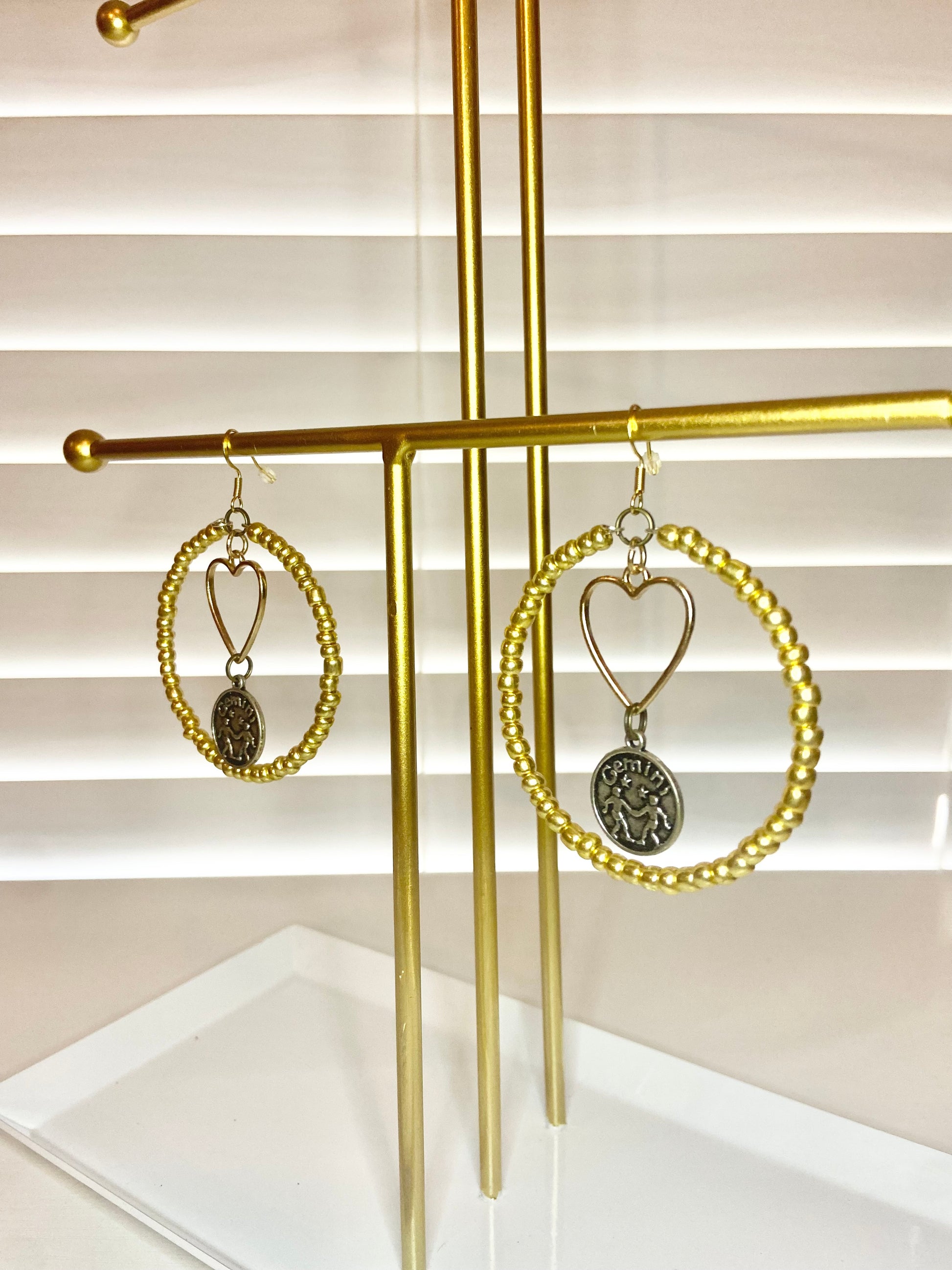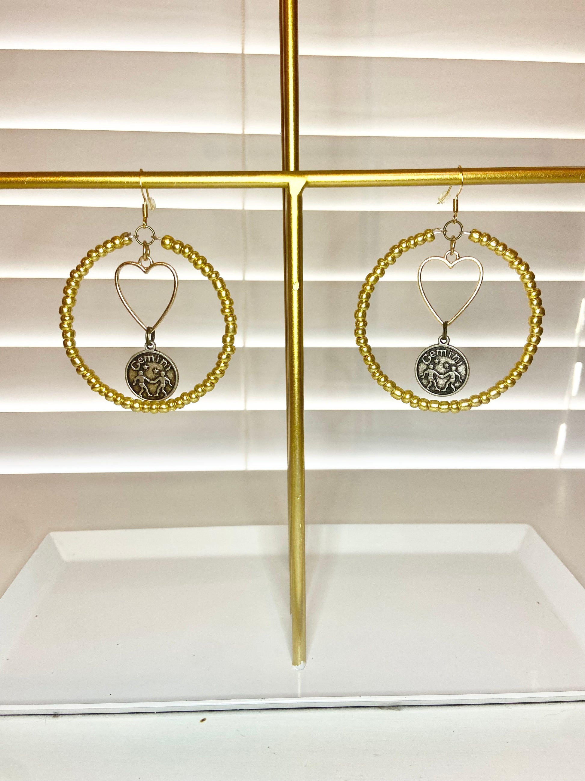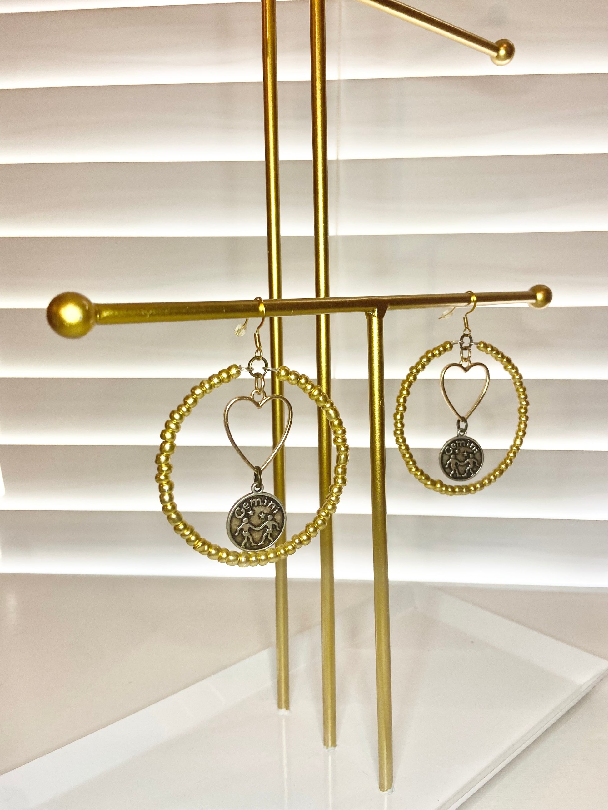 Medium hoops made with gold colored seed beads and a silver colored Gemini charm.