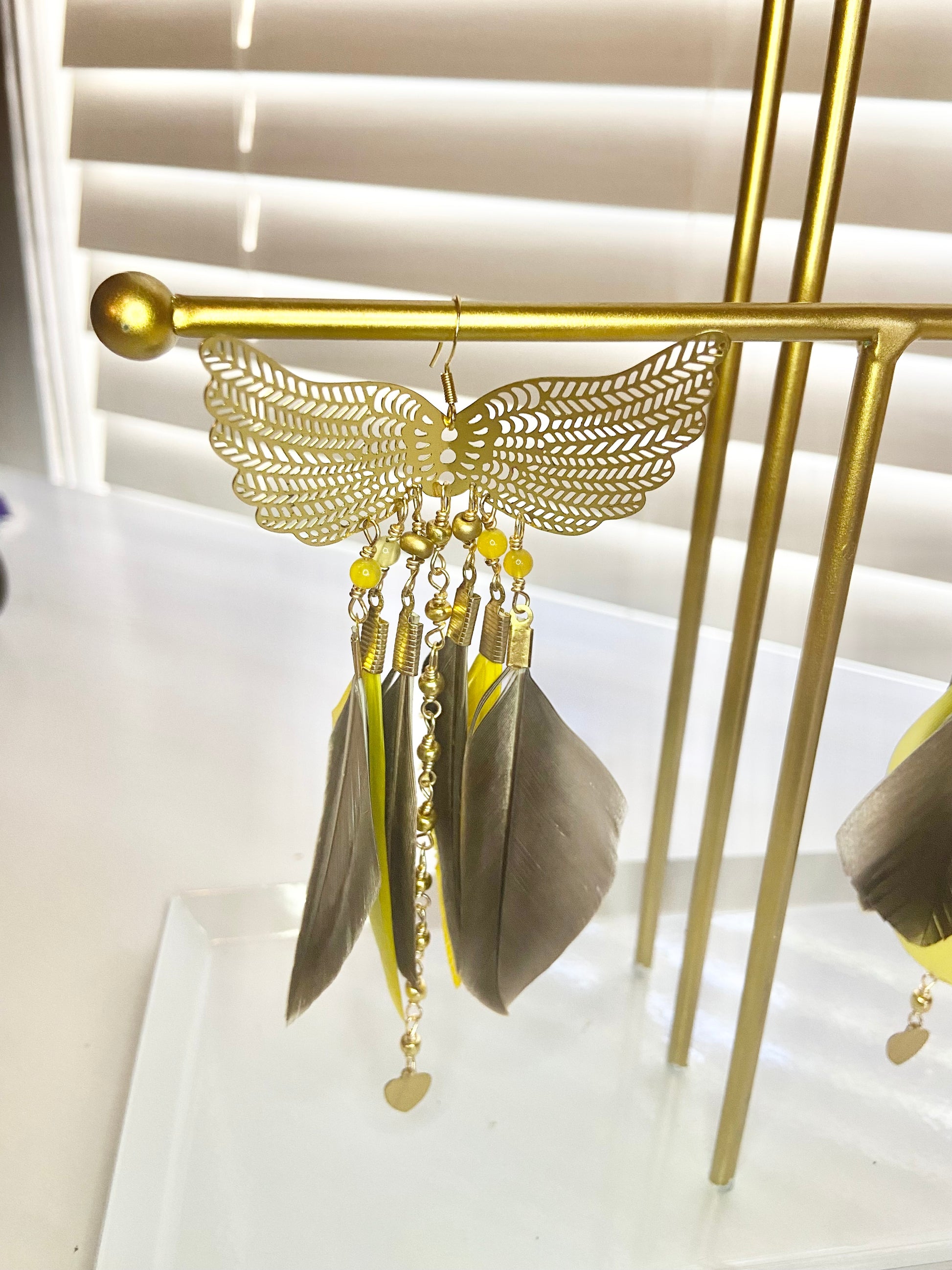 Earrings made with gold colored wings with seagull and yellow feathers, citrine beads and gold heart charms.