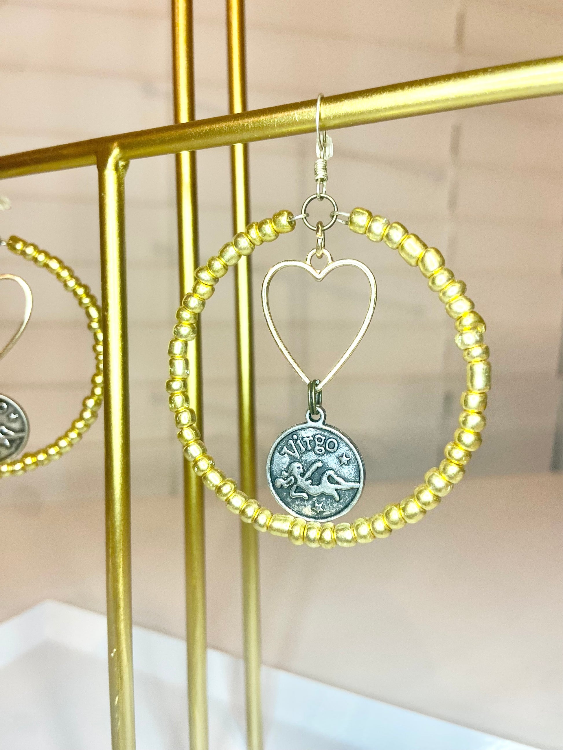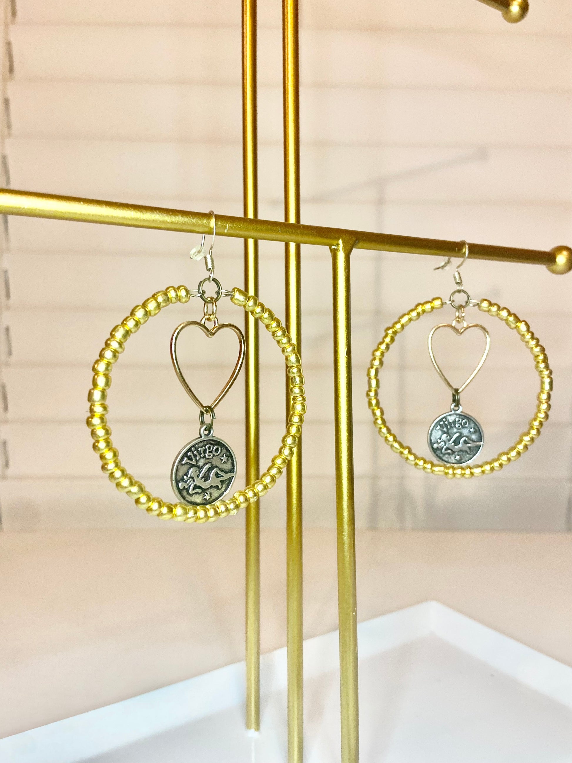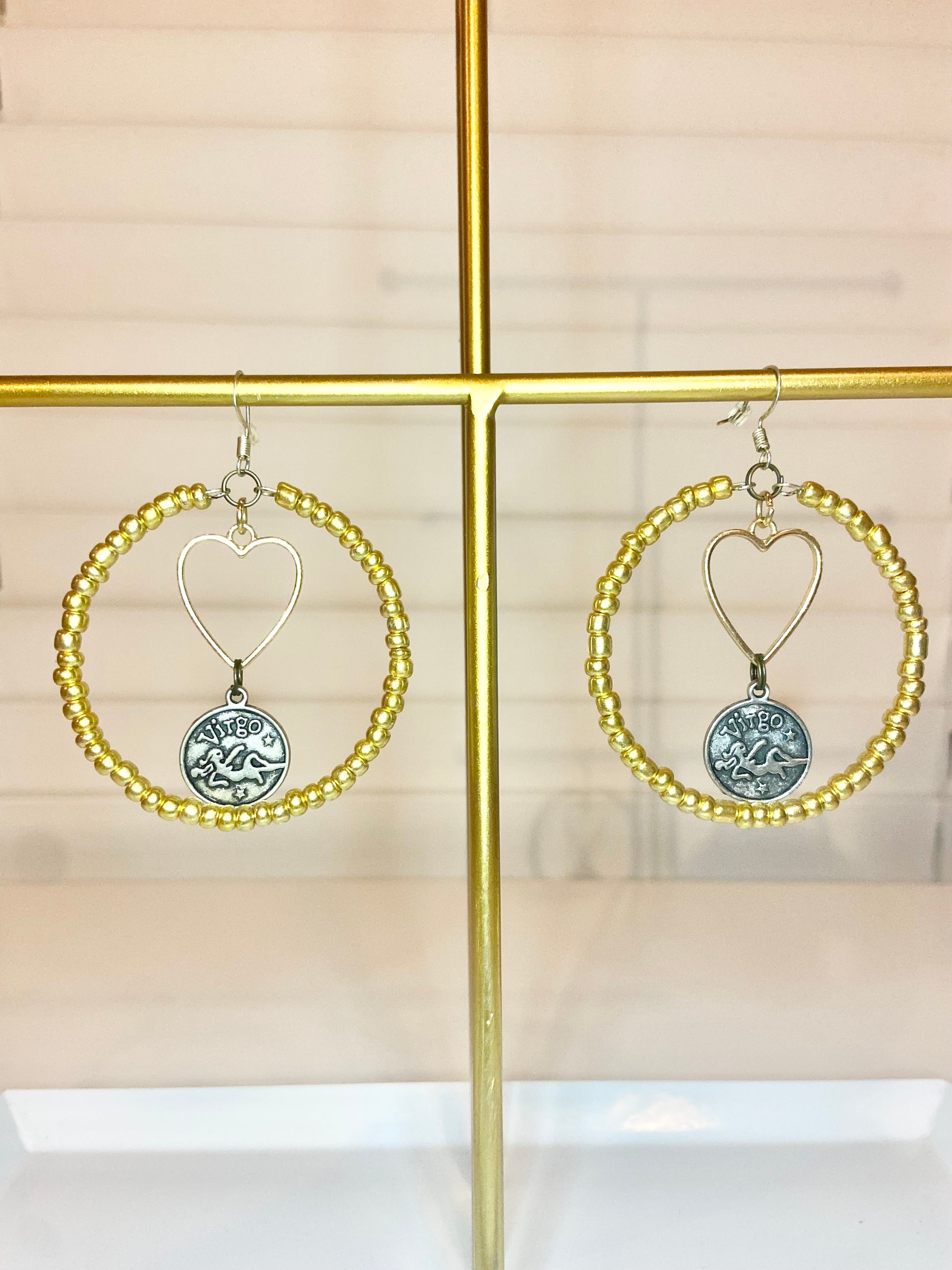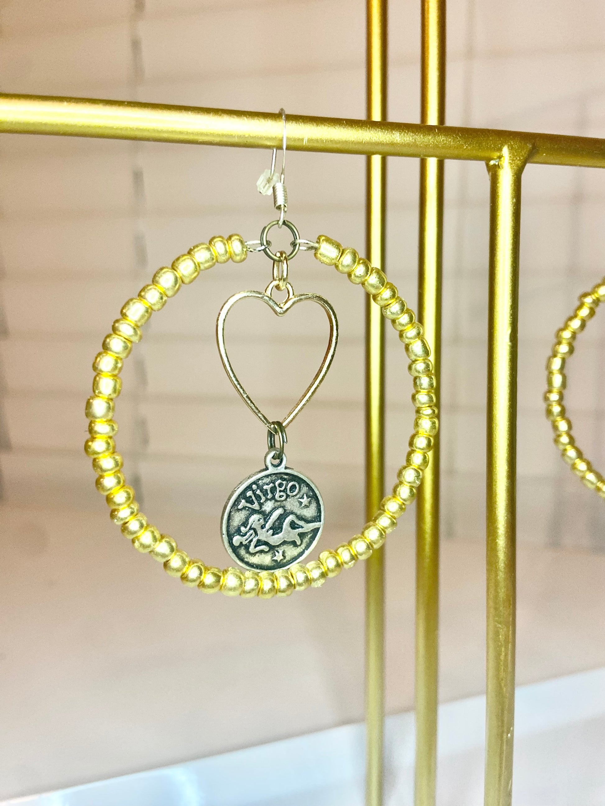 Medium hoops made with gold seed beads and a silver colored Virgo charm.