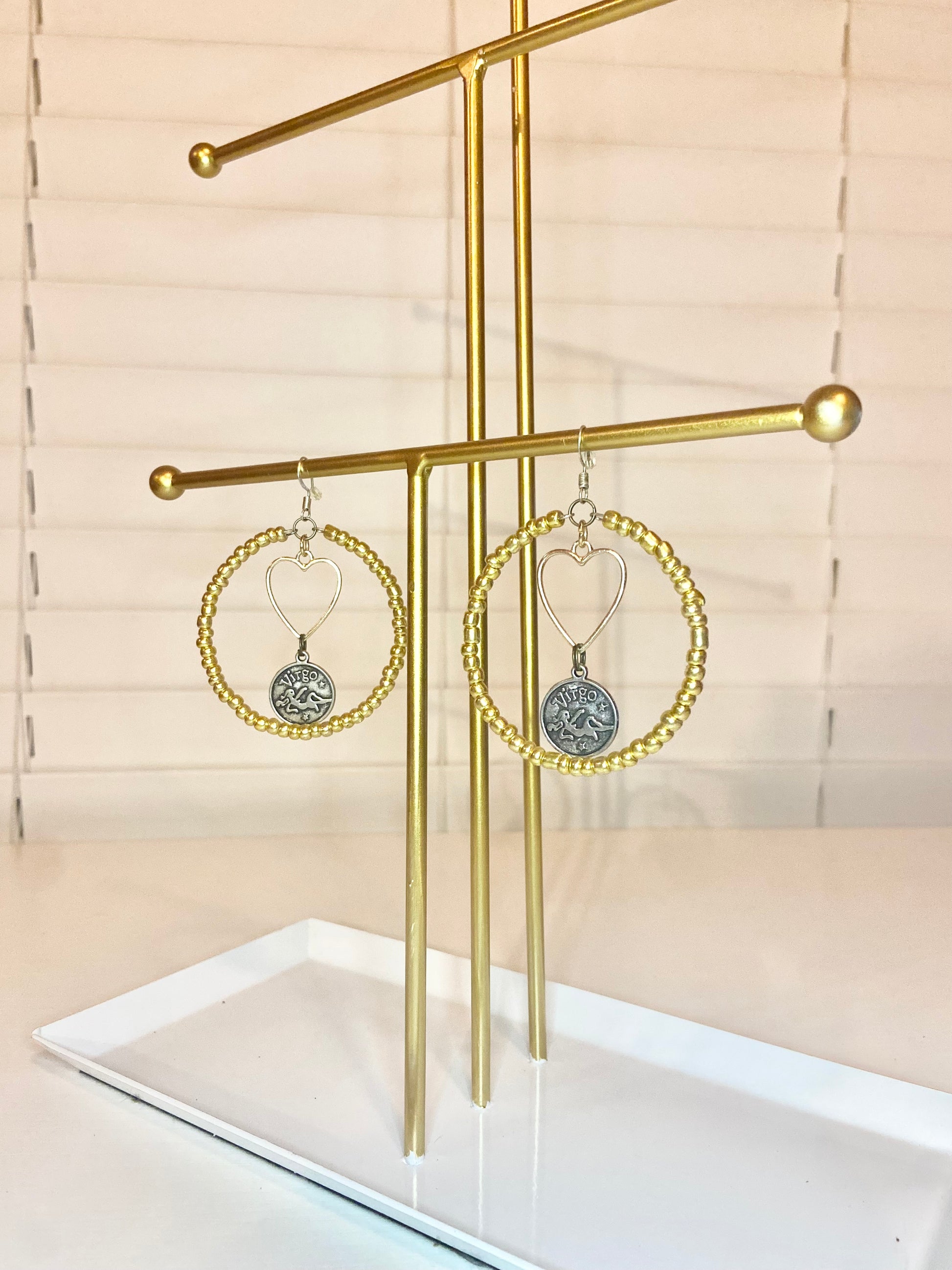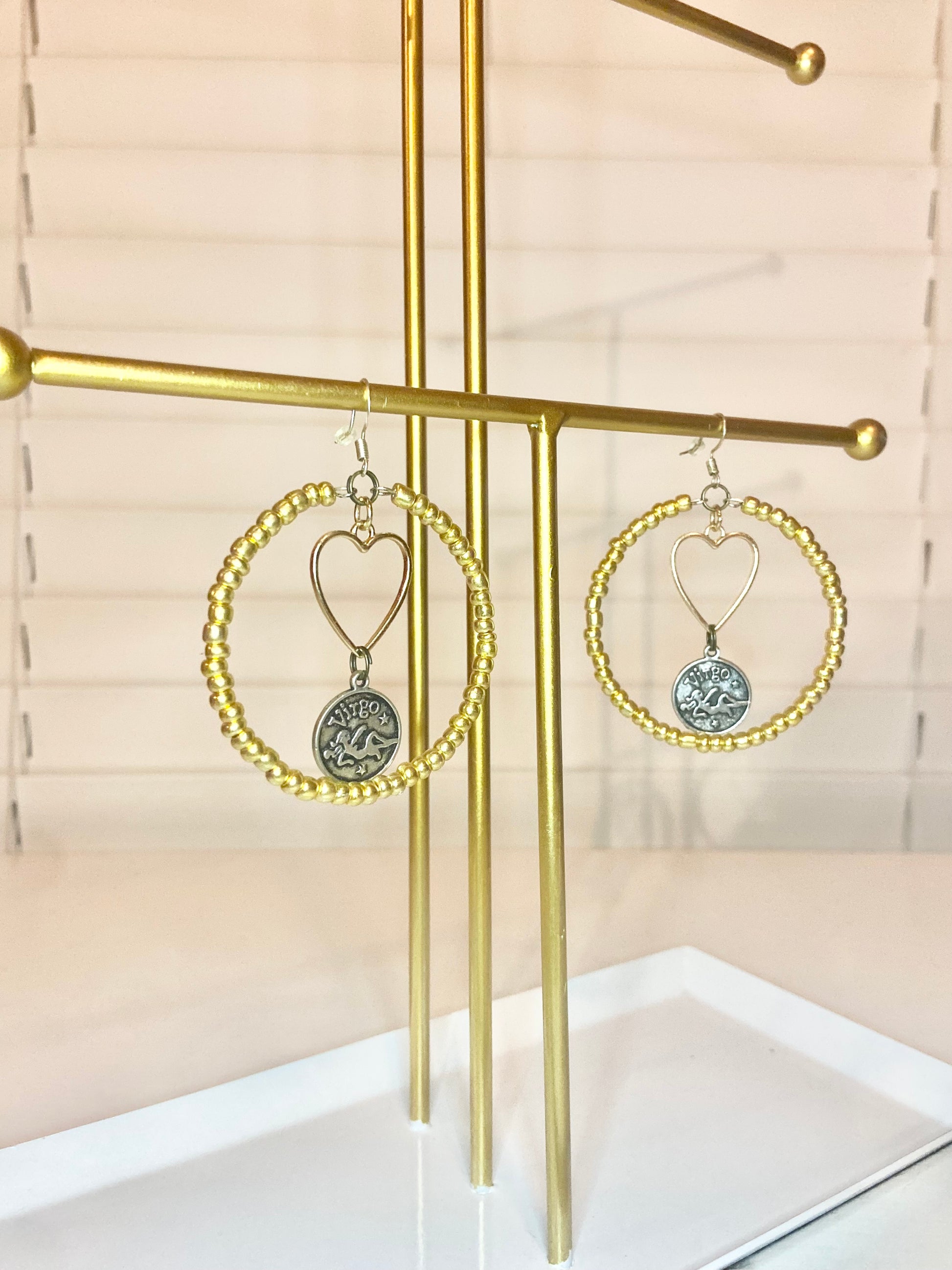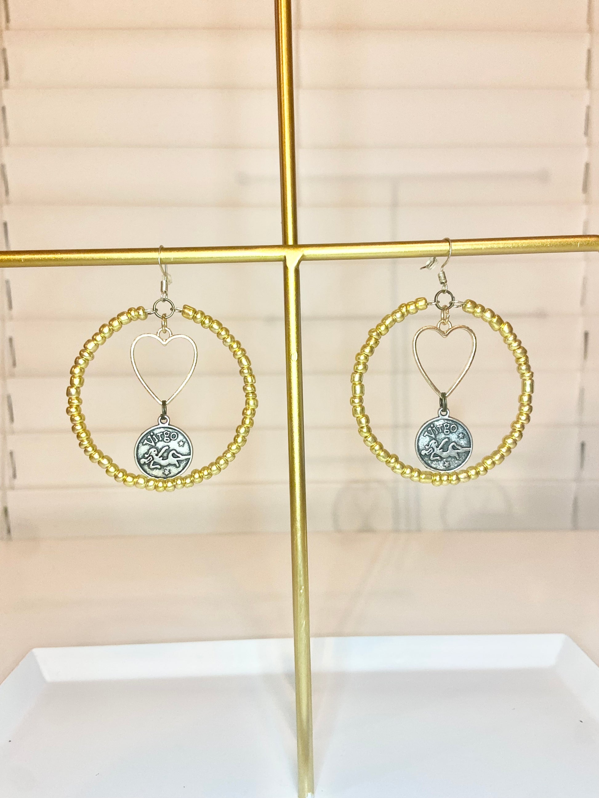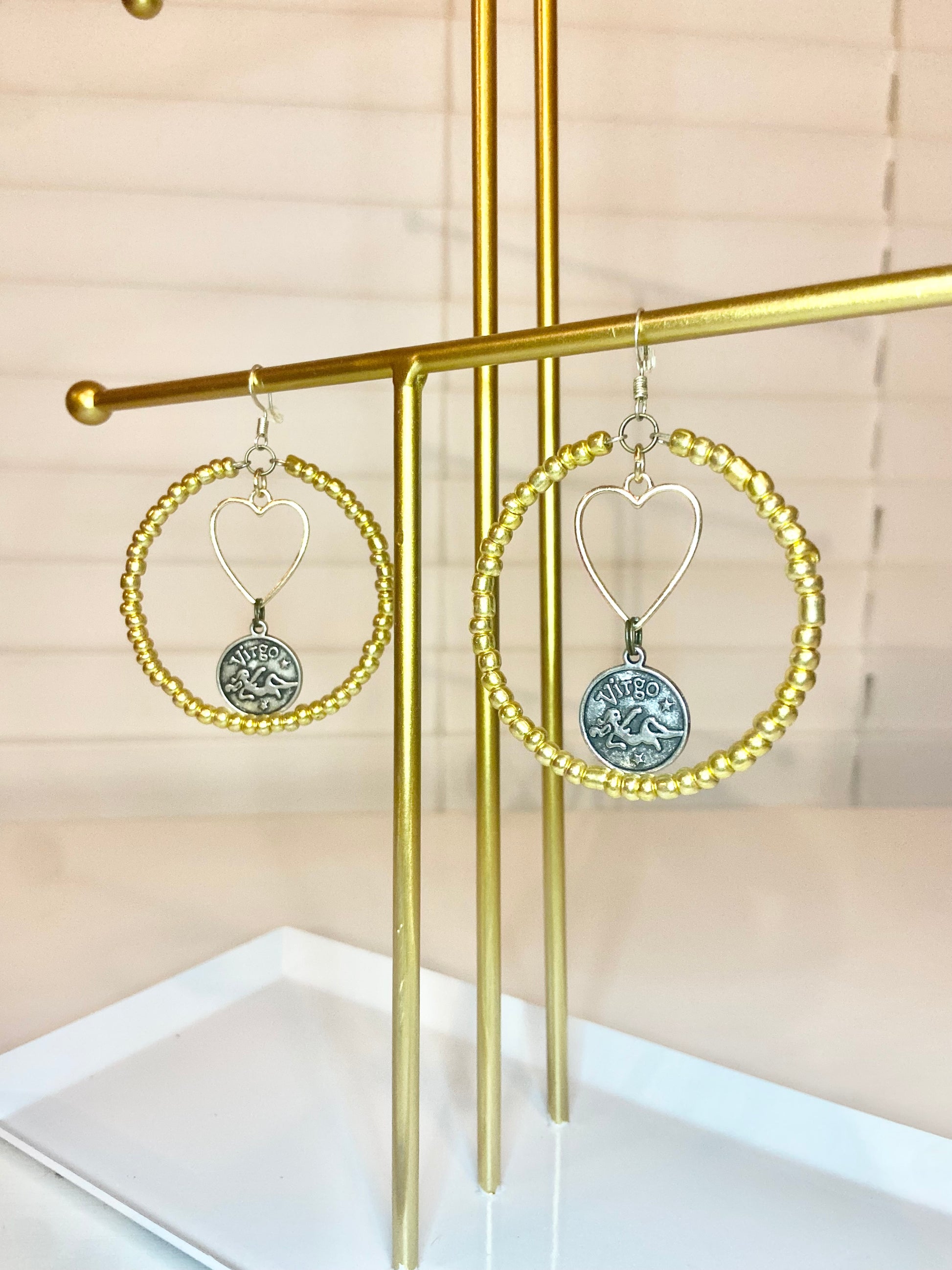 Medium hoops made with gold seed beads and a silver colored Virgo charm.