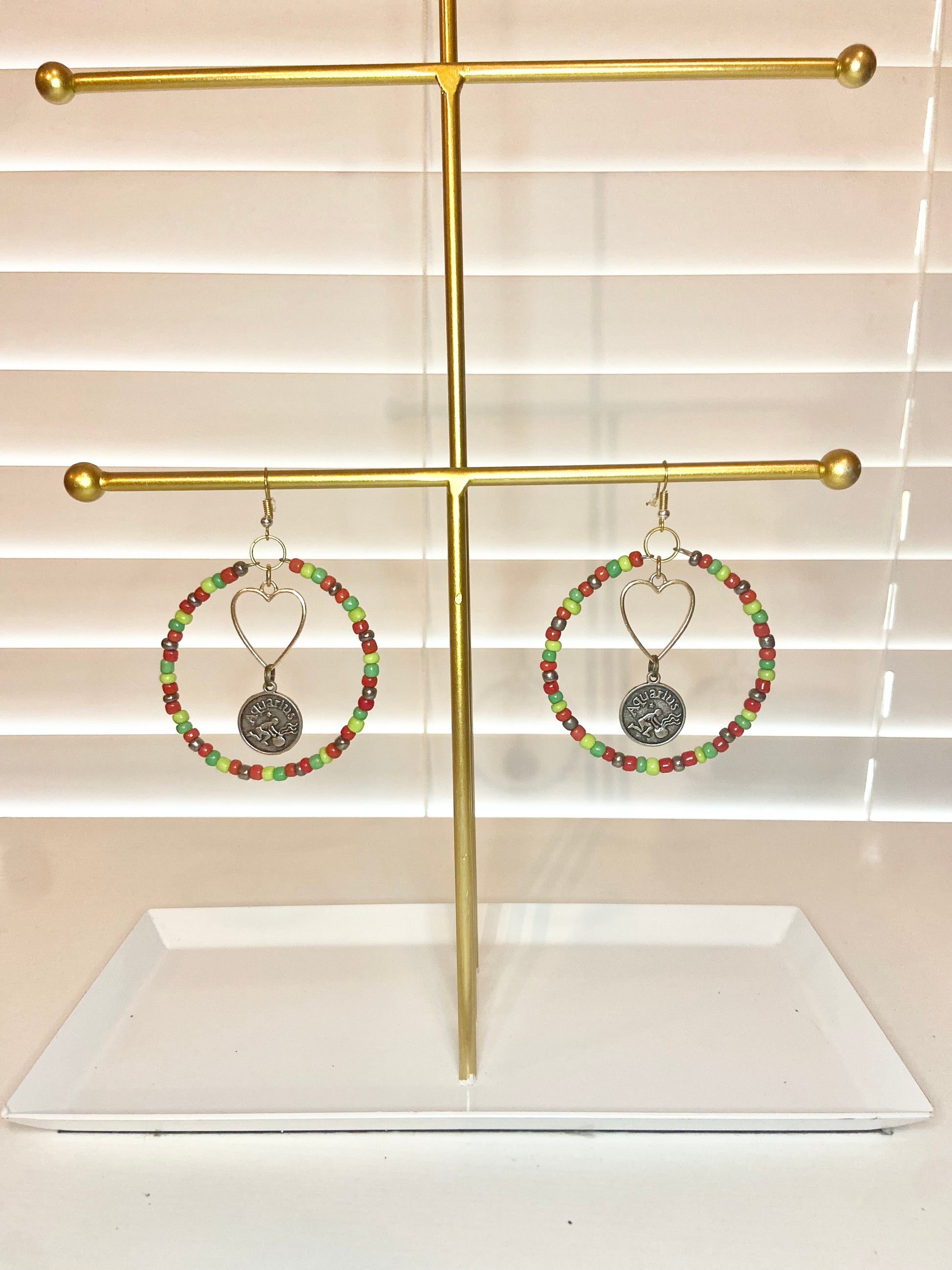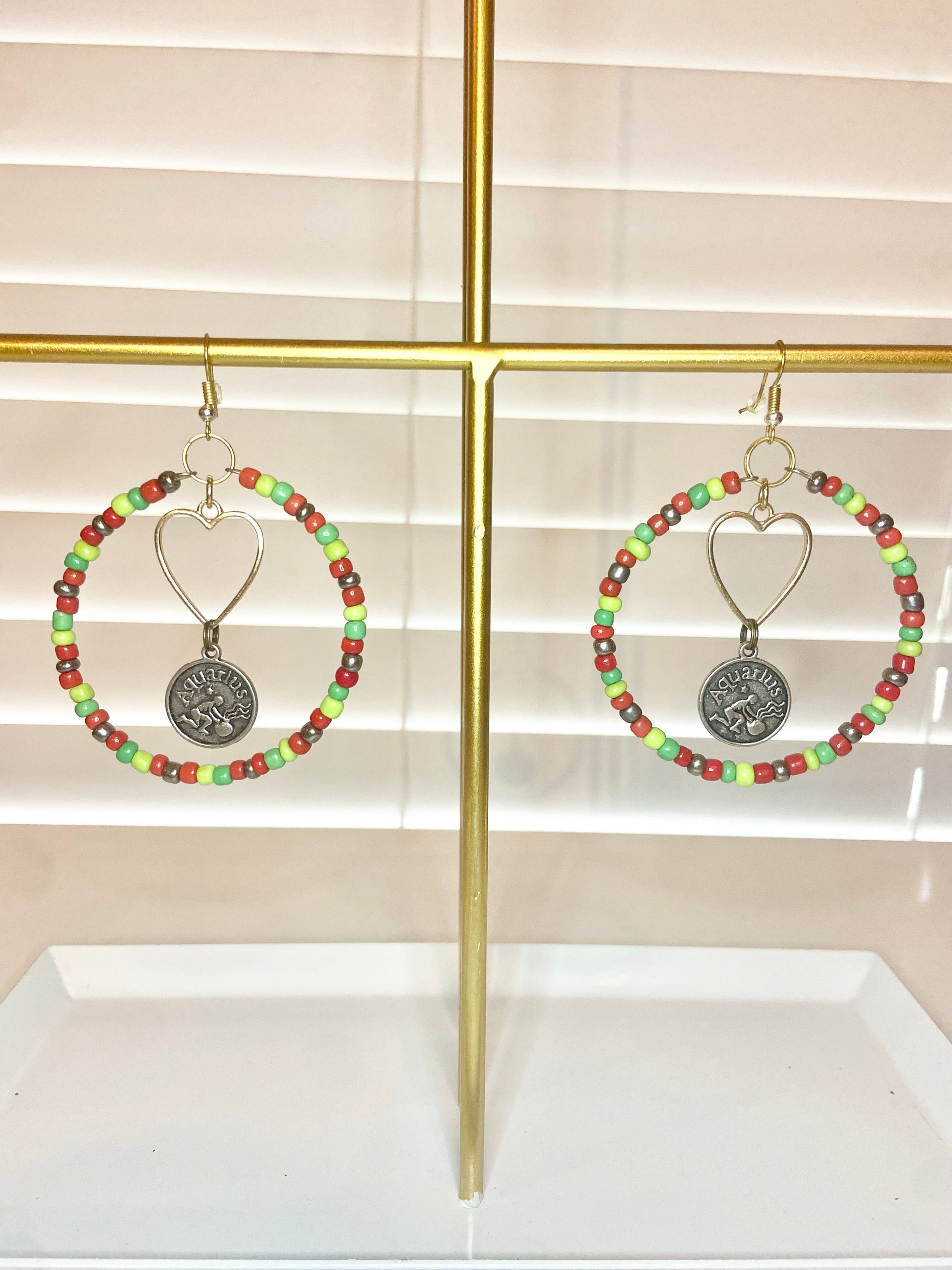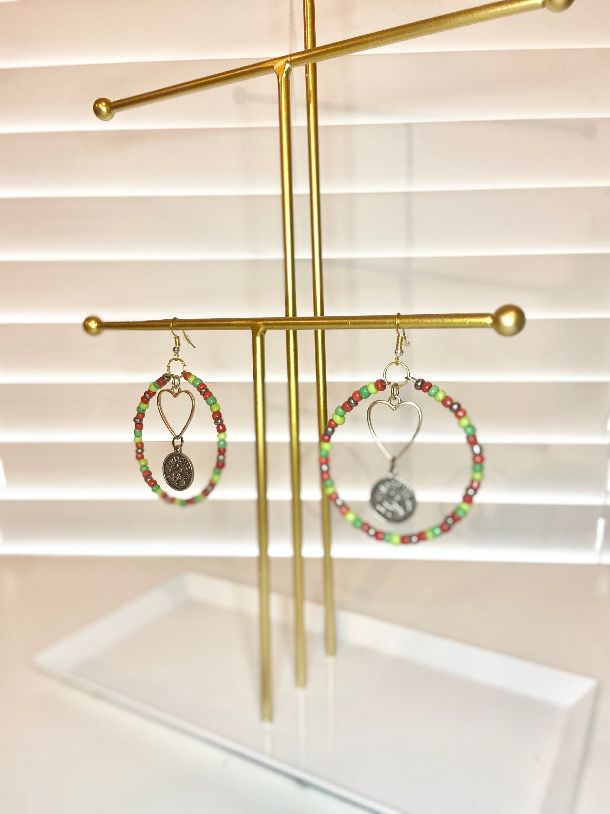 Medium size hoops made with red and green seed beads and silver colored aquarious charms.