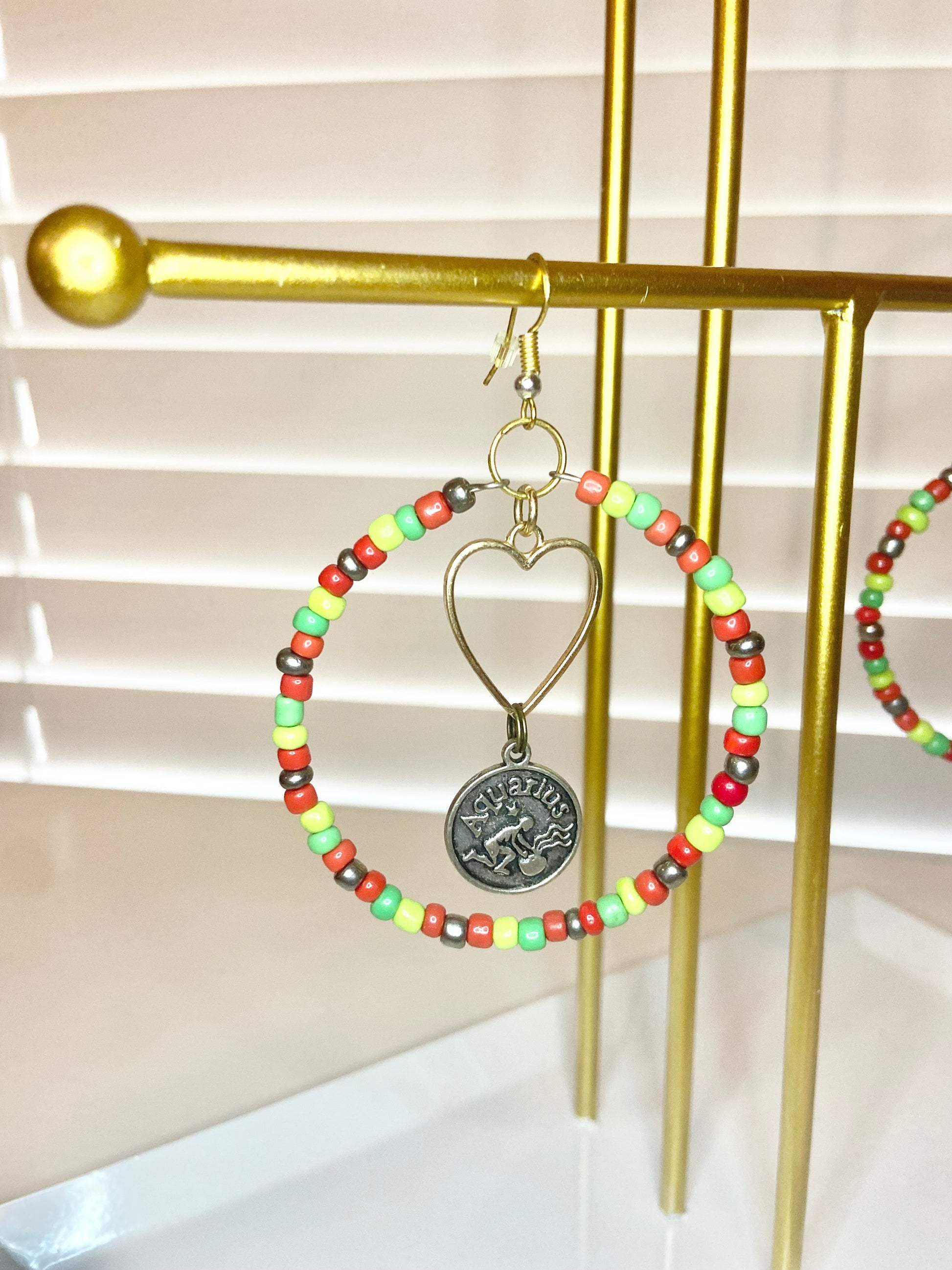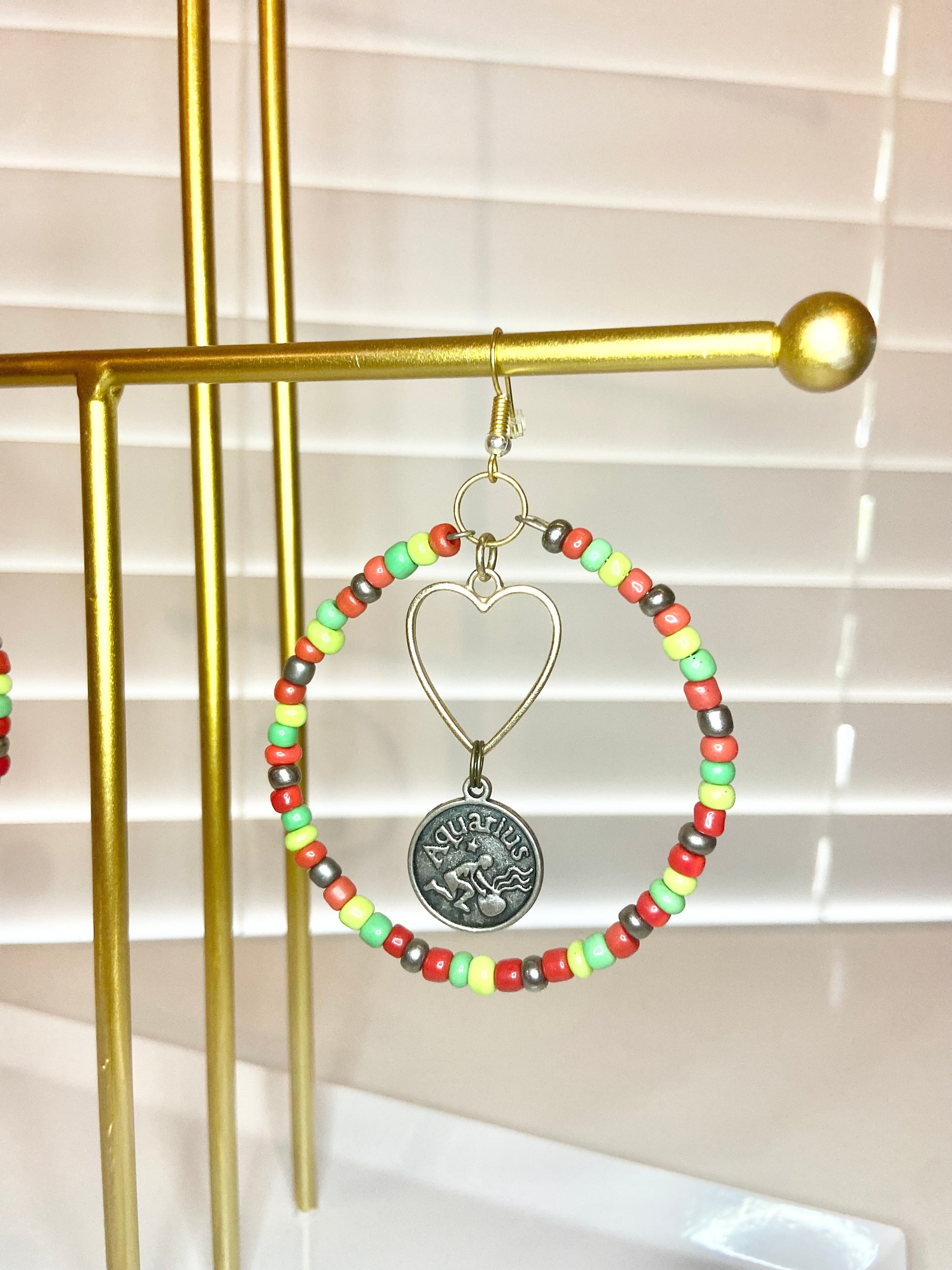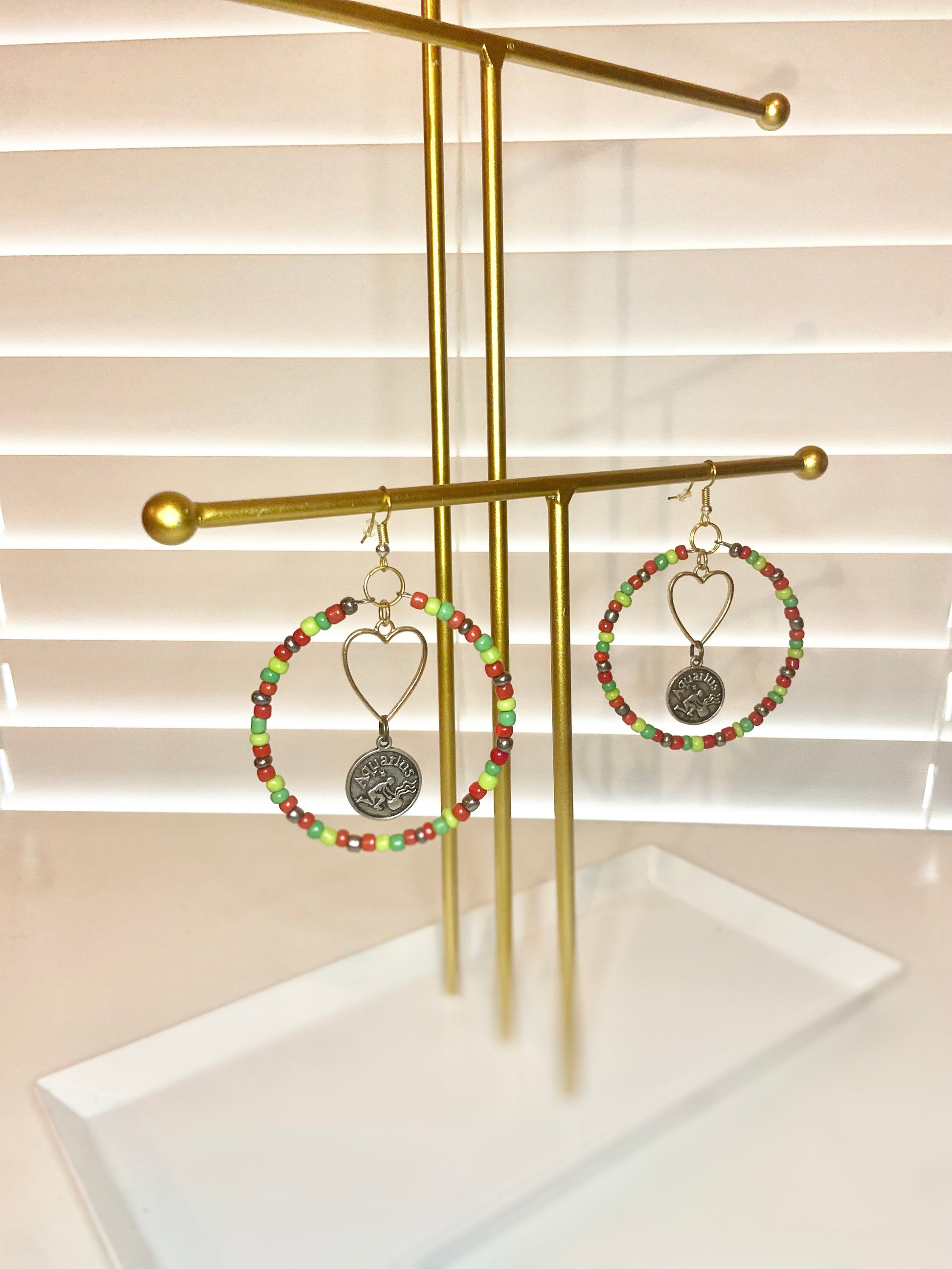 Medium size hoops made with red and green seed beads and silver colored aquarious charms.