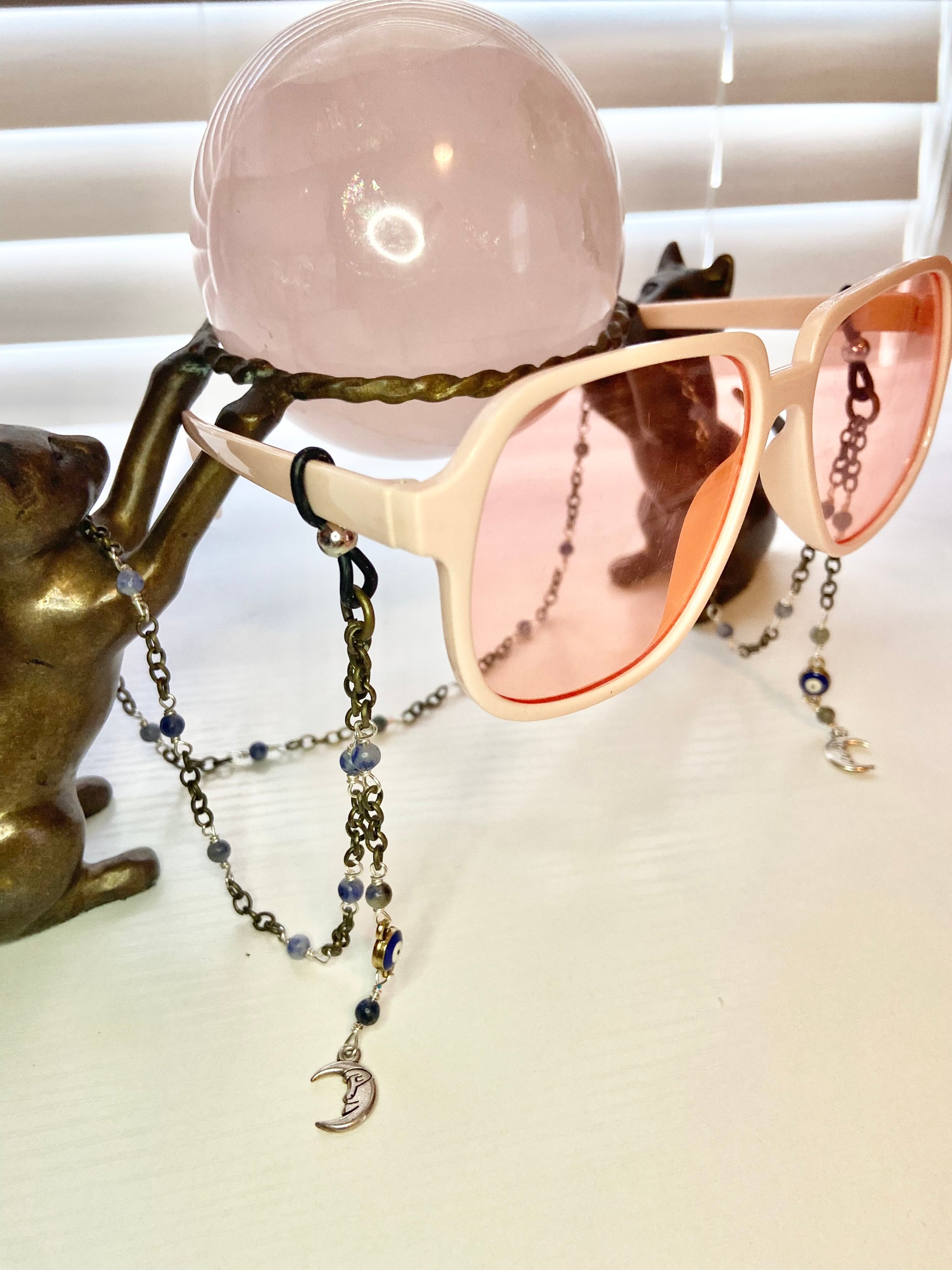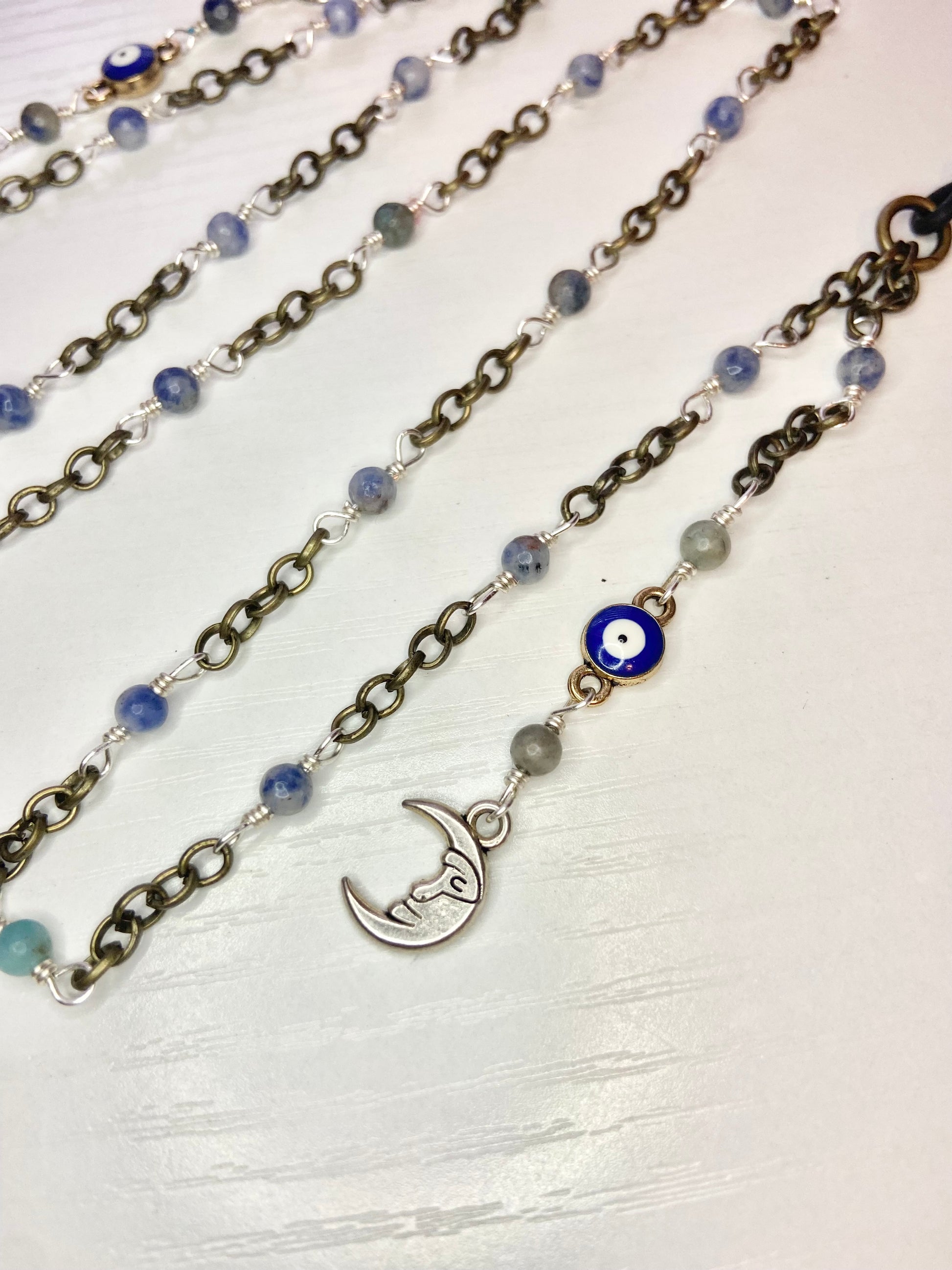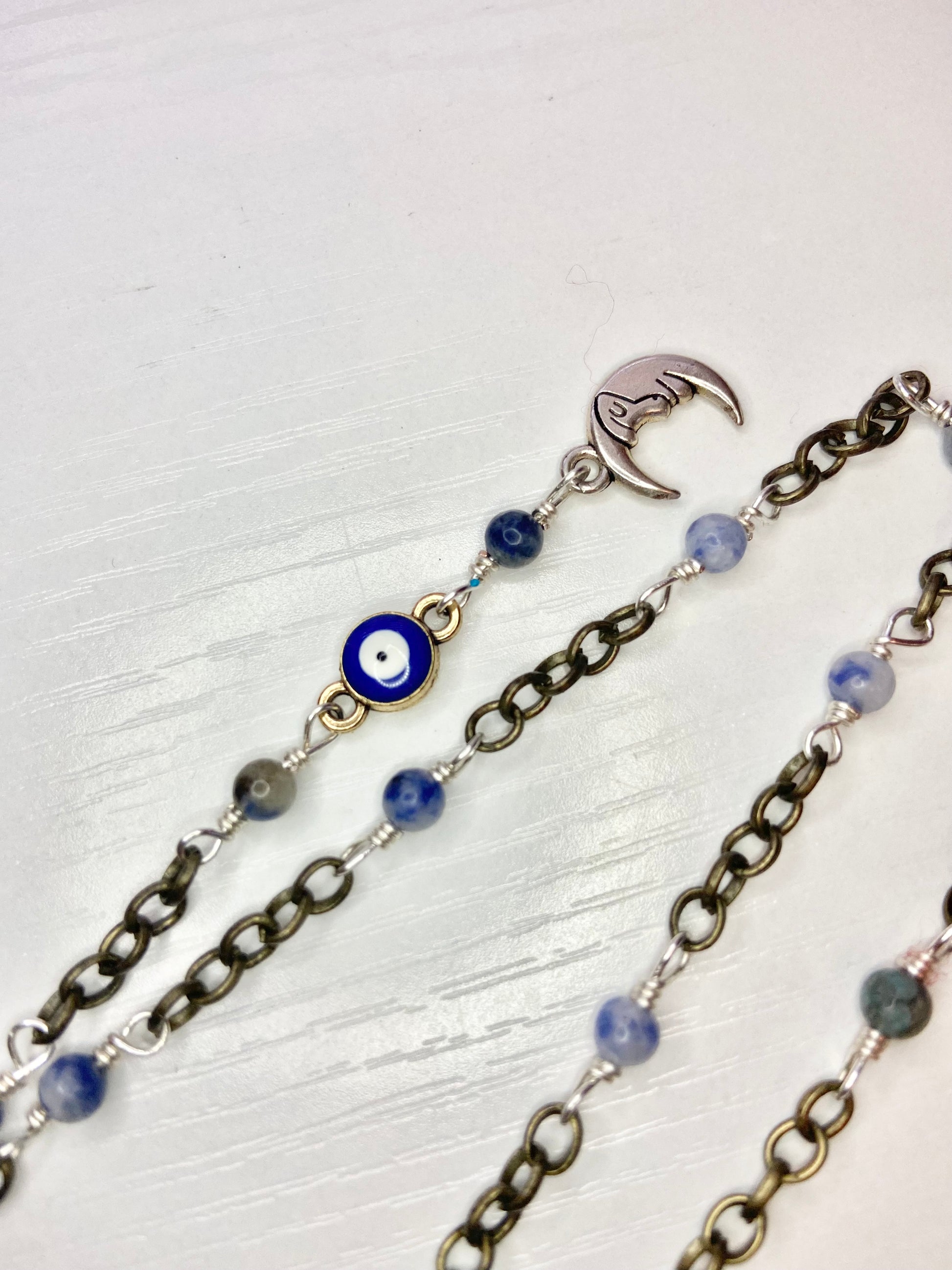 Lanyard made with lapis lazuli beads, gold wire, antique chain, evil eye beads and moon charms.