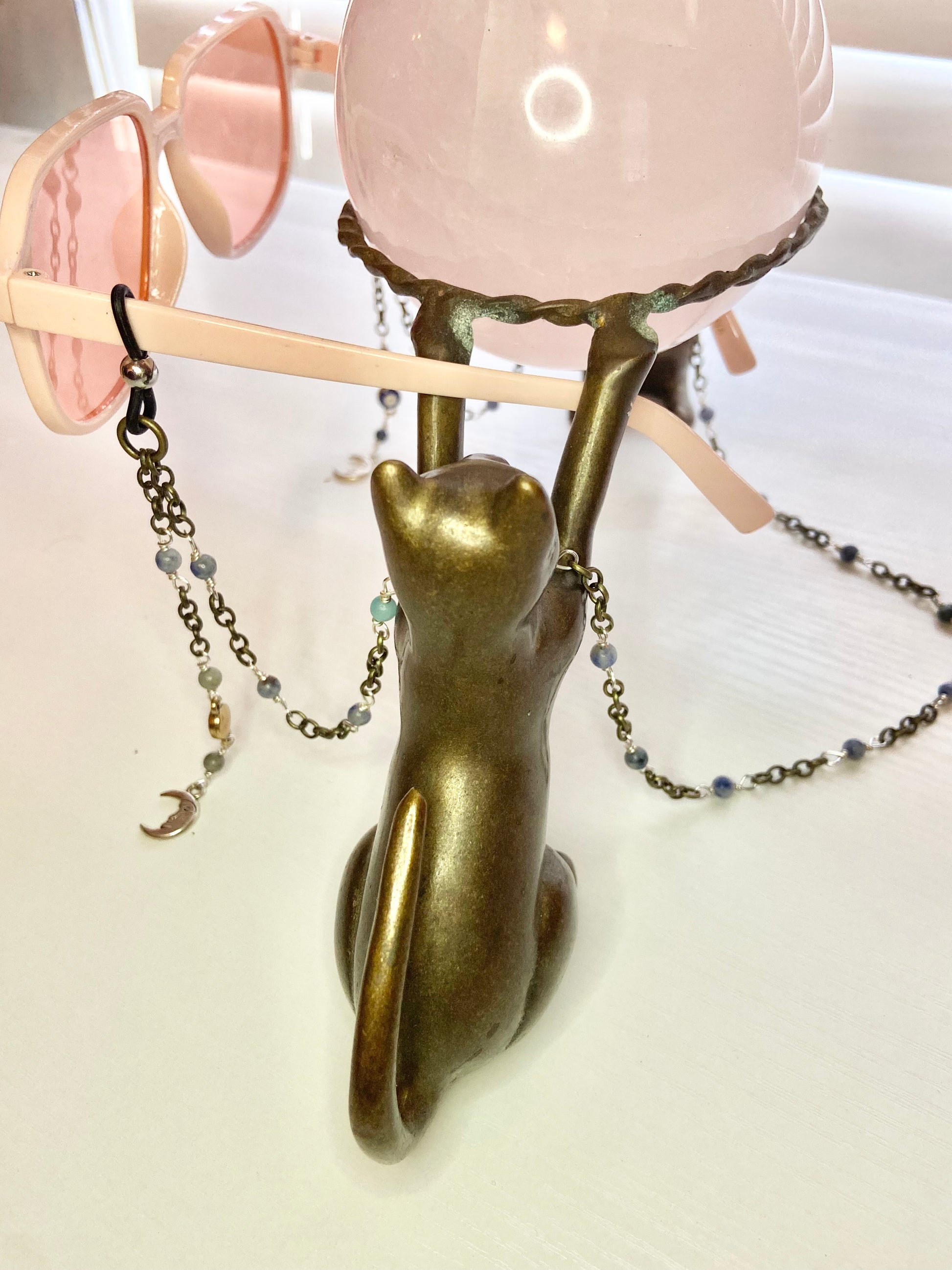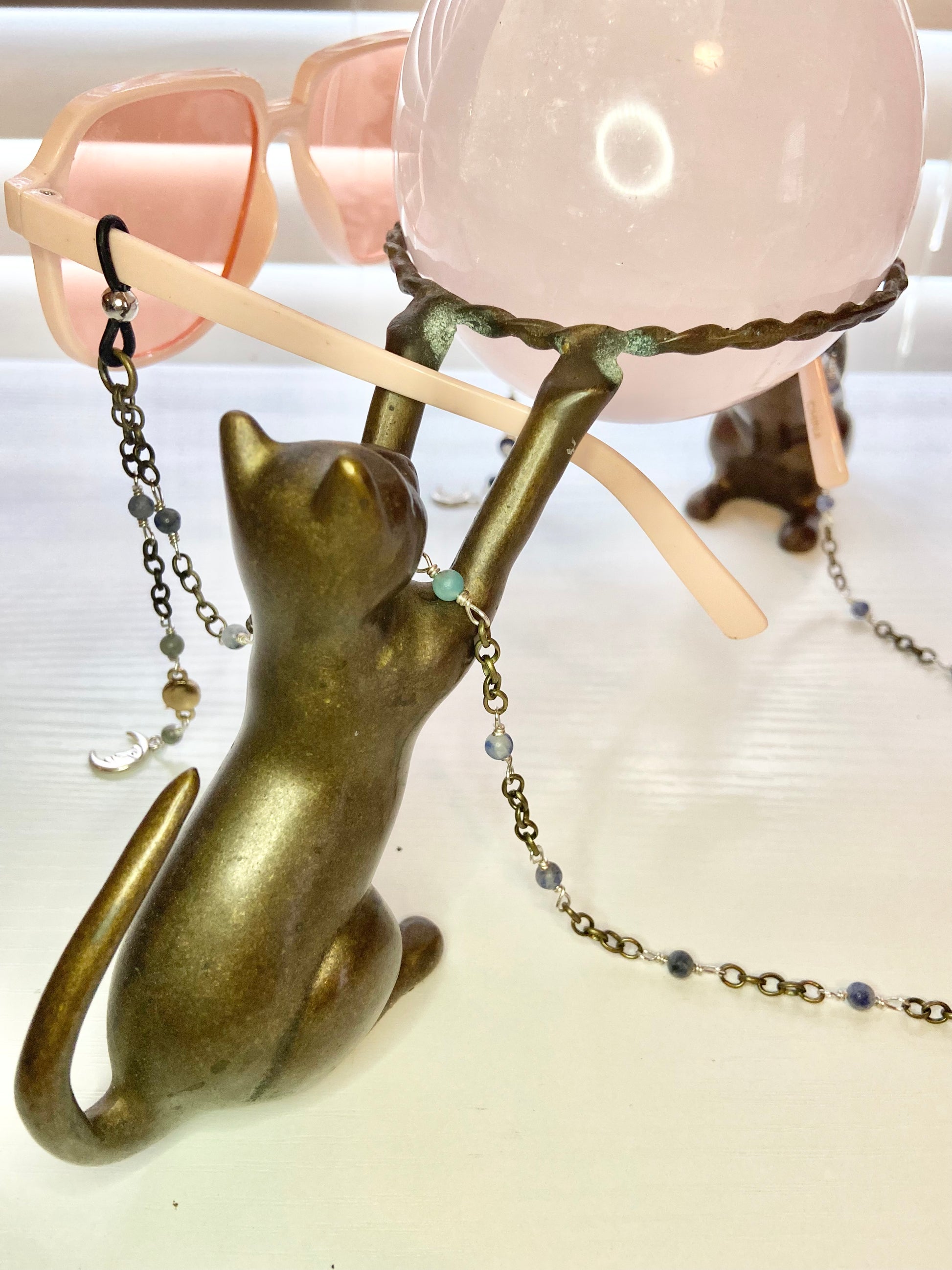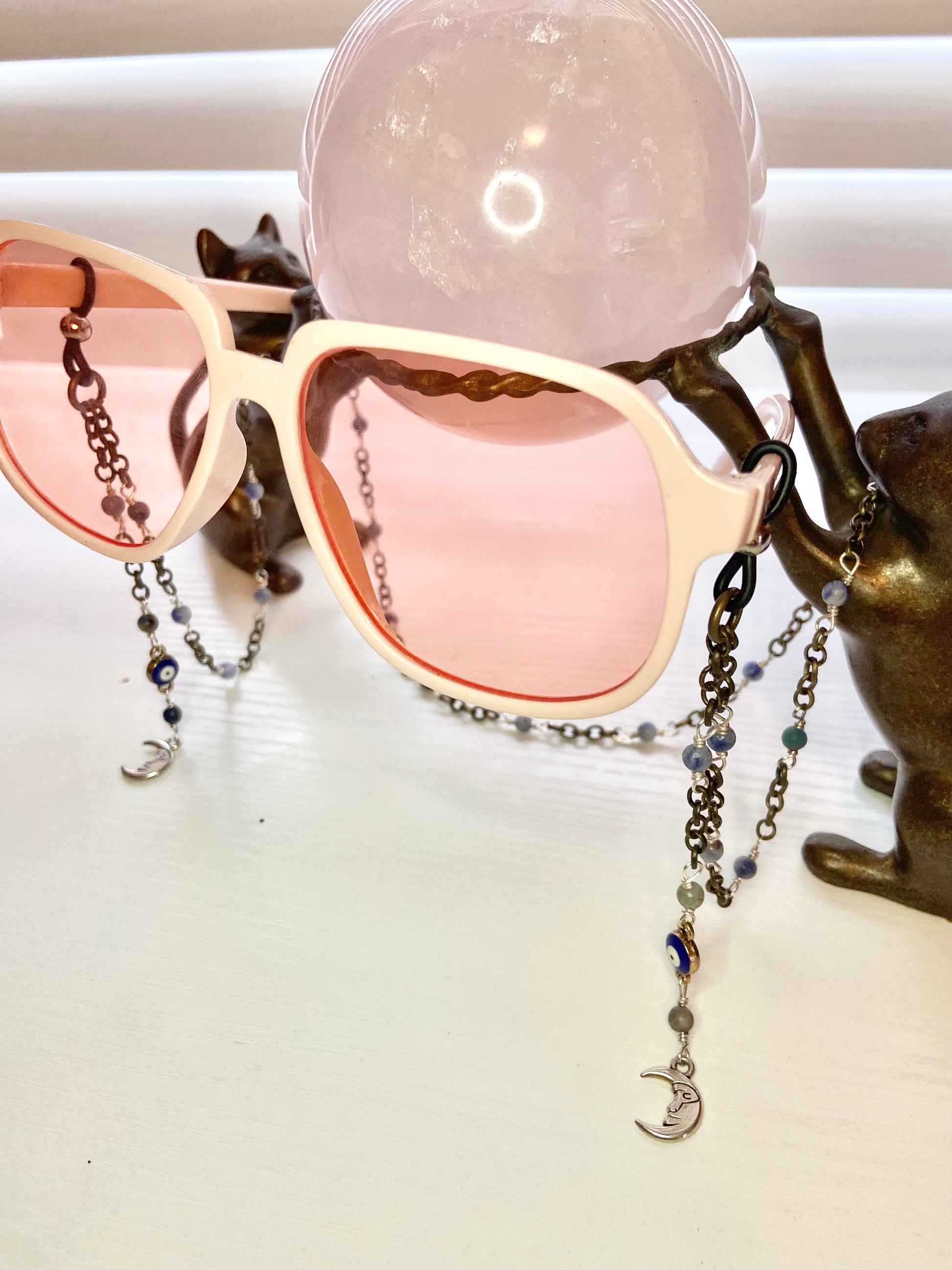 Lanyard made with lapis lazuli beads, gold wire, antique chain, evil eye beads and moon charms.