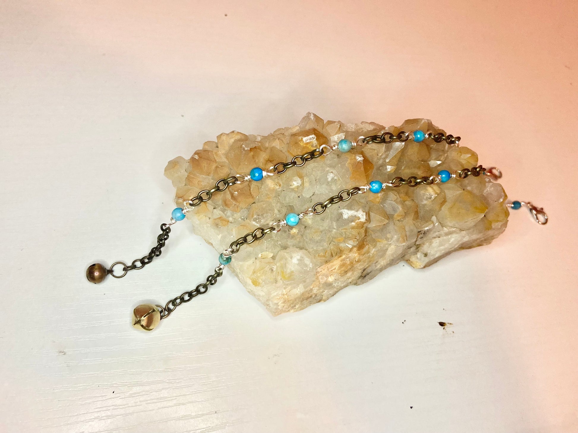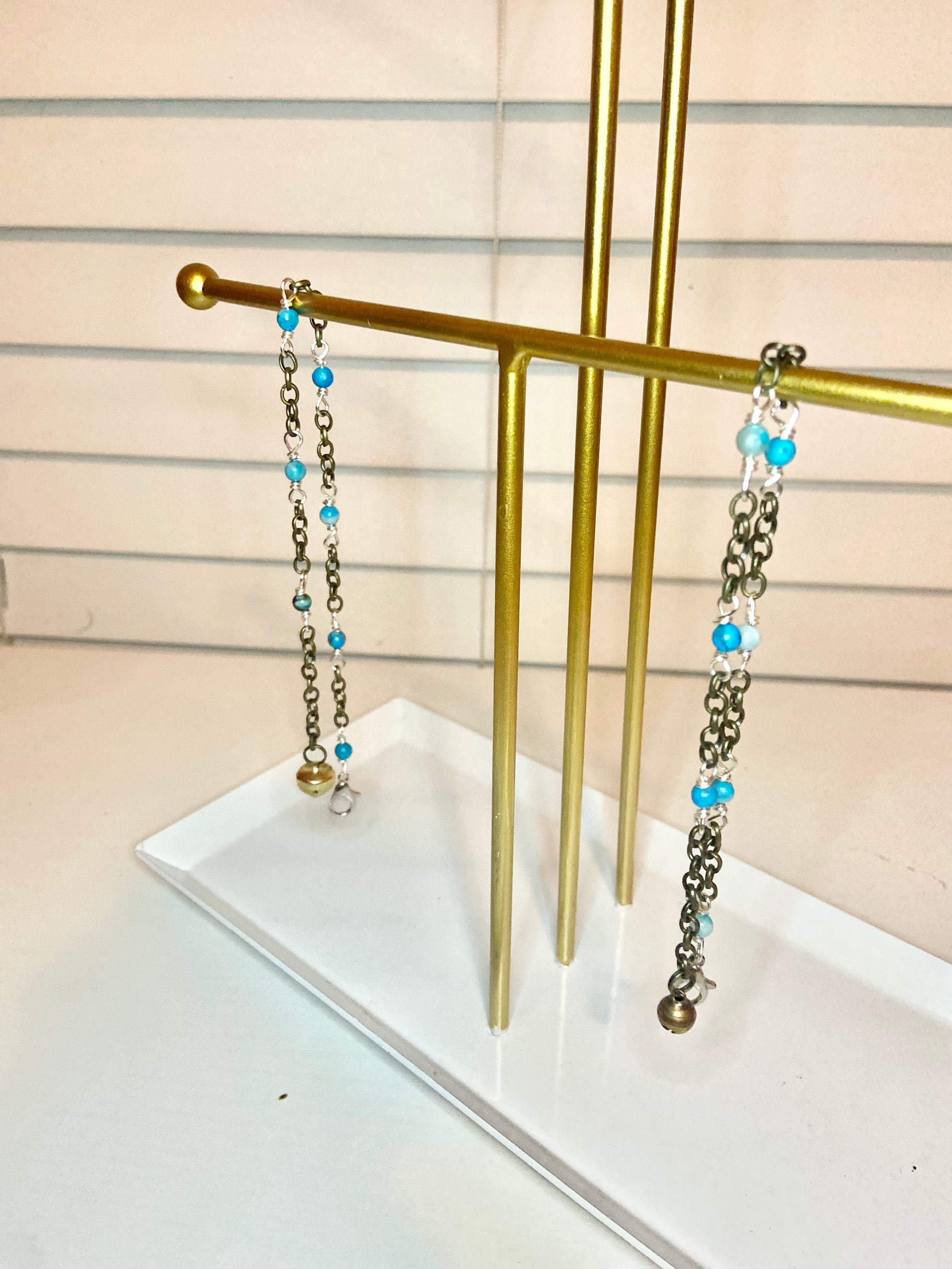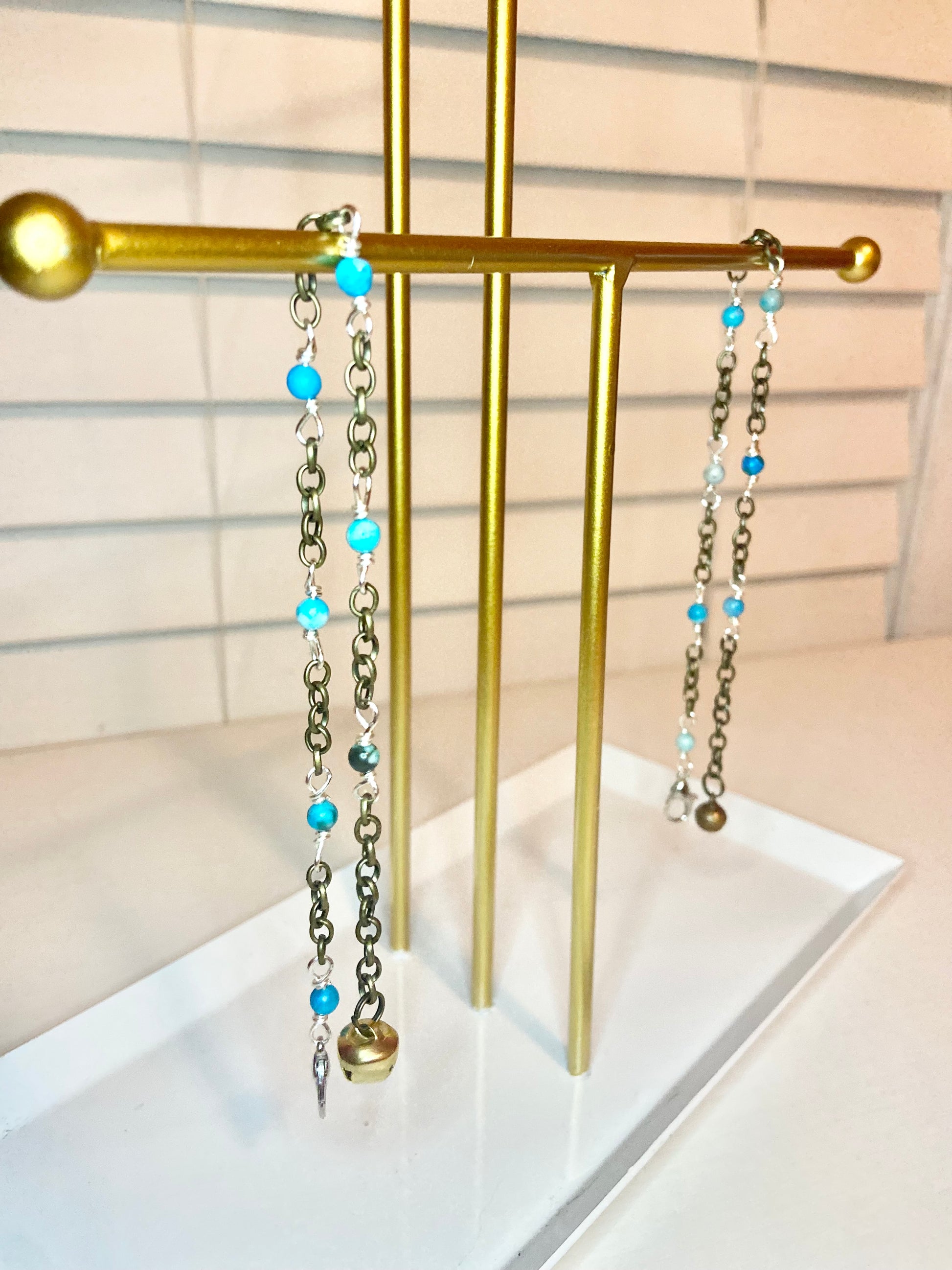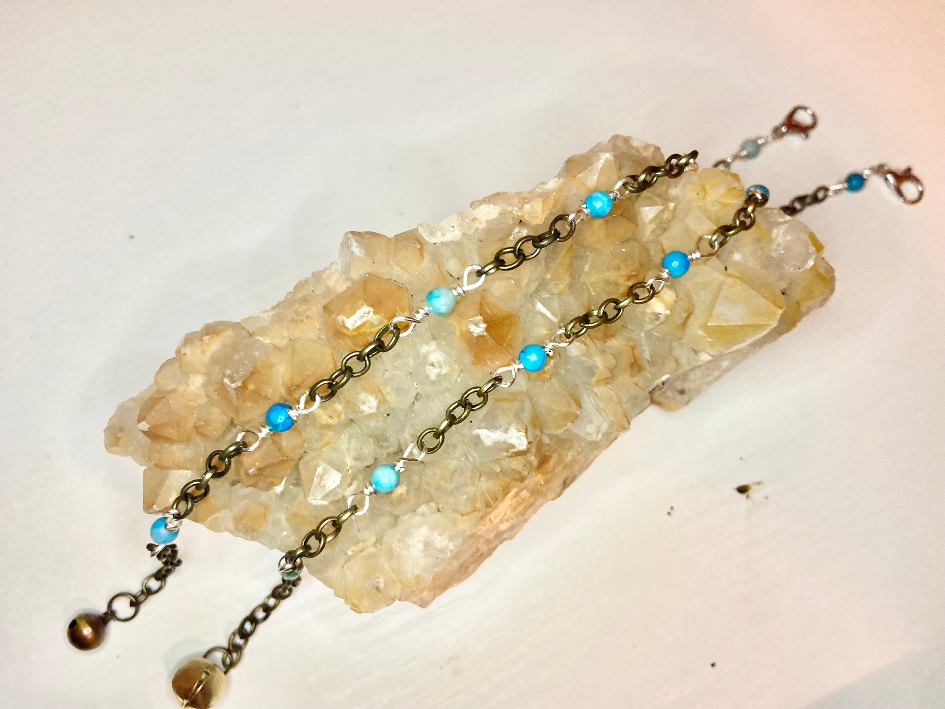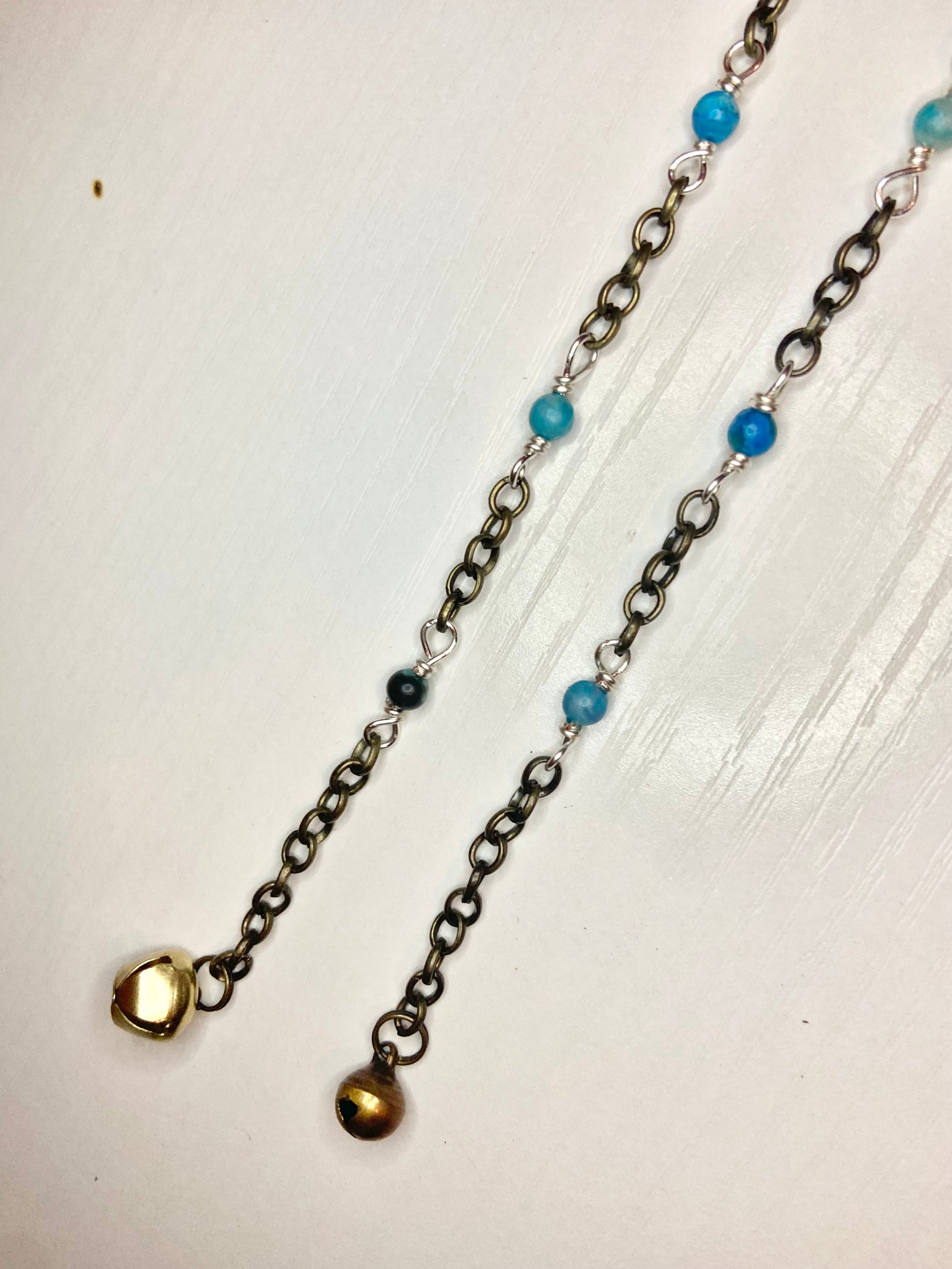 Matching anklet and cat collar made with blue lace agate beads, silver wire and gold bells.