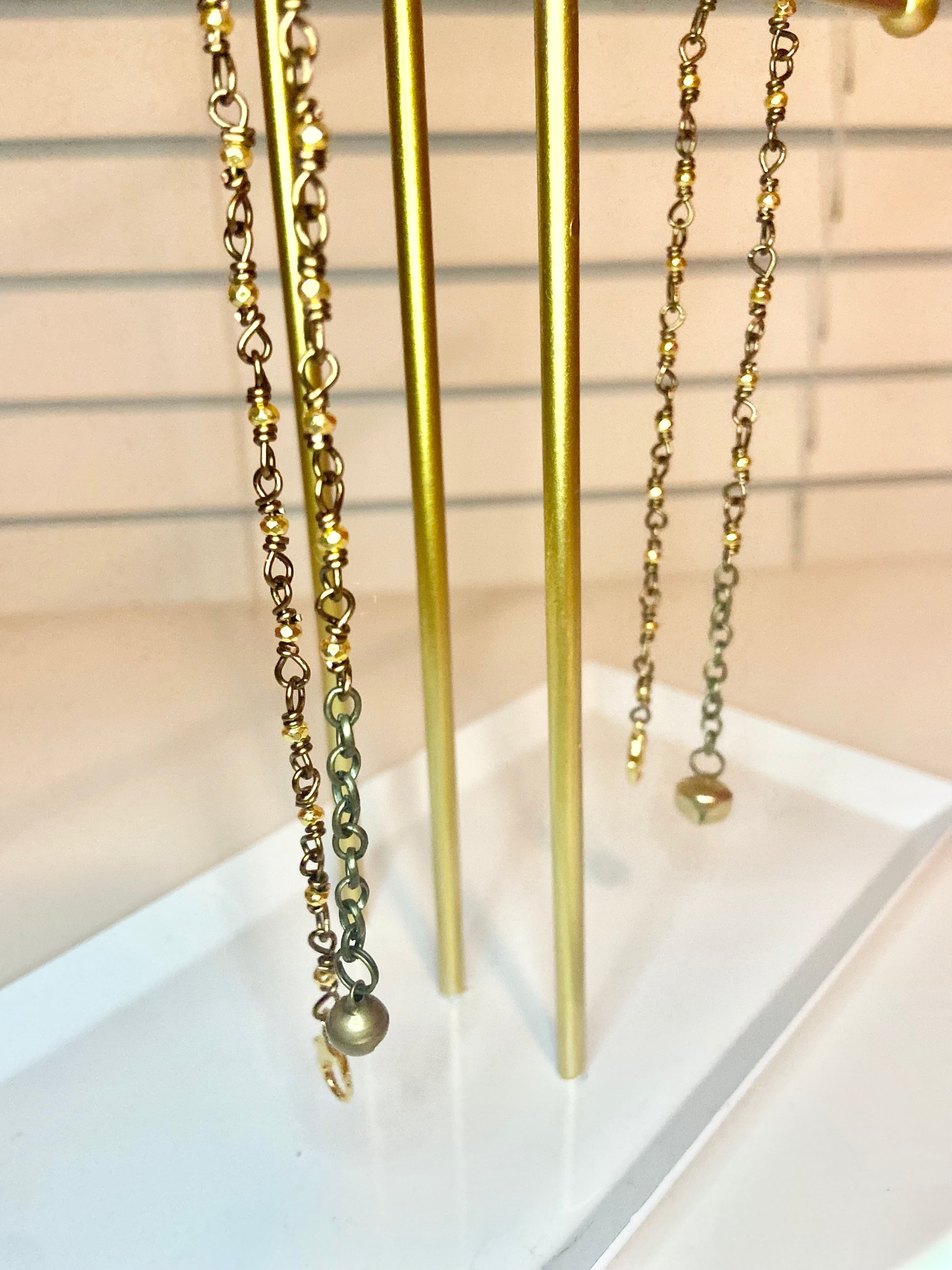 Matching anklet and cat collar made with gold plated hematite beads, copper wire wrap and gold colored bells.