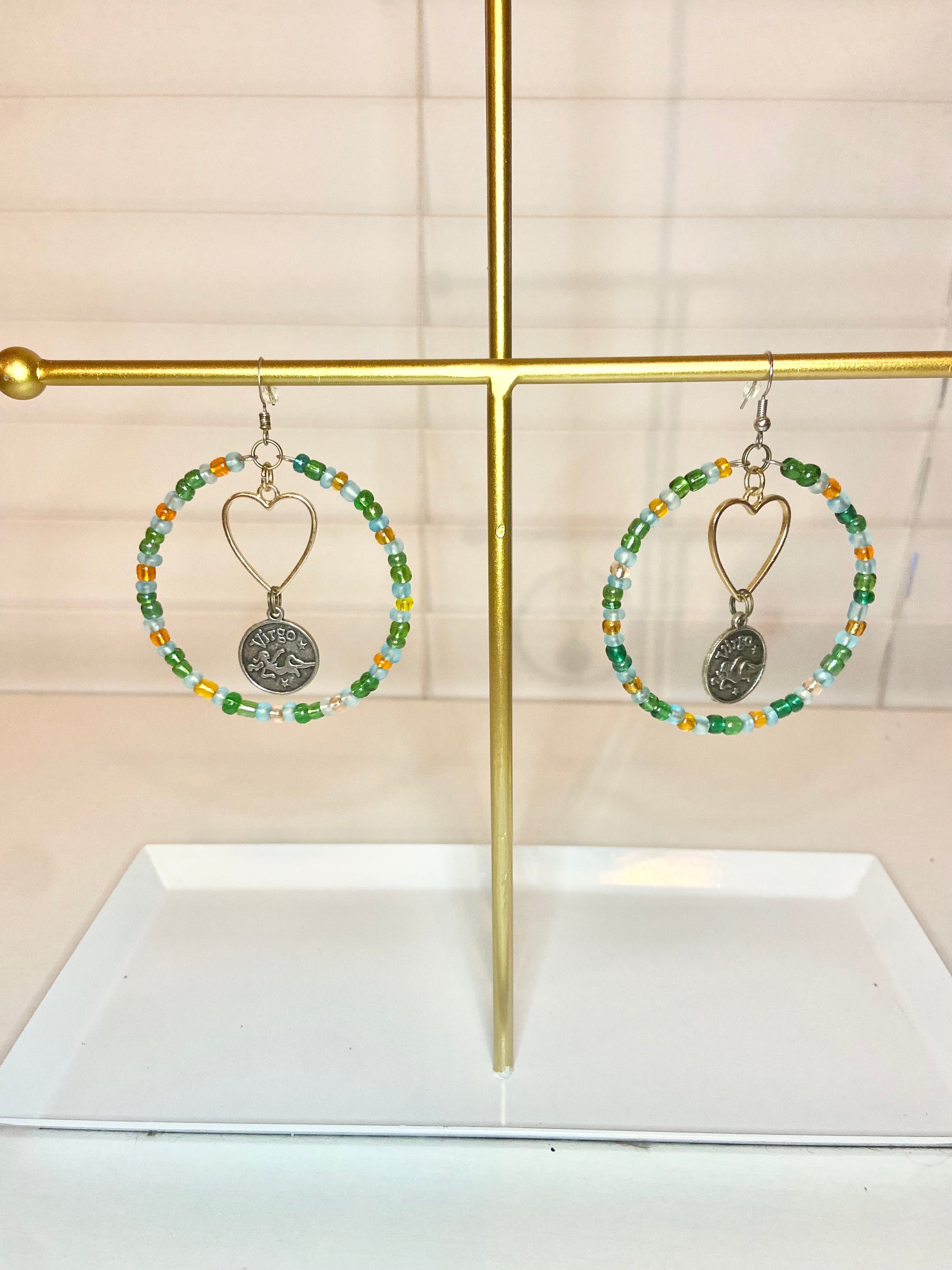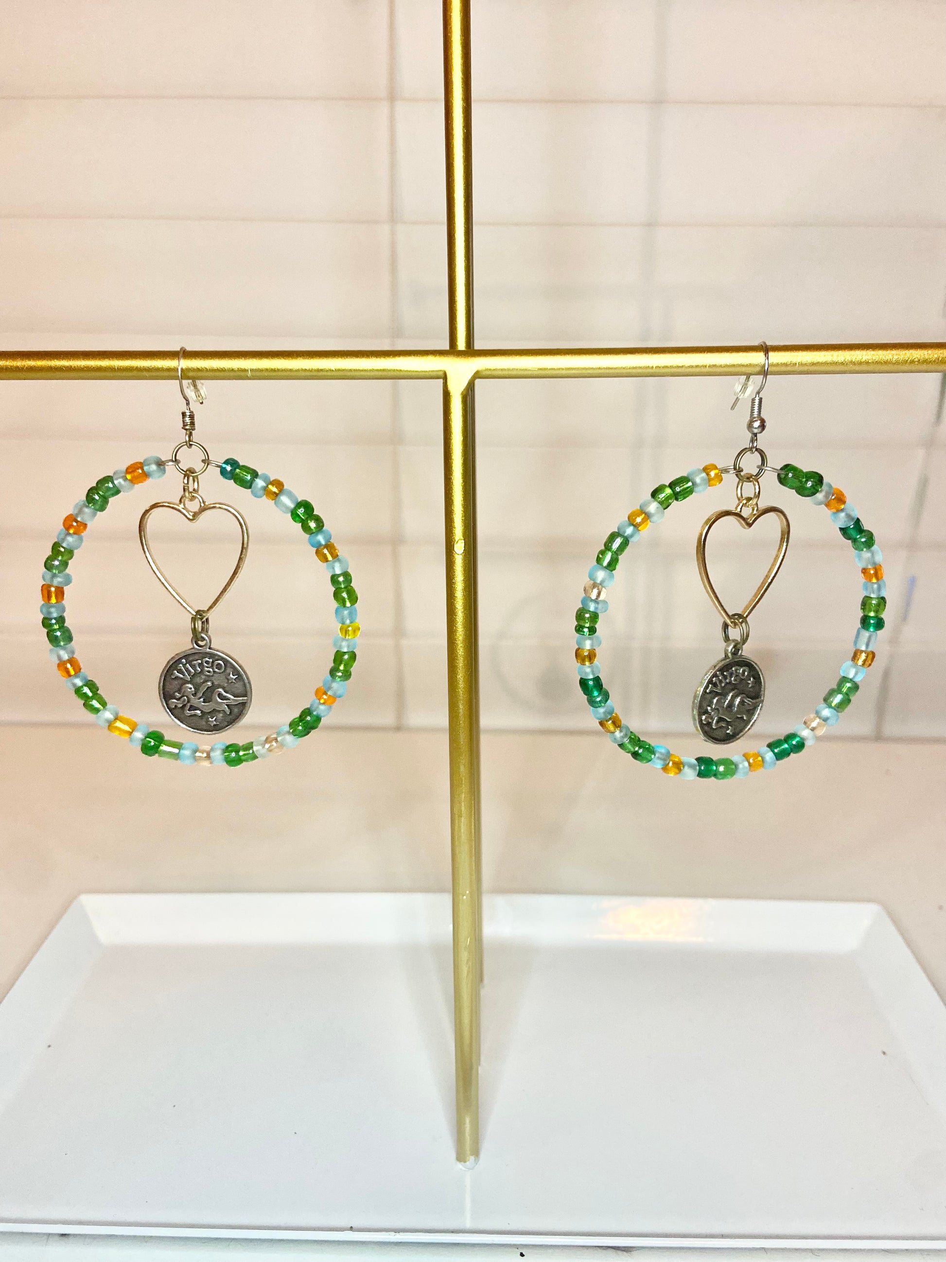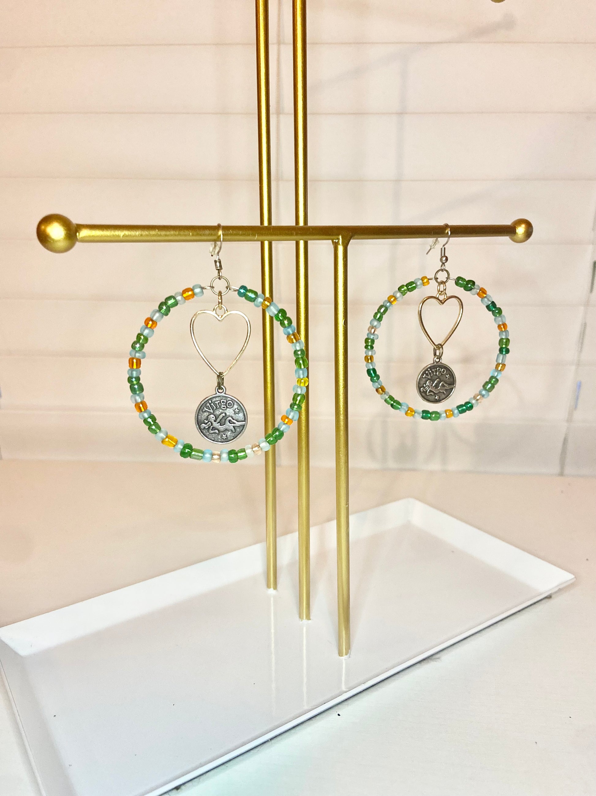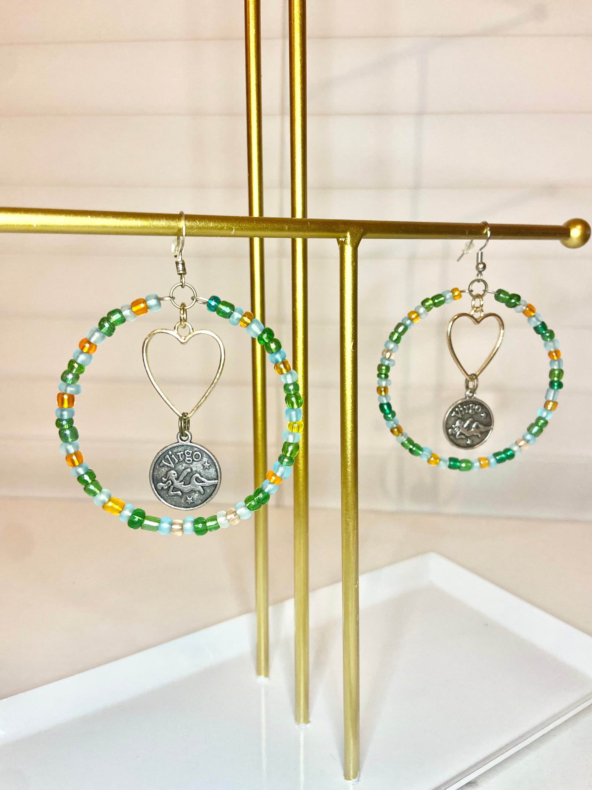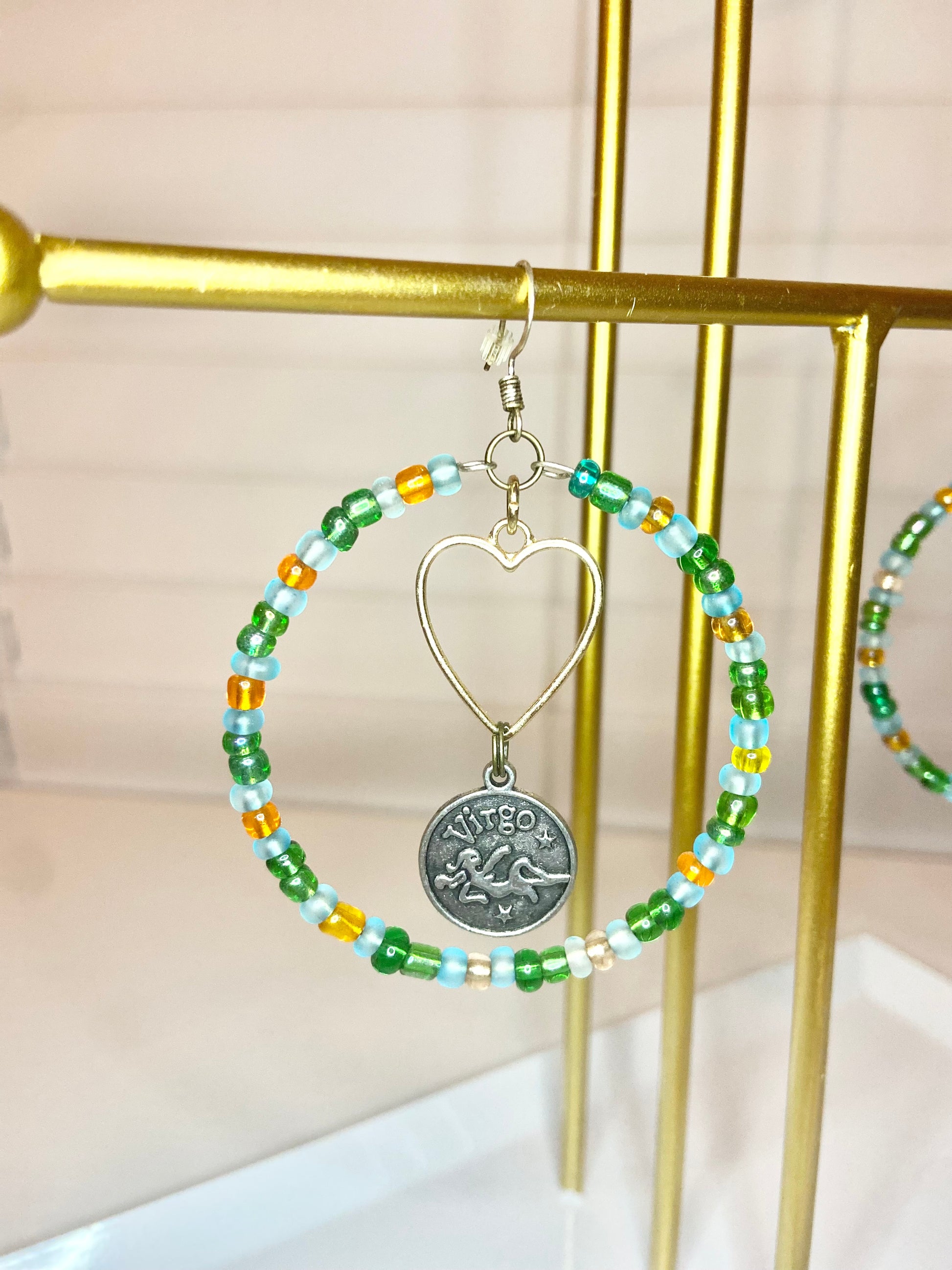Medium size hoops made with multi-colored seed beads and silver colored Virgo charms.