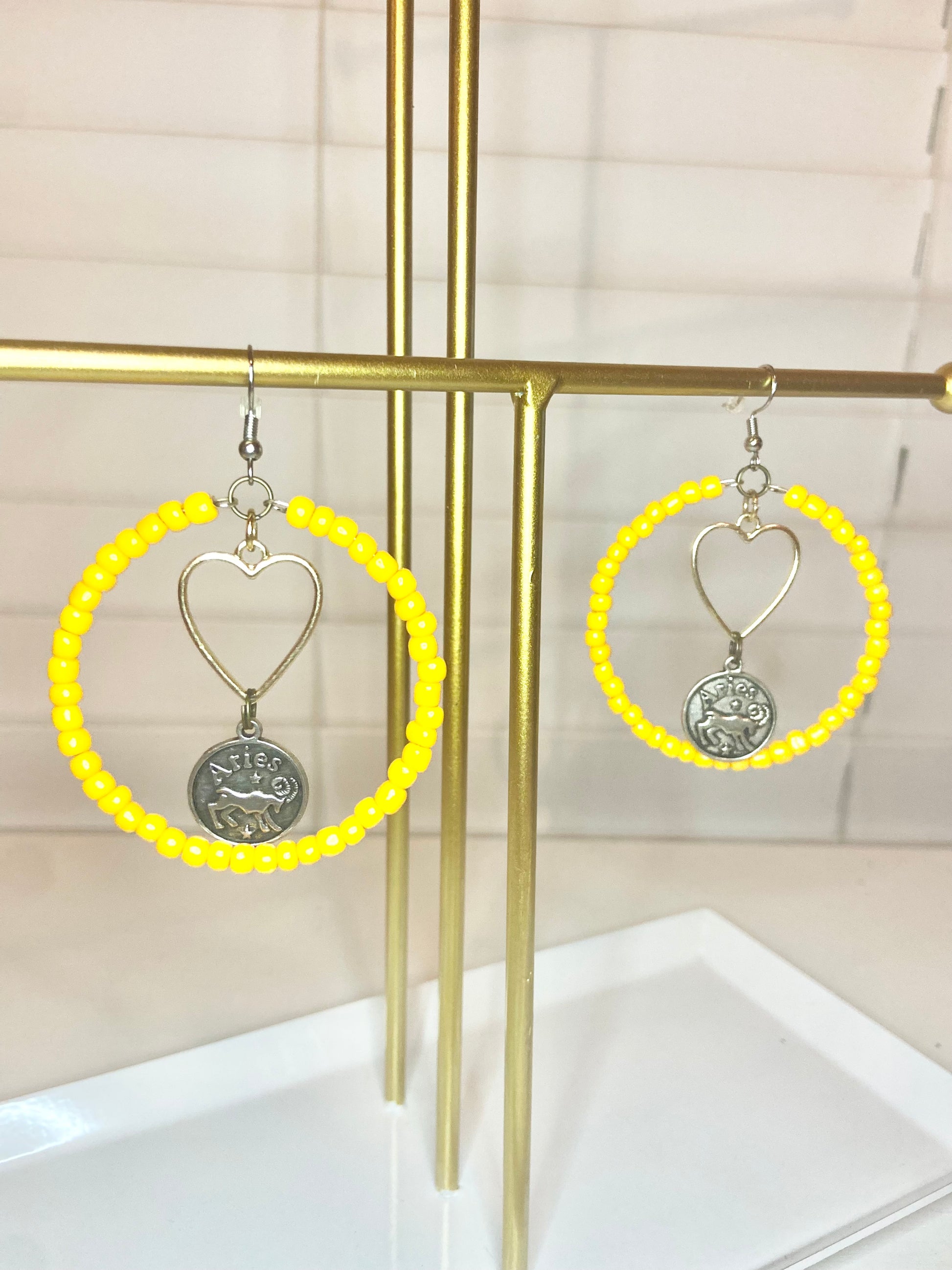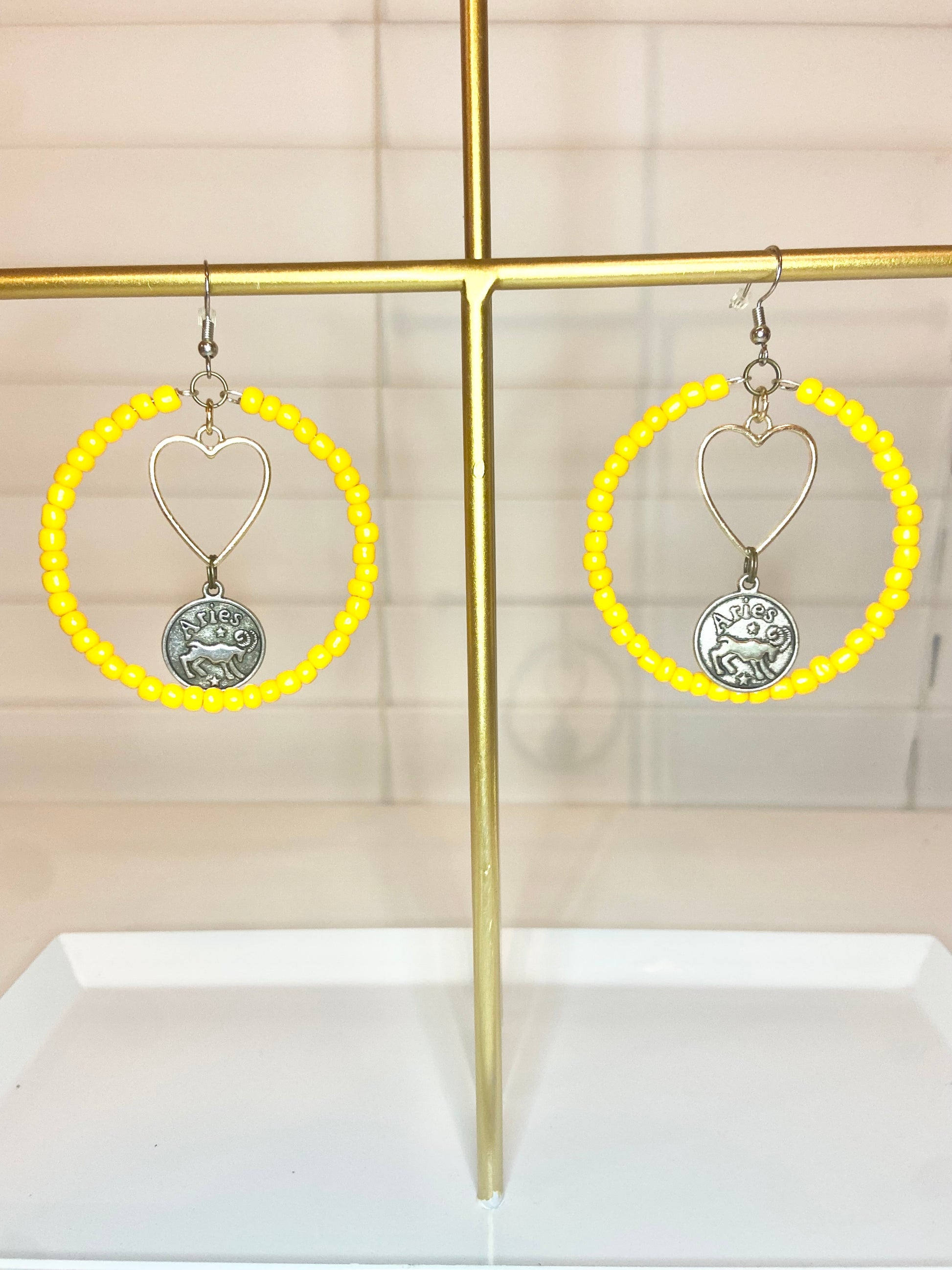Medium sized hoops made of with orange-yellow seed beads and a silver colored Aries charm.