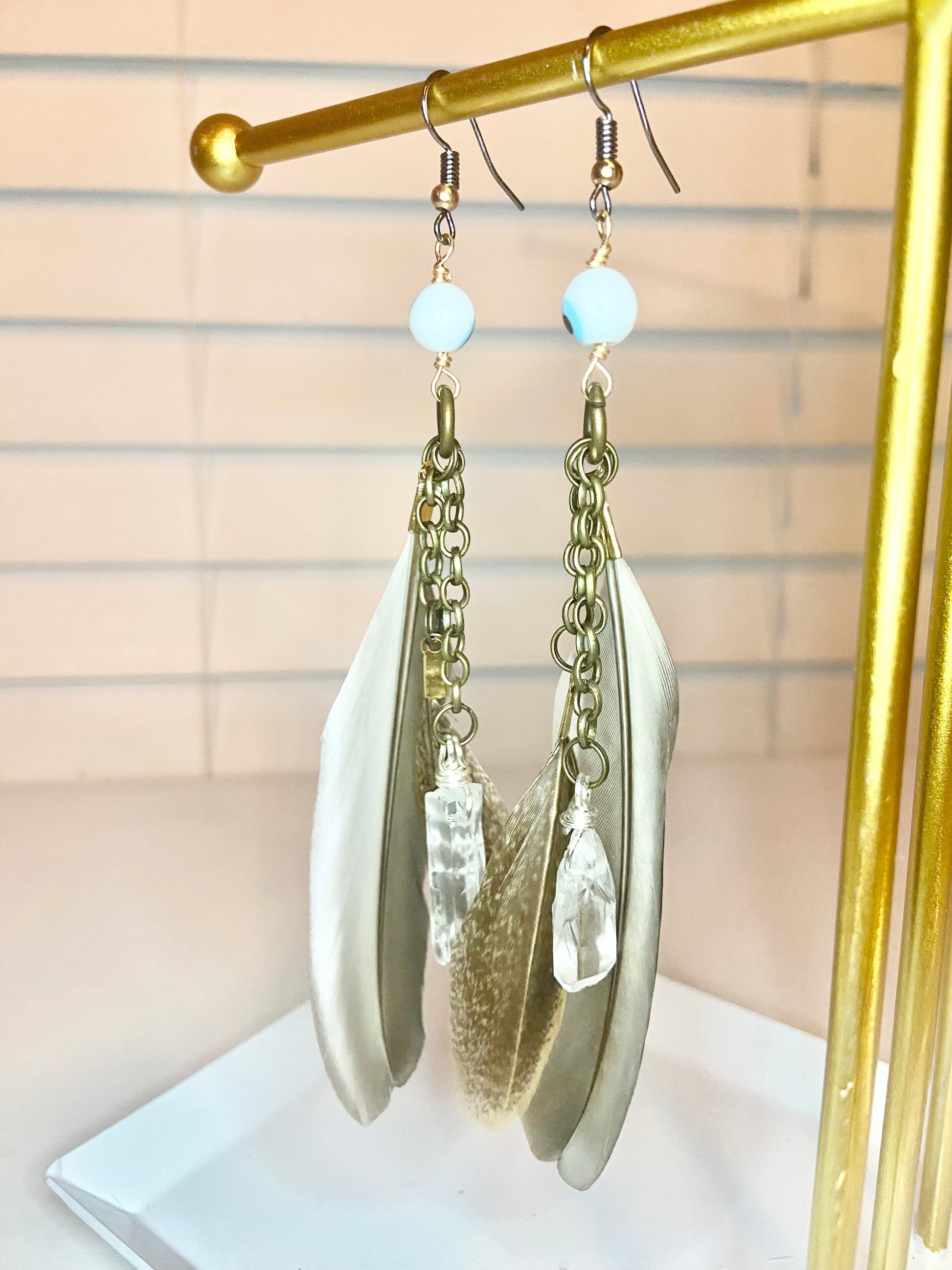 Earrings made with pheasant and seagull feathers, quartz crystals and white evil eye beads.