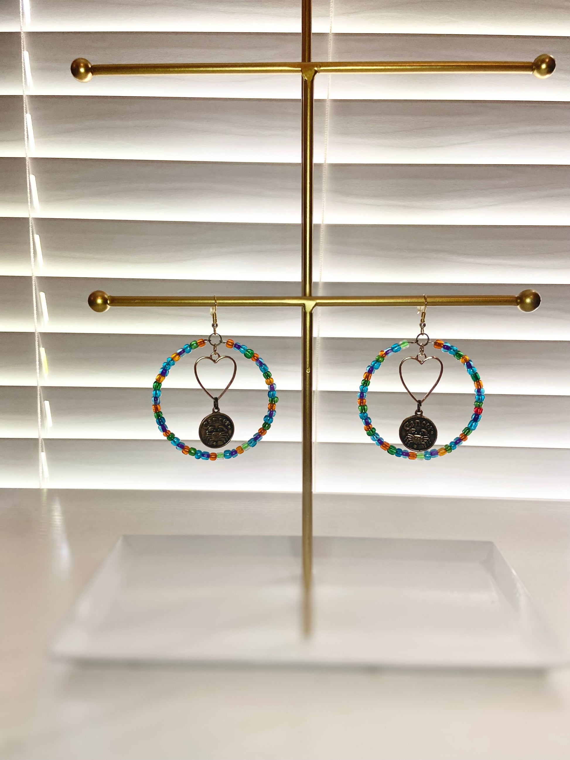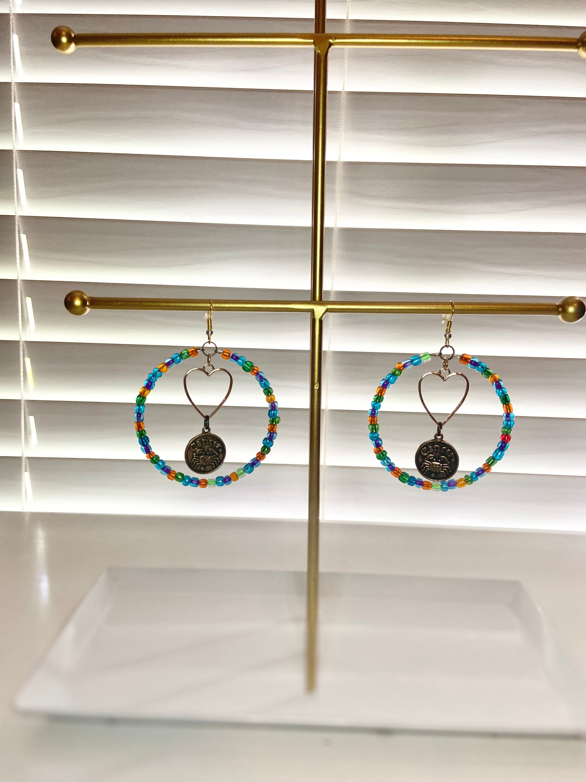 Medium size hoops with rainbow seed beads and a silver colored cancer sign charm.
