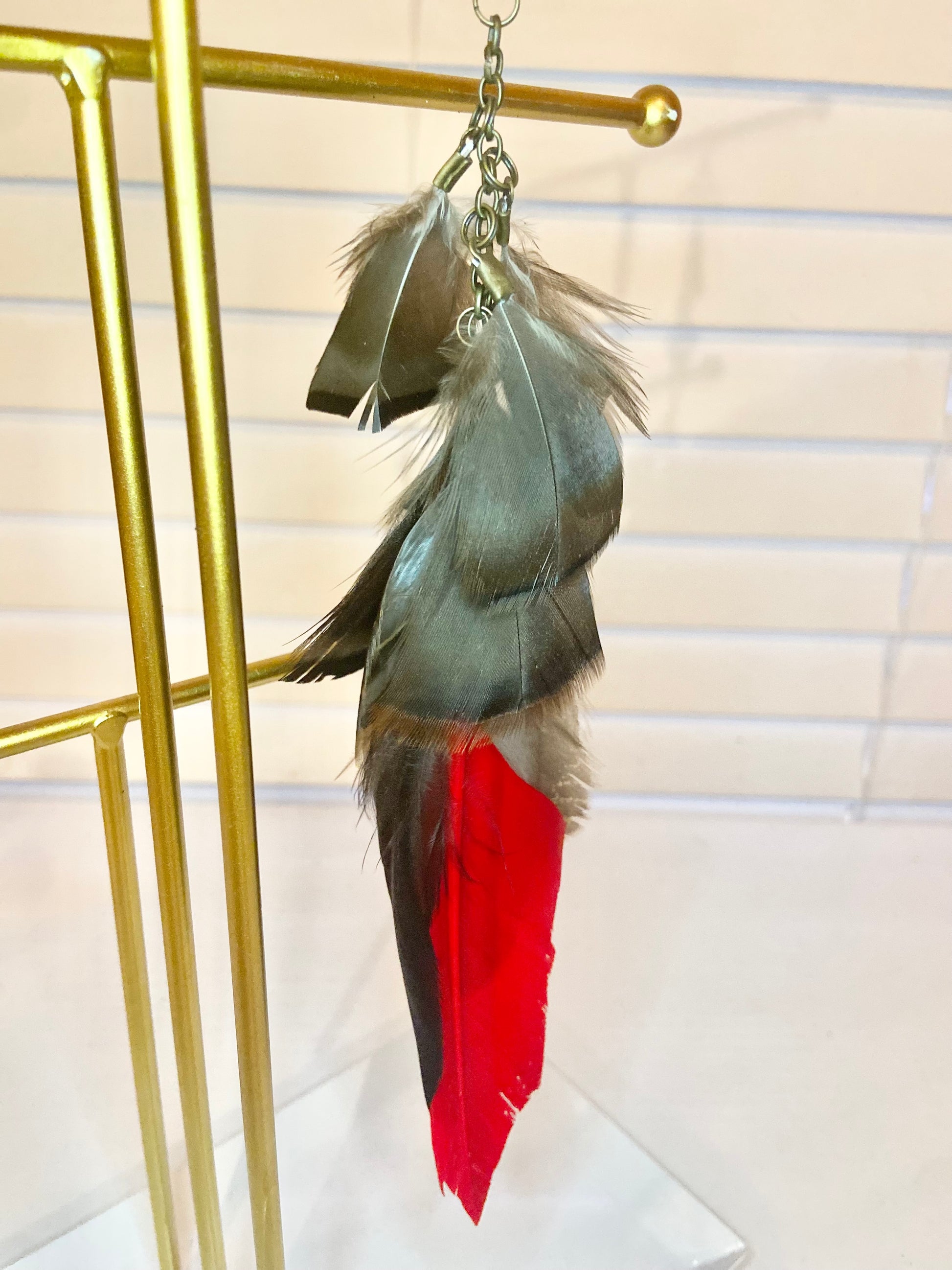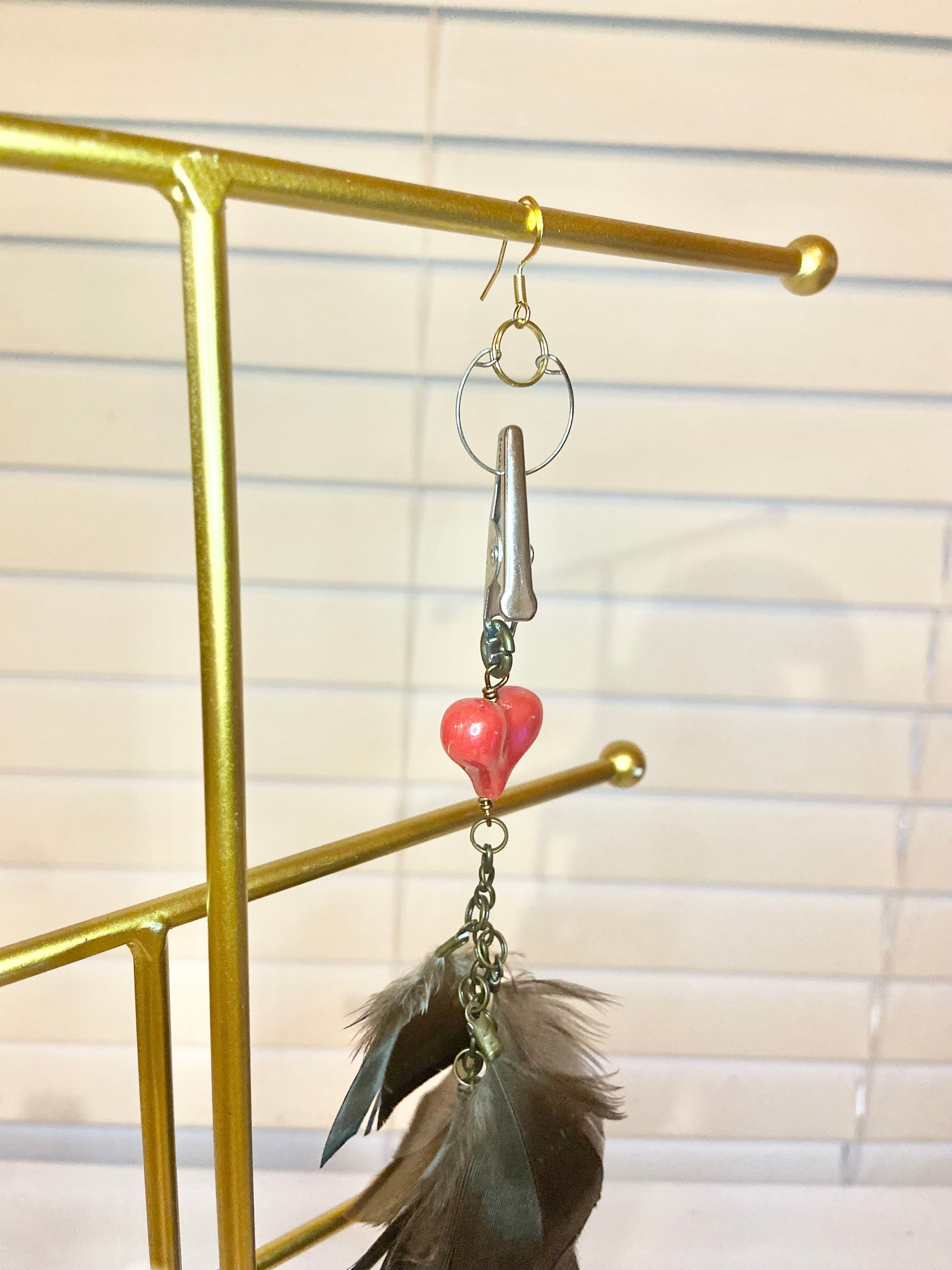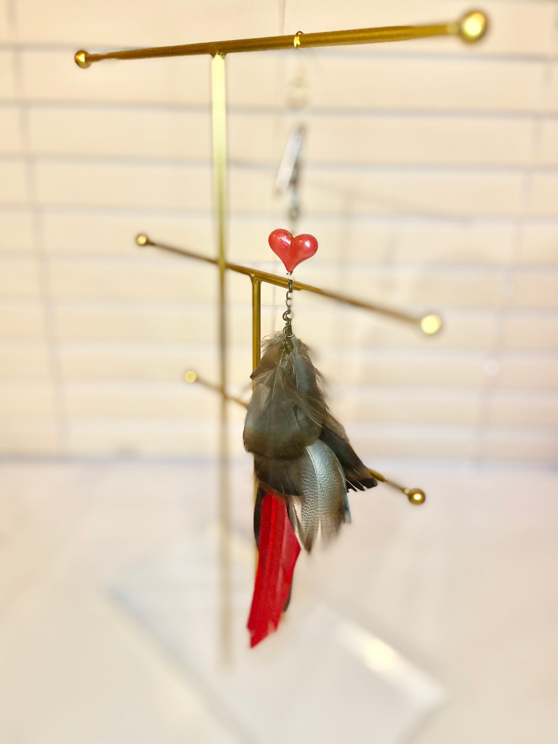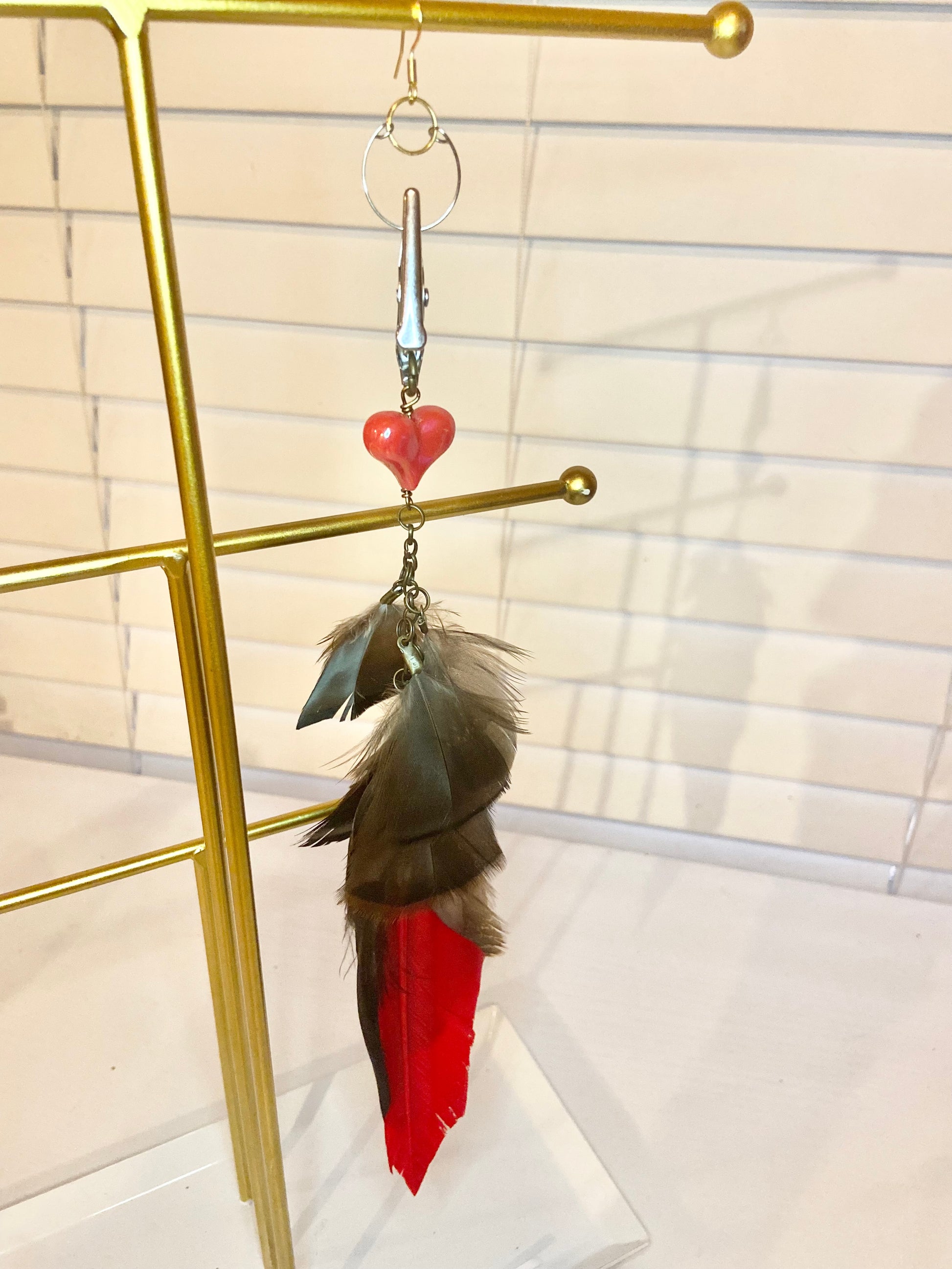 Long earring made with an assortment of naturally sourced locally found wild bird feathers, a red ceramic heart bead and a silver detachable ear piece.