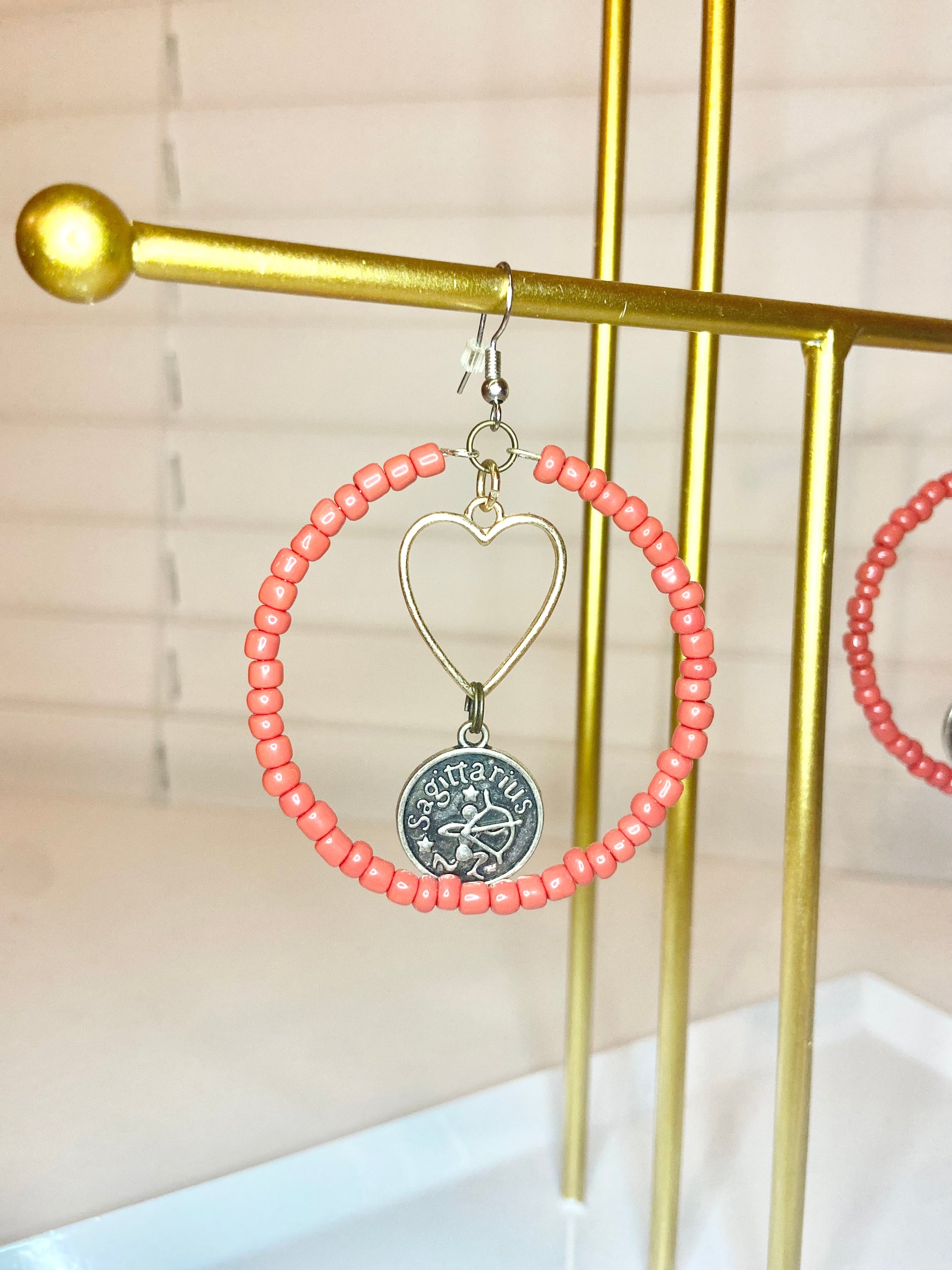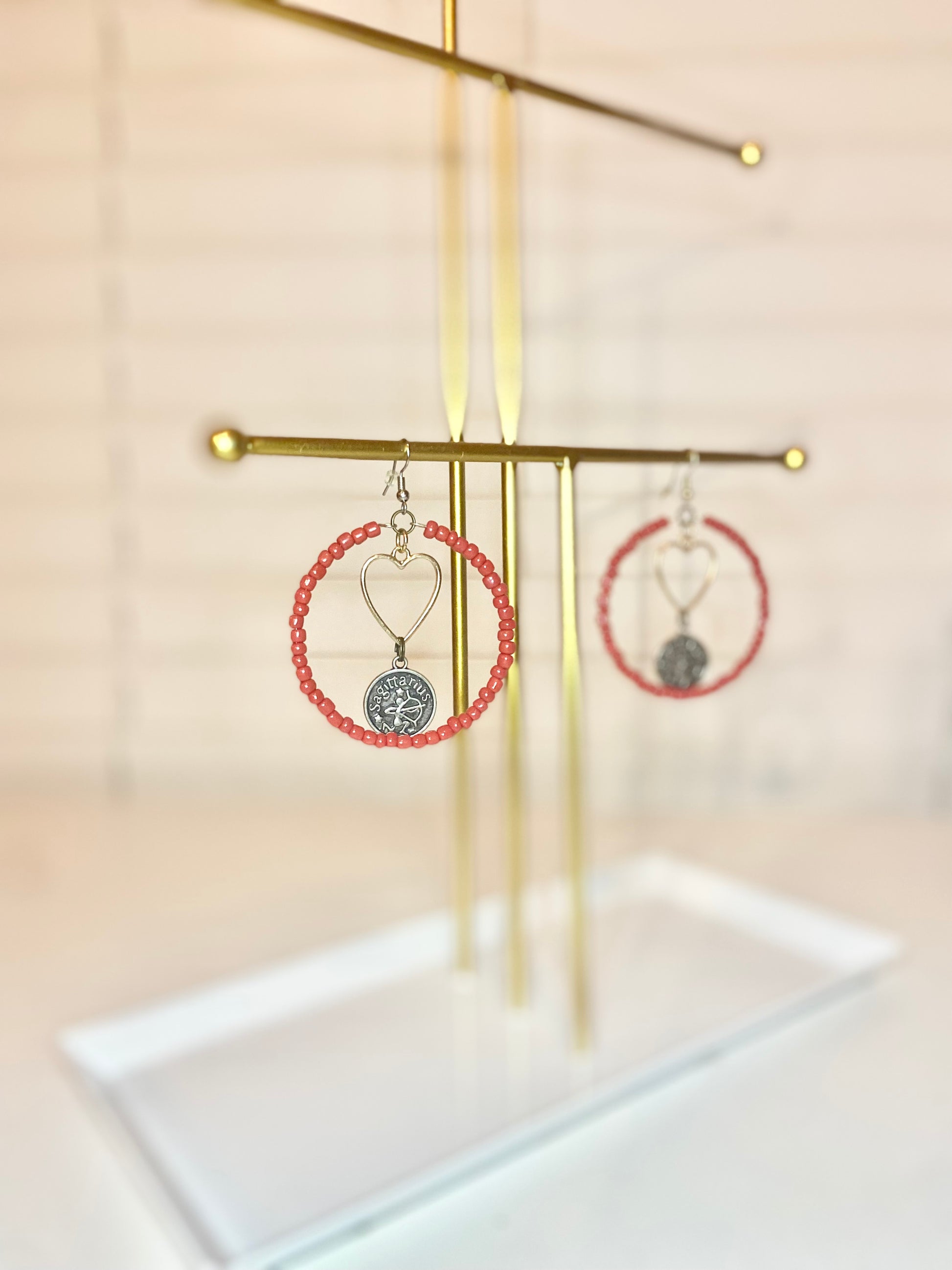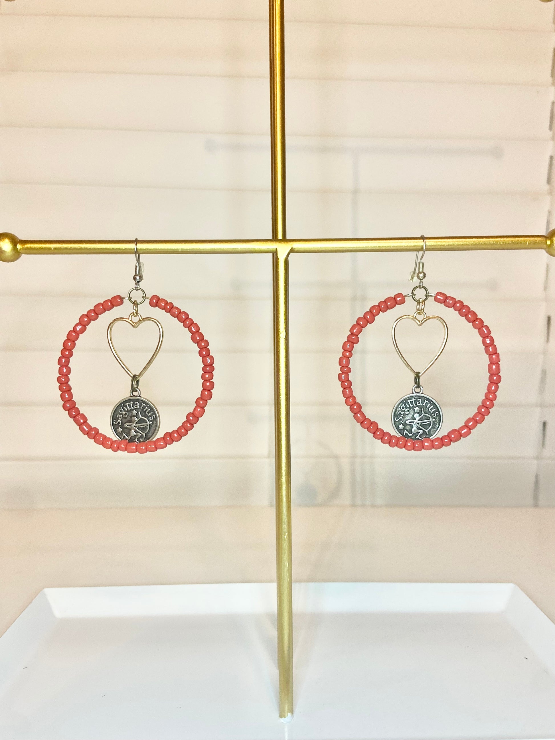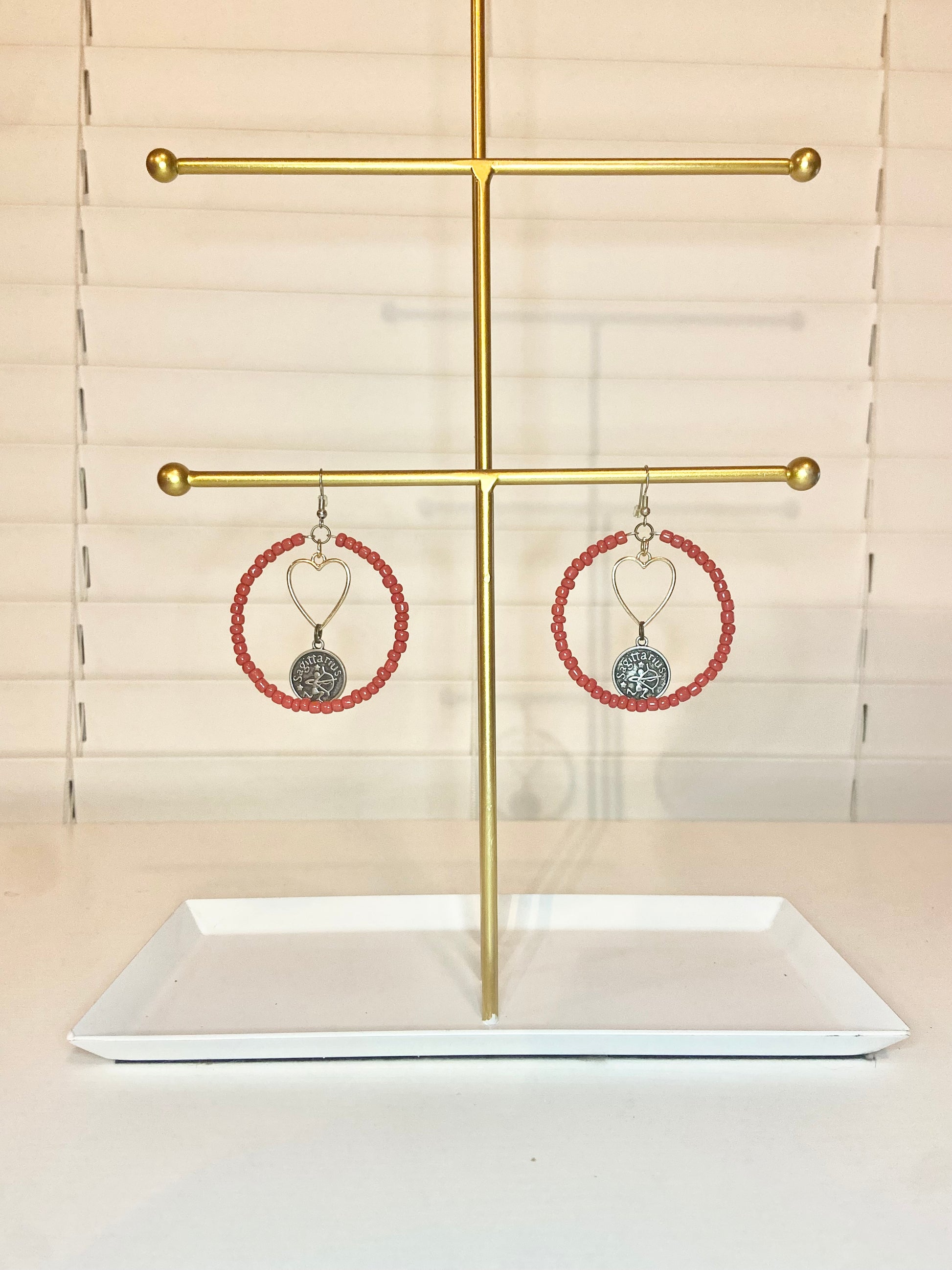 Medium size hoops made with red seed beads and a silver Sagitareous charm.