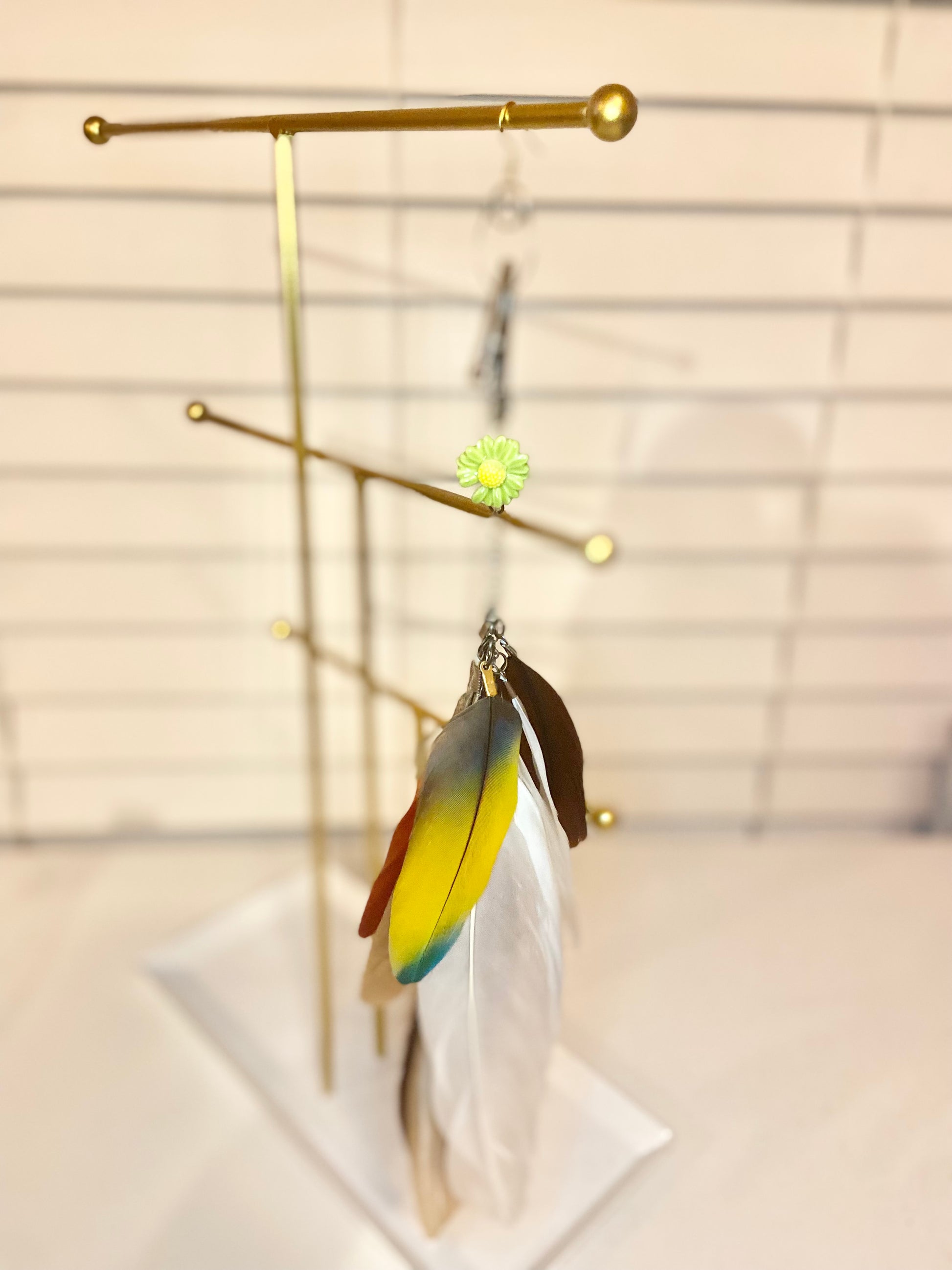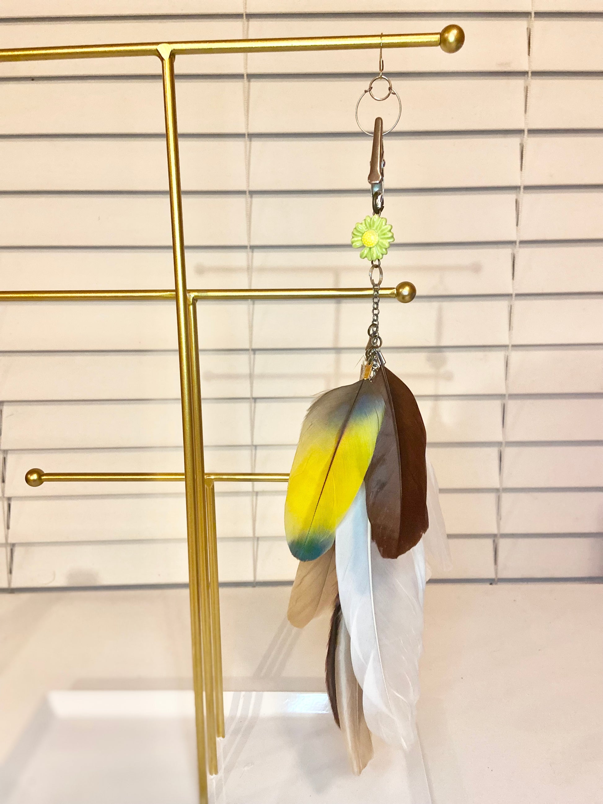 Long feather earring made with an assortment of feathers, a green-yellow ceramic flower charm and a detachable ear piece.