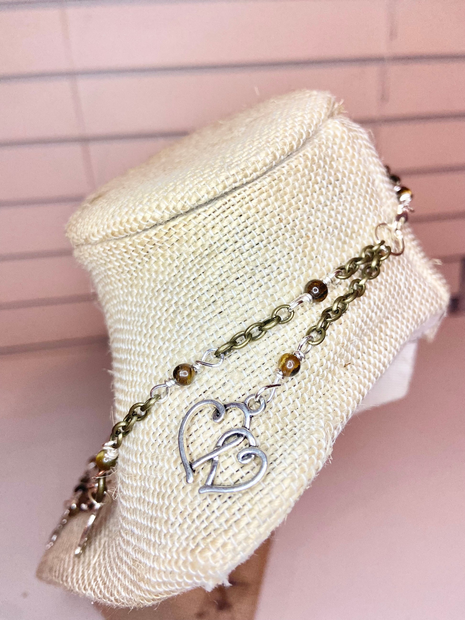 Charm necklace made with tiger eye beads, silver wire wrap, antique chain and silver charms.