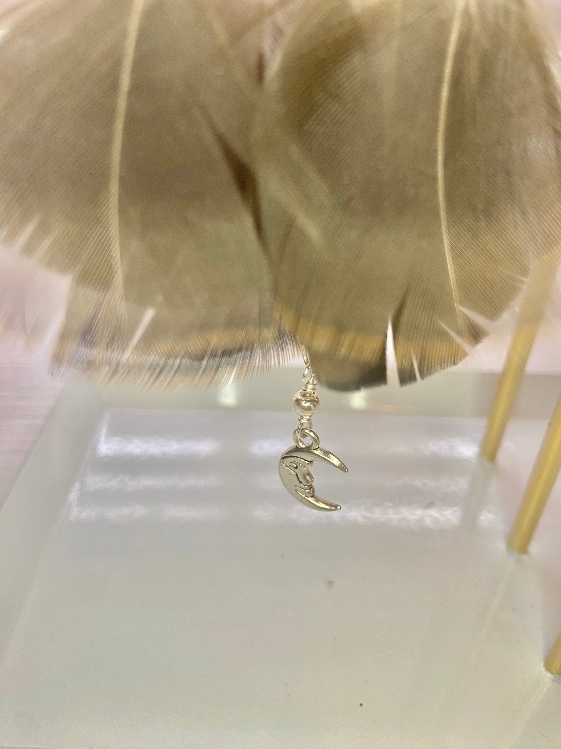 Earrings made with silver colored wings, Turkey feathers and multi-colored dead beads with a silver moon charm embellishment.