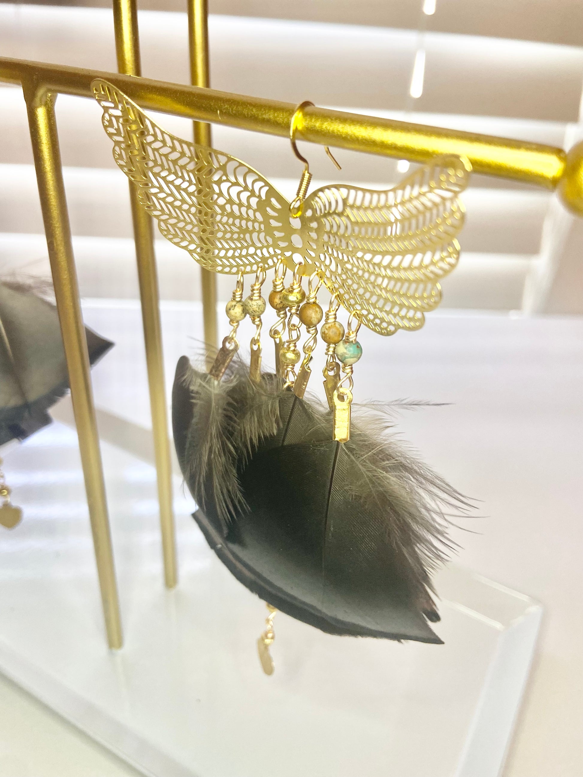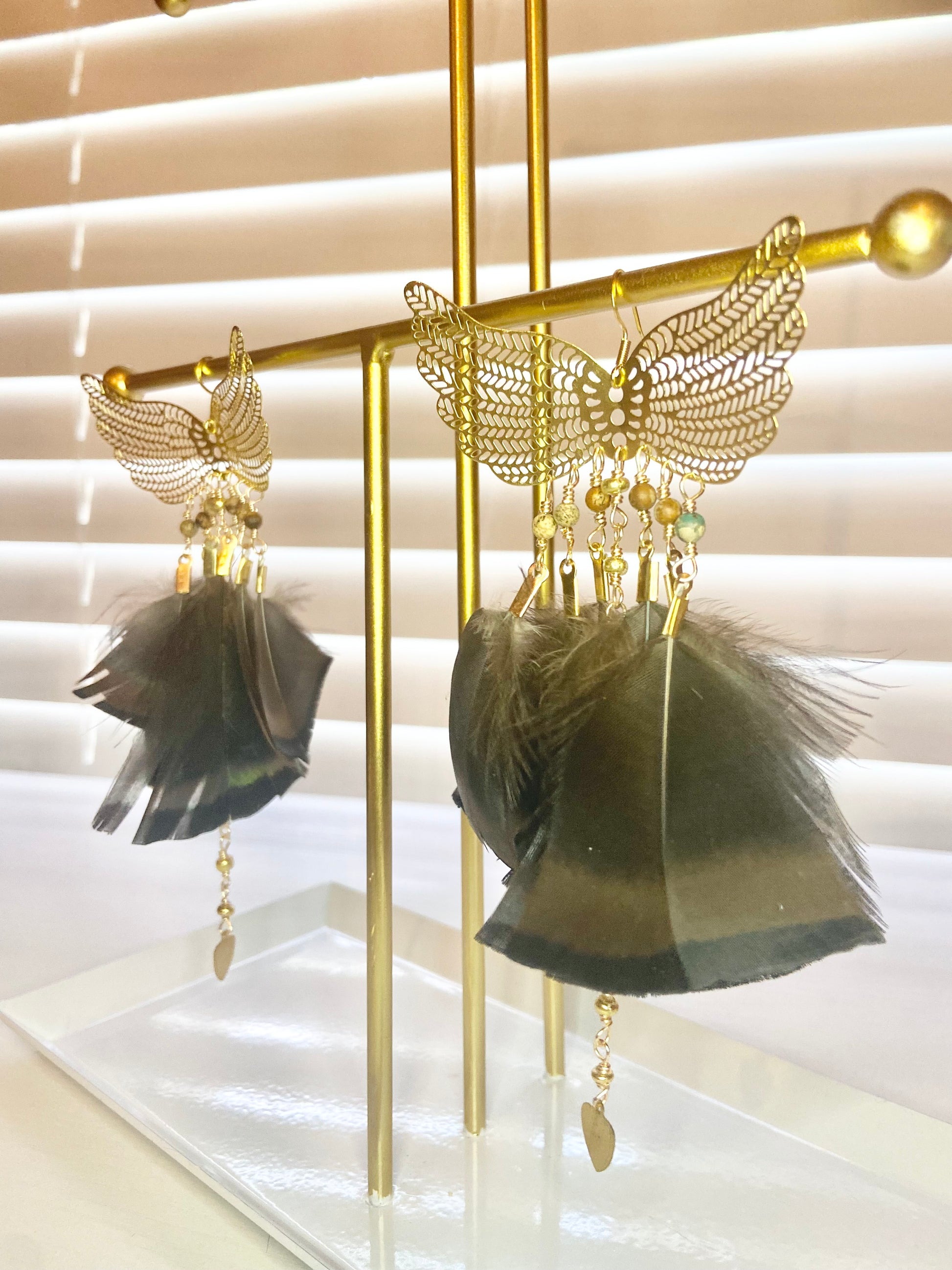 Earrings made with gold colored wings, Turkey feathers, picture jasper beads and a gold heart charm.