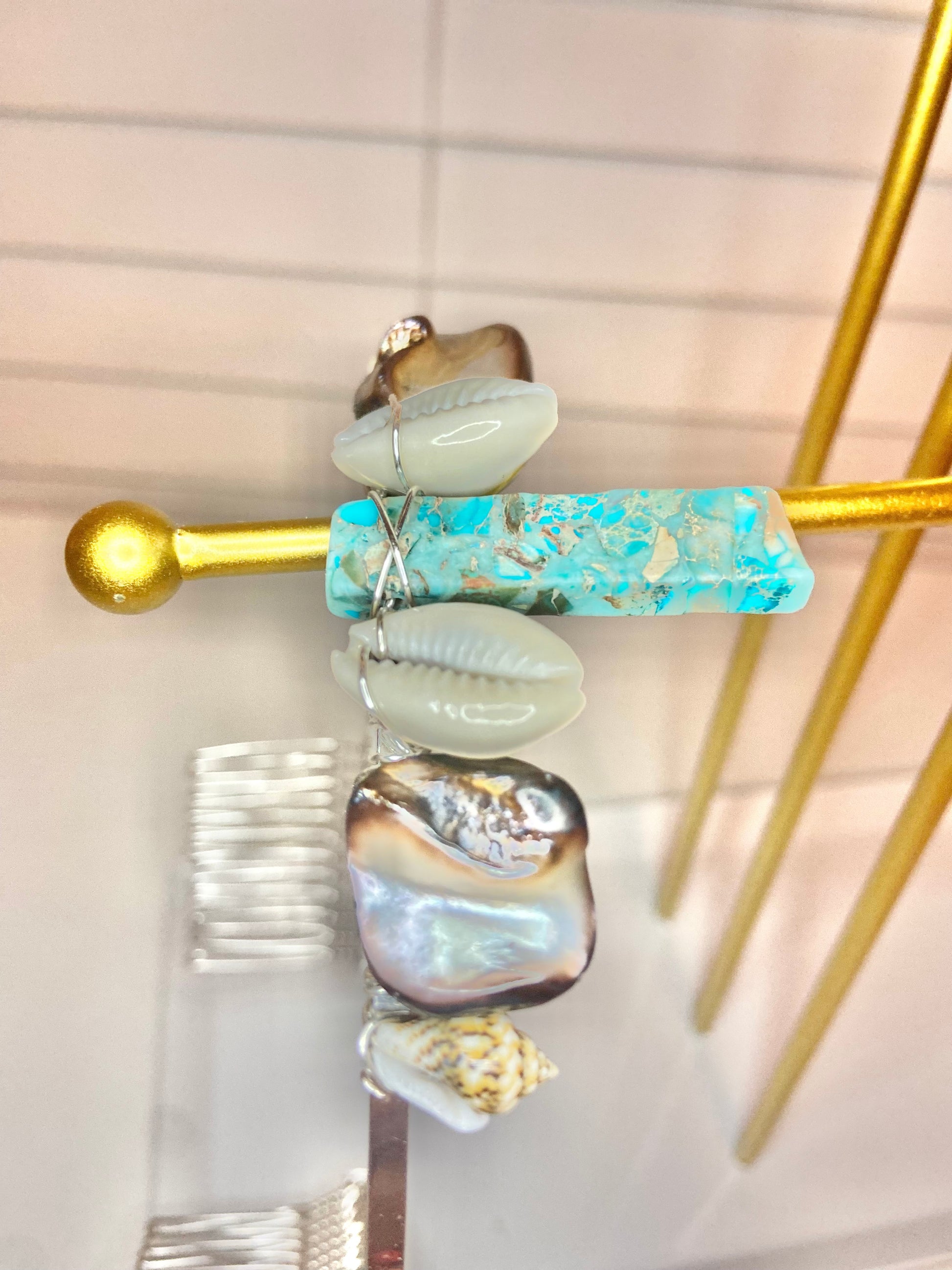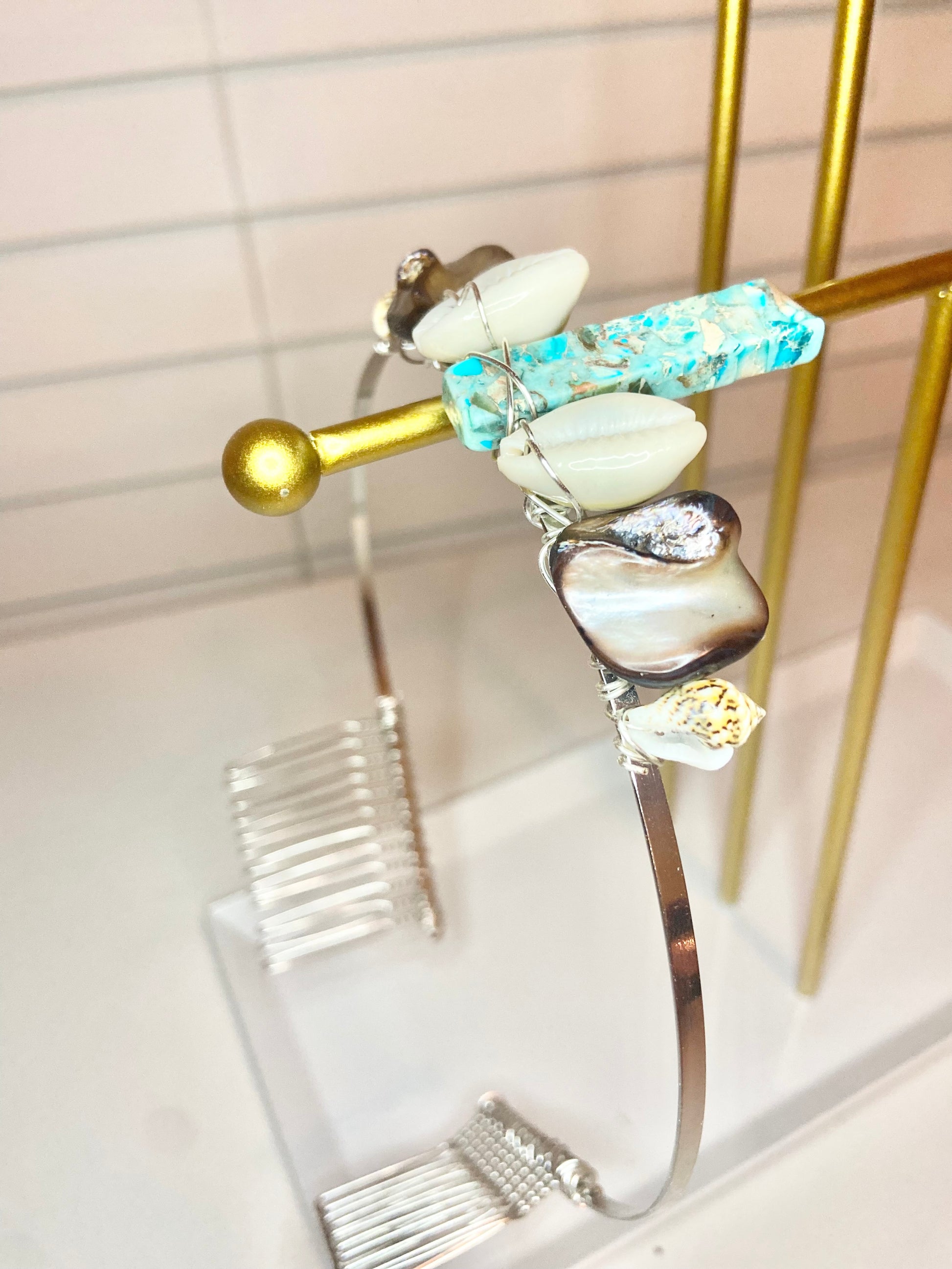 Tiara made with turquoise stone, pearls and shells with silver wrap.