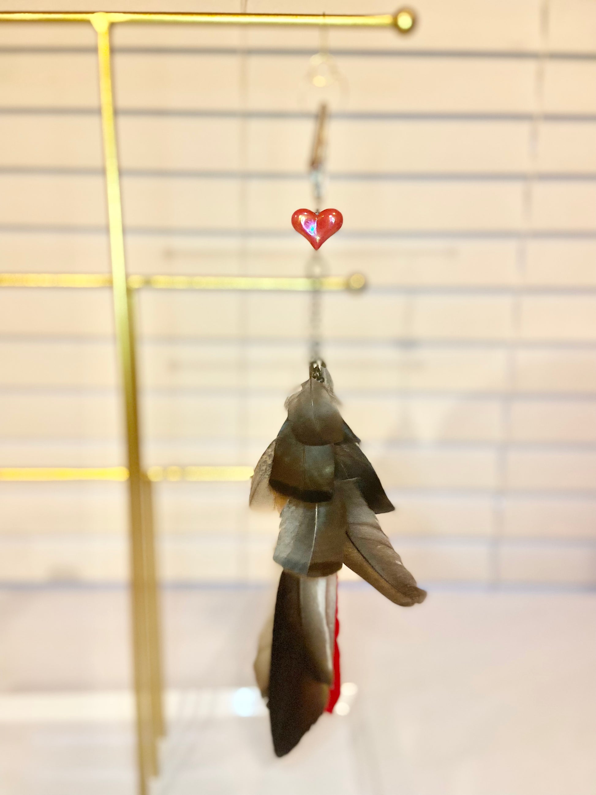 Single feather earring made with an assortment of locally and naturally sourced feathers, a ceramic heart charm and a detachable ear piece.