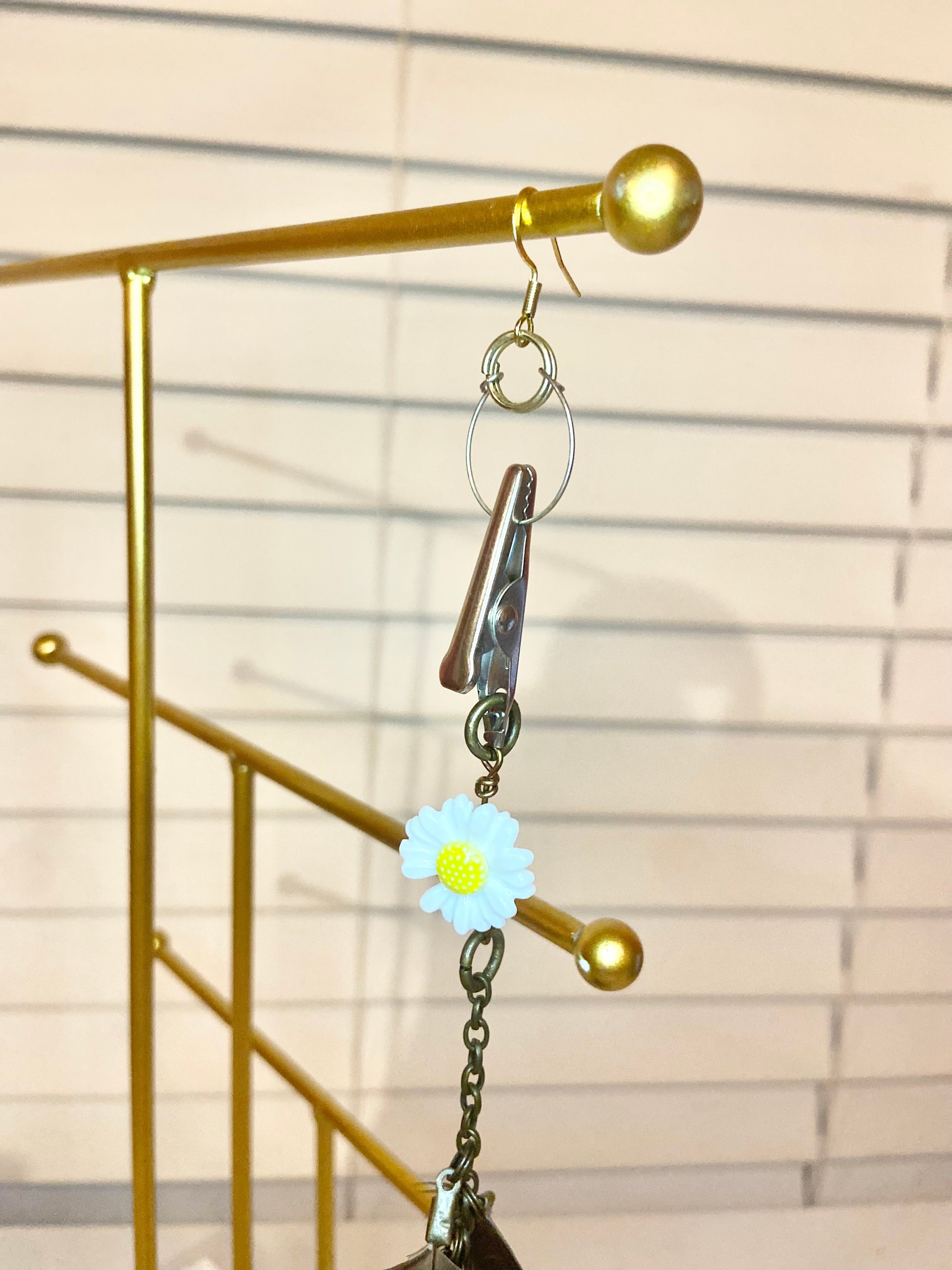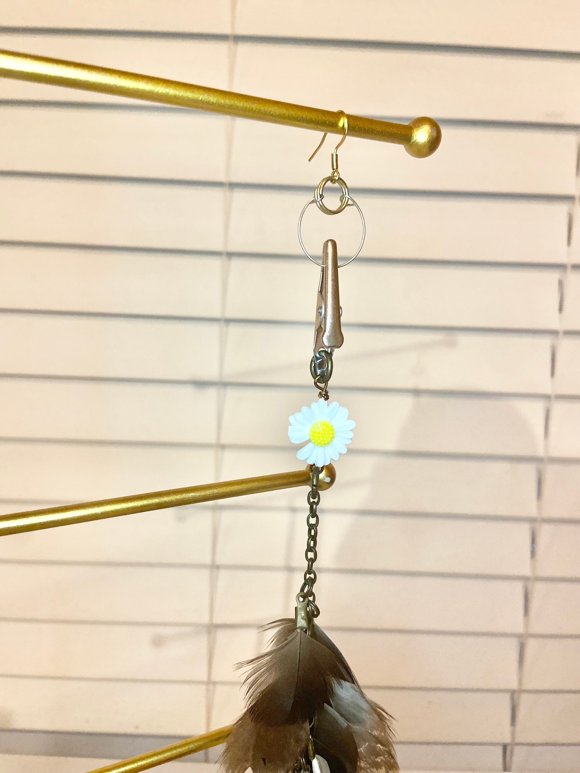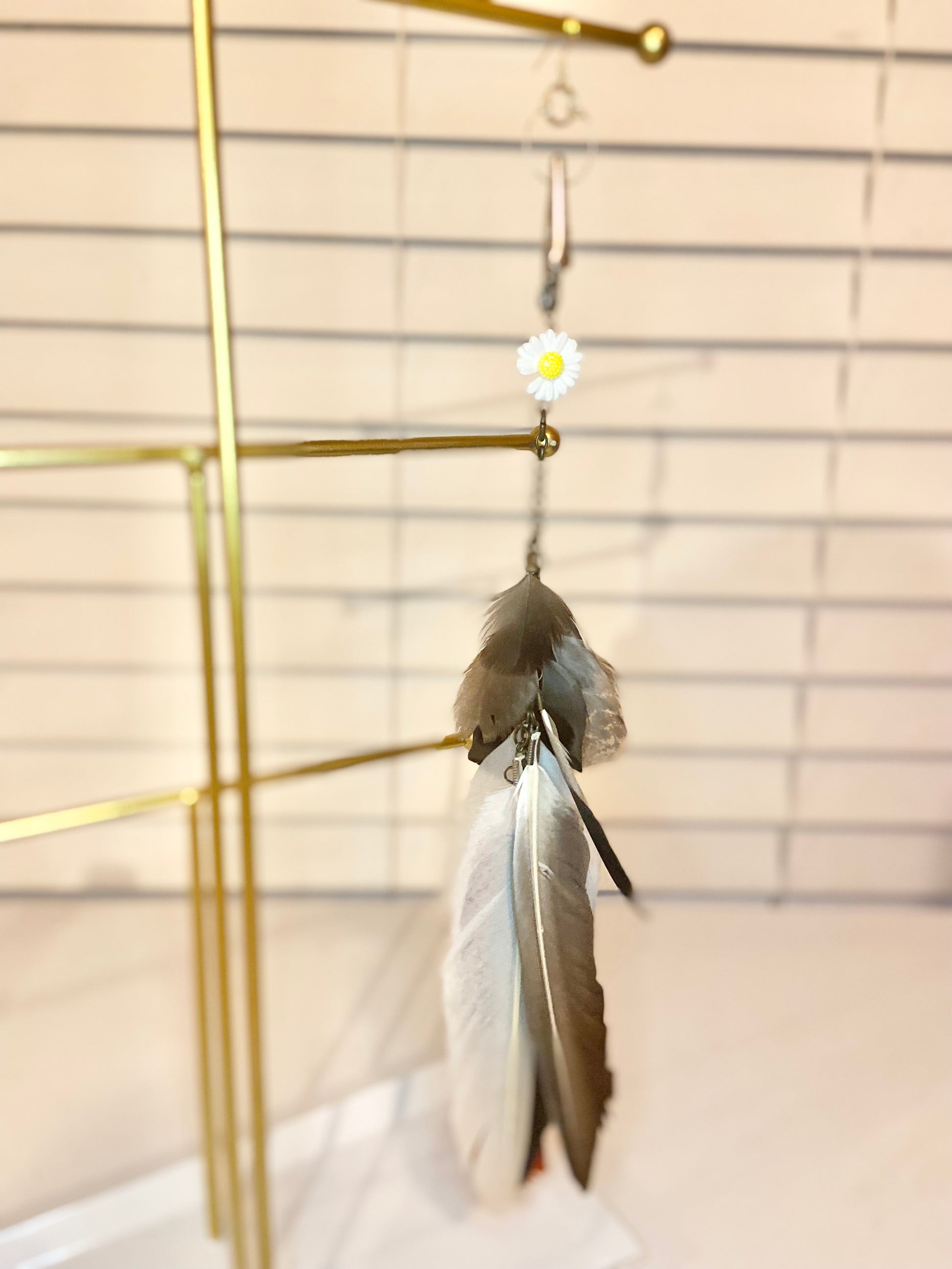 Long feather earring of assorted feathers, a white ceramic flower charm and a detachable silver ear piece.