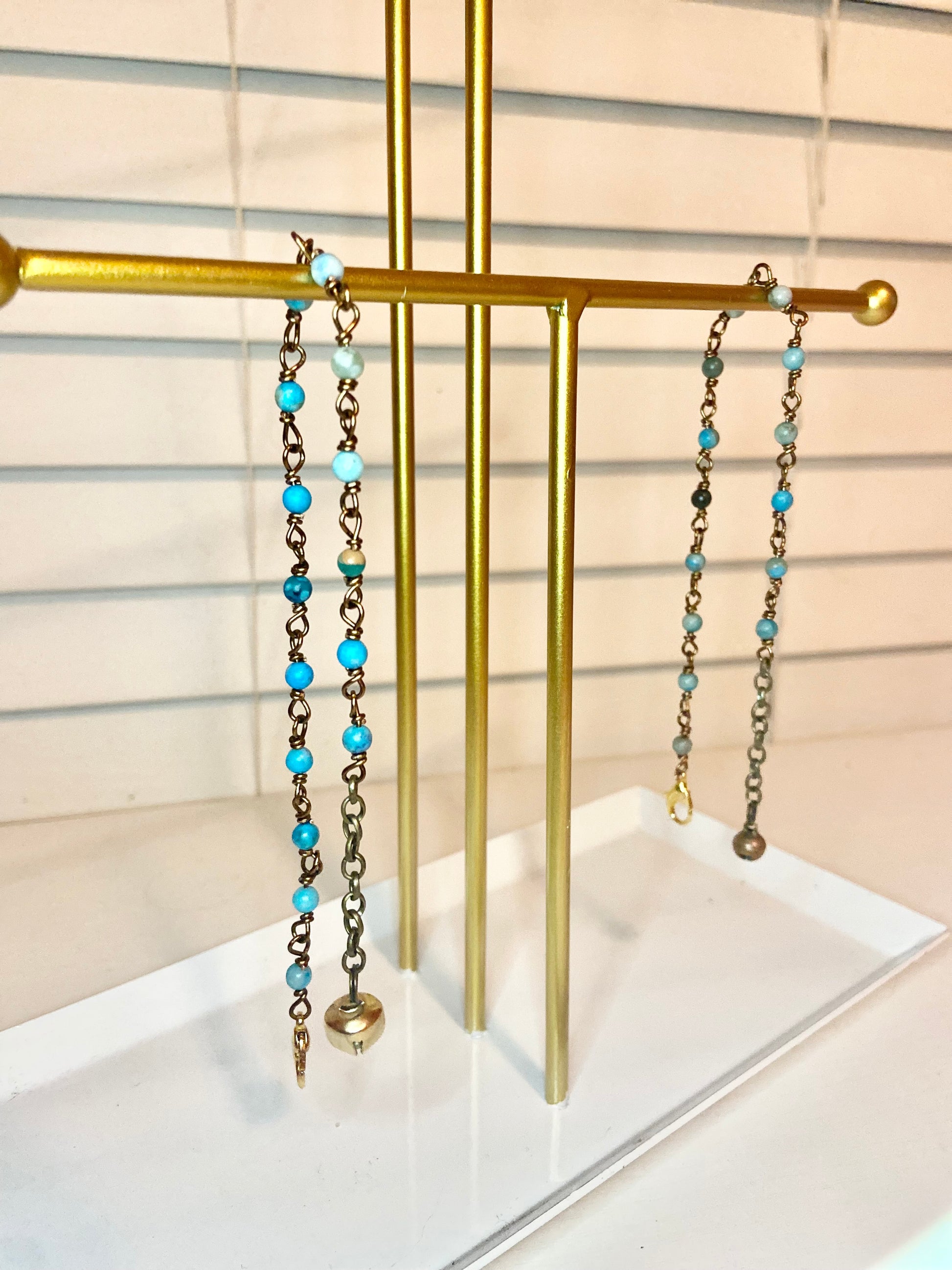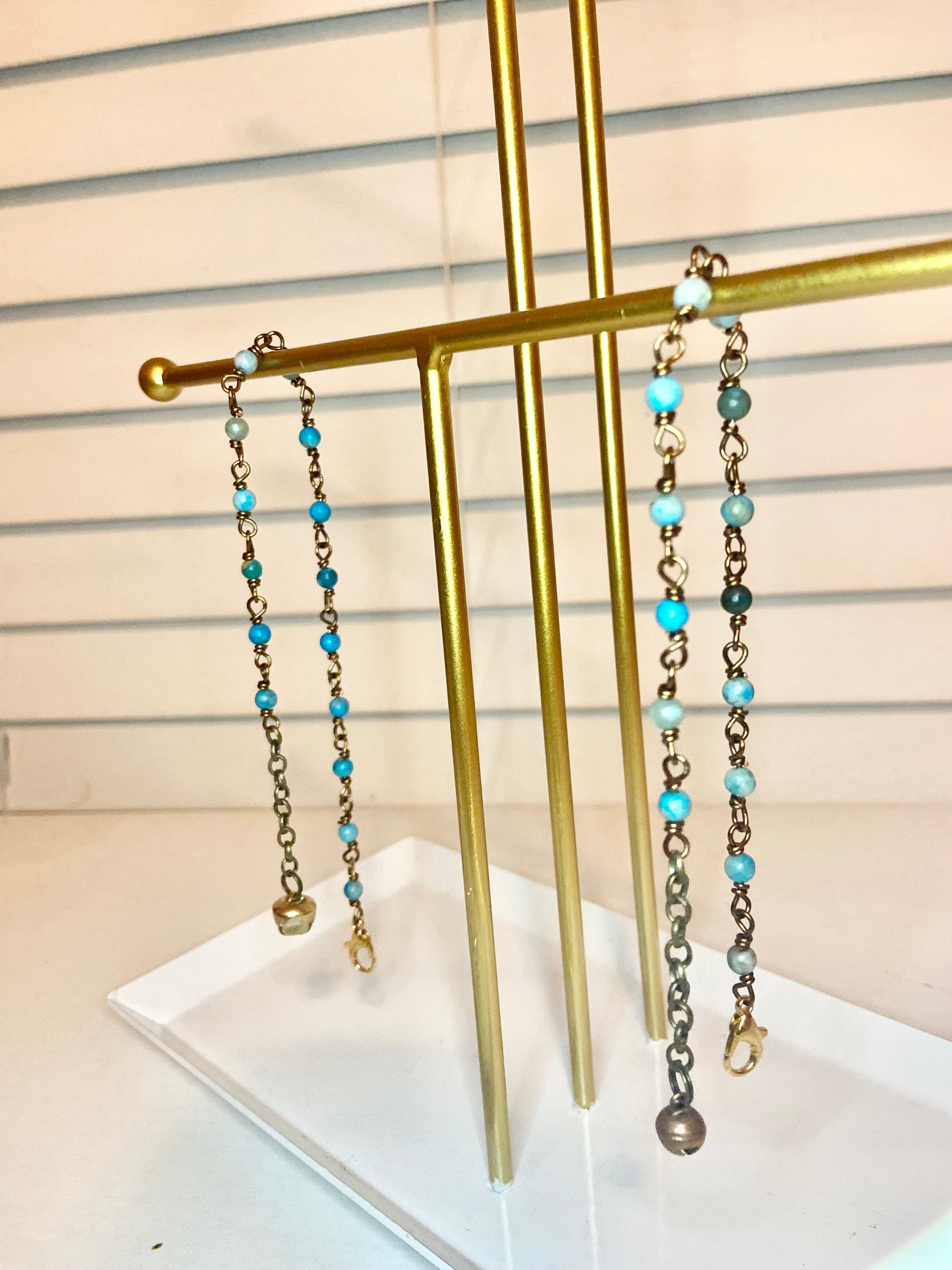 Matching anklet and cat collar made with copper wire, turquoise beads and gold colored bells.