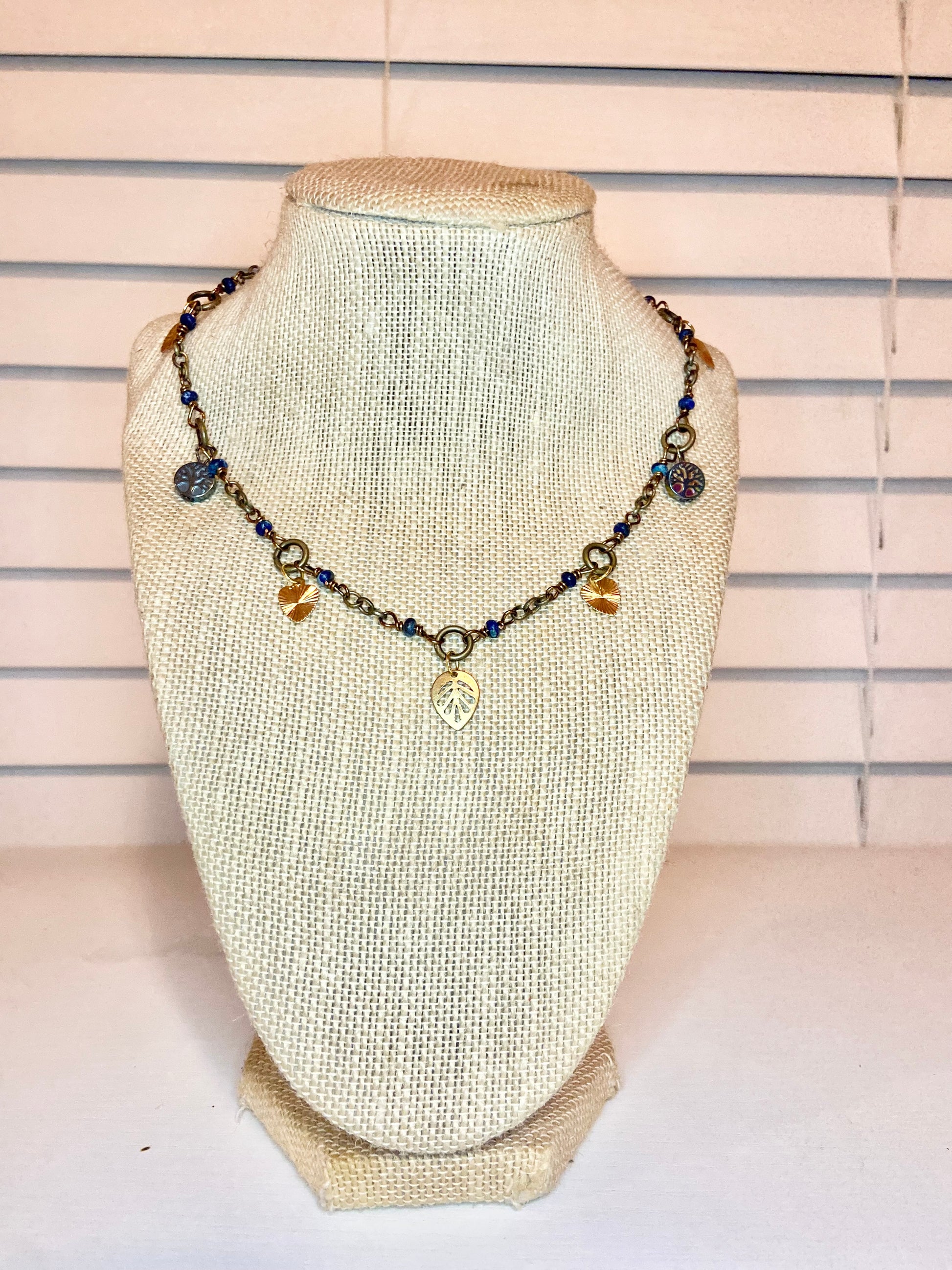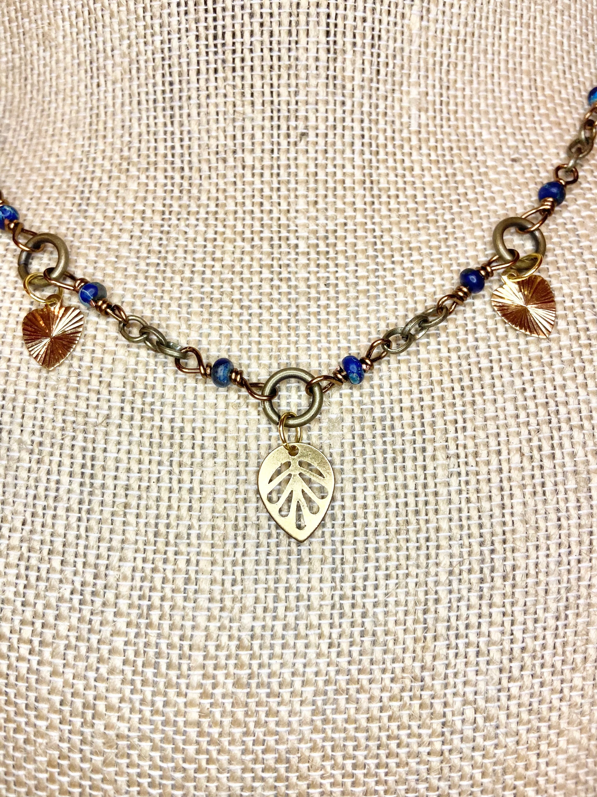 Choker necklace made with lapis lazuli beads, gold wire, antique chain and gold colored charms.