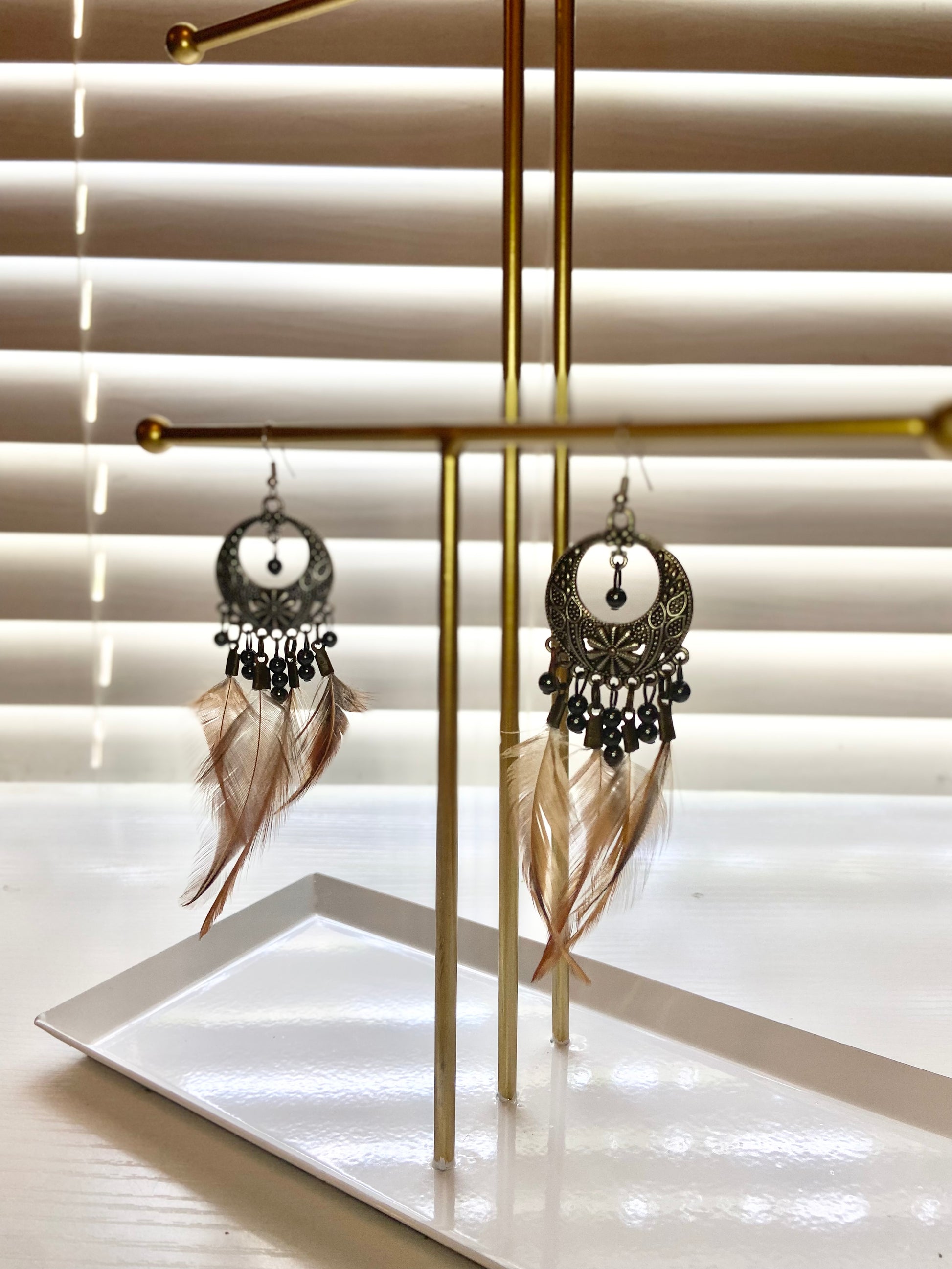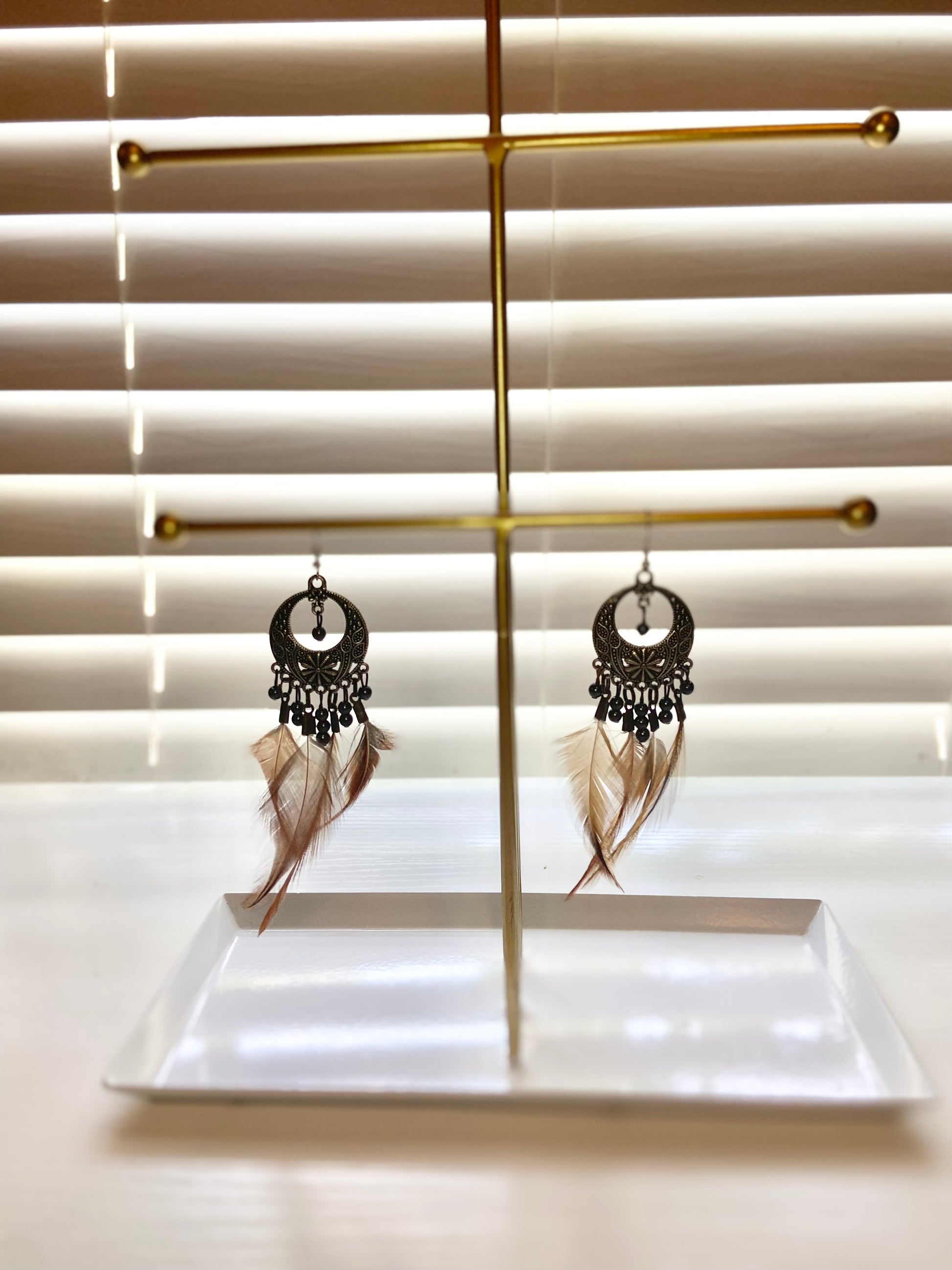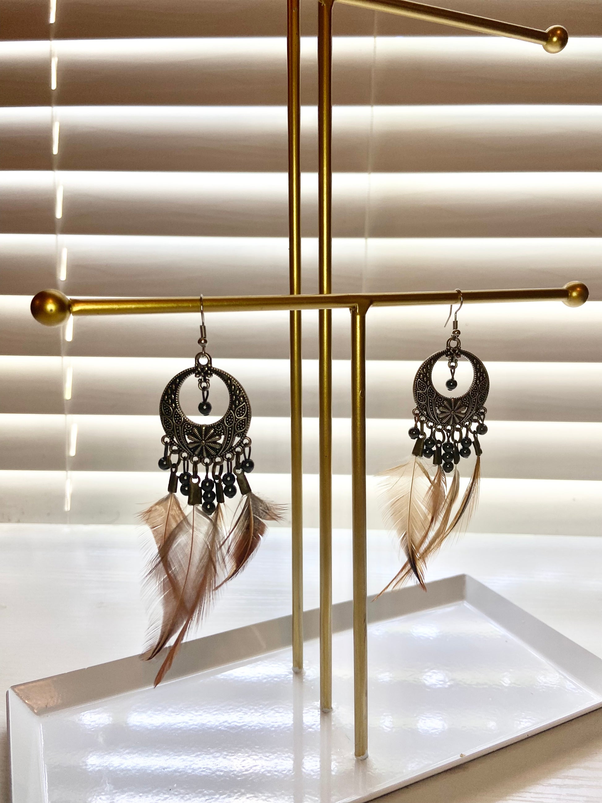 Chandelier earring made with silver accents, hematite seed beads and pheasant earrings.