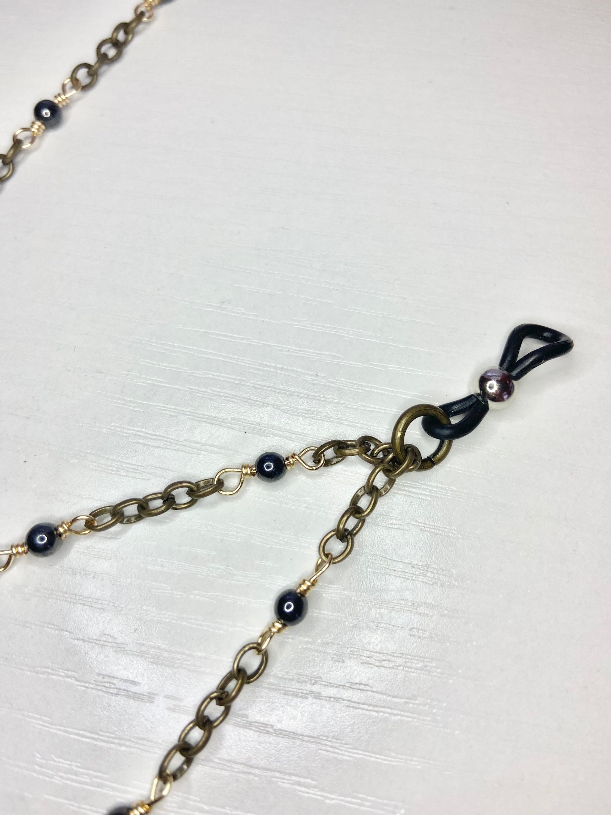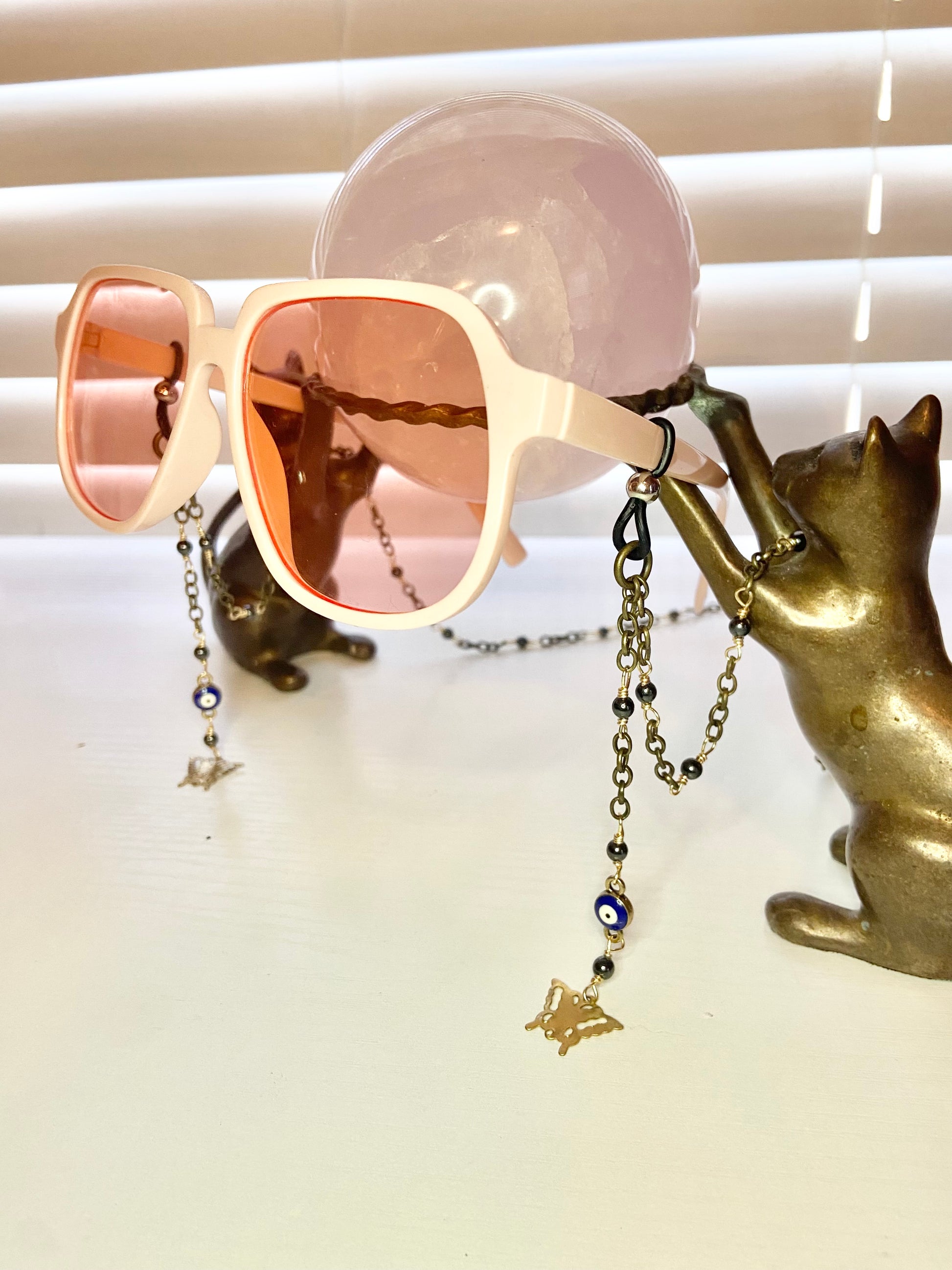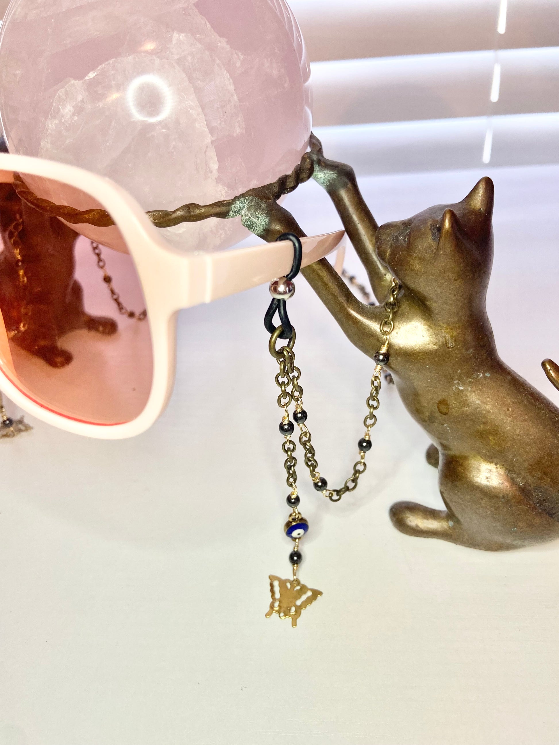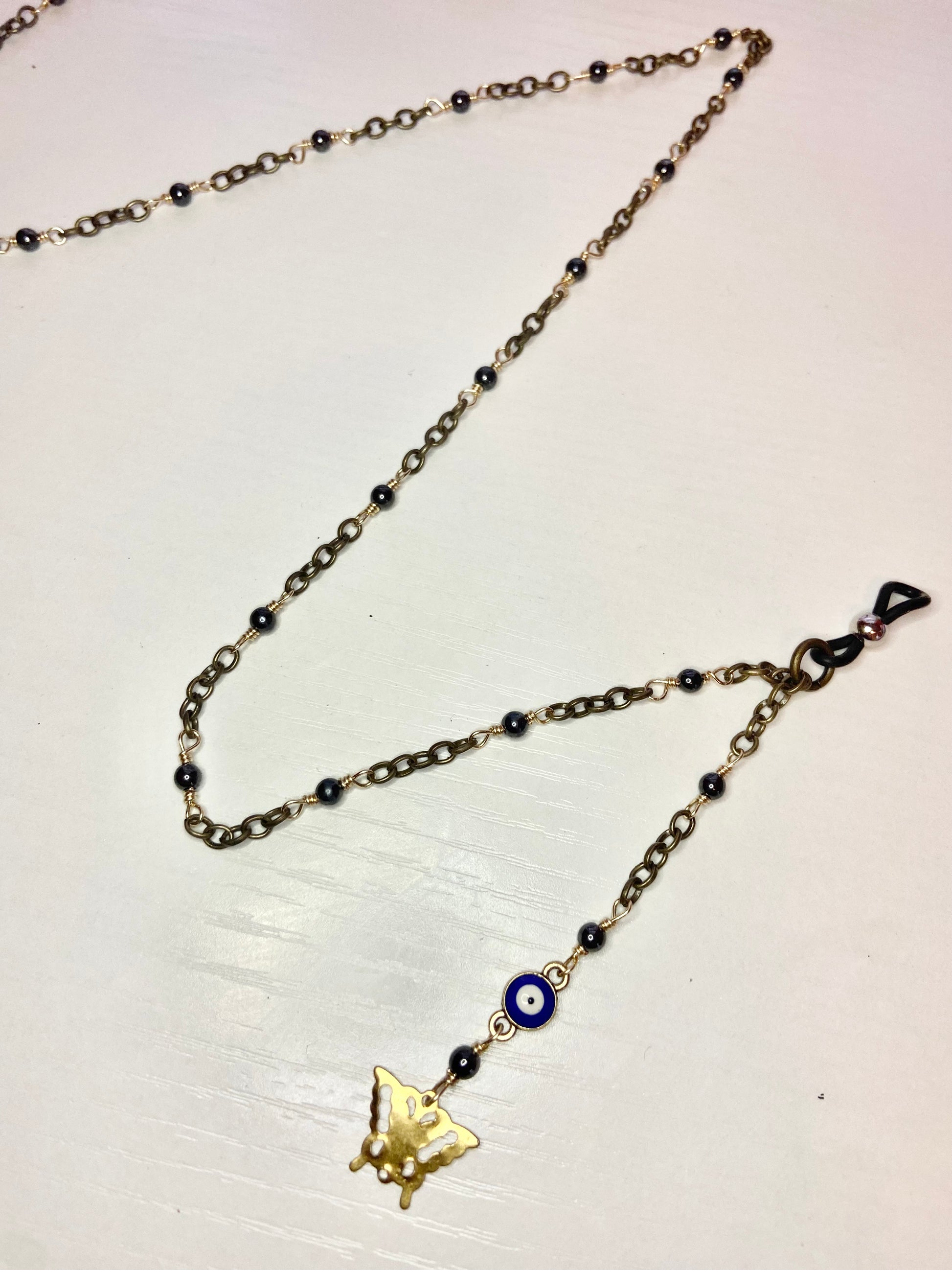 Lanyard made with hematite beads, gold wire, antique chain, evil eye beads with a gold butterfly charm.