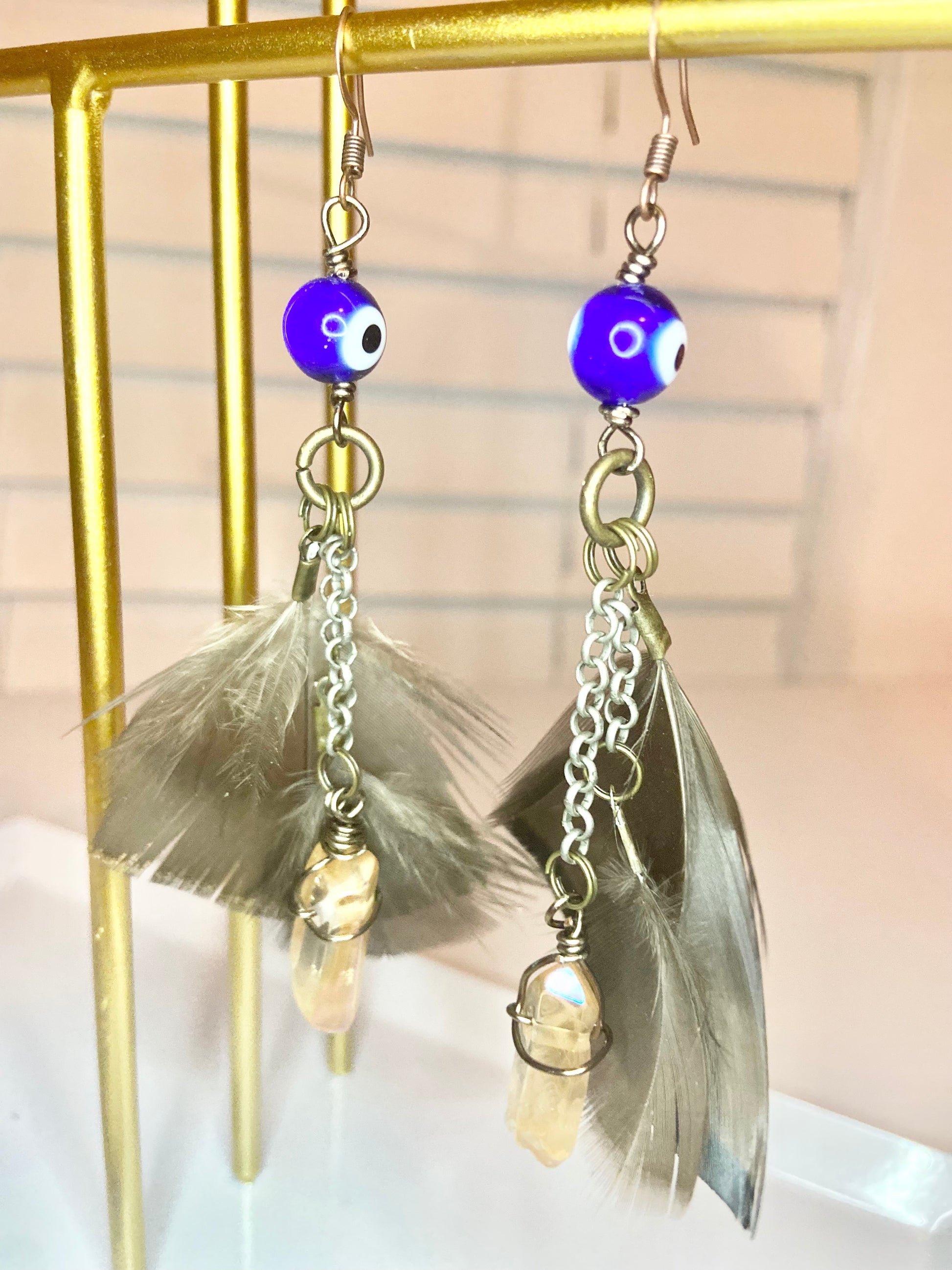 Earrings made with Turkey feathers, citrine gemstones and blue evil eye beads.