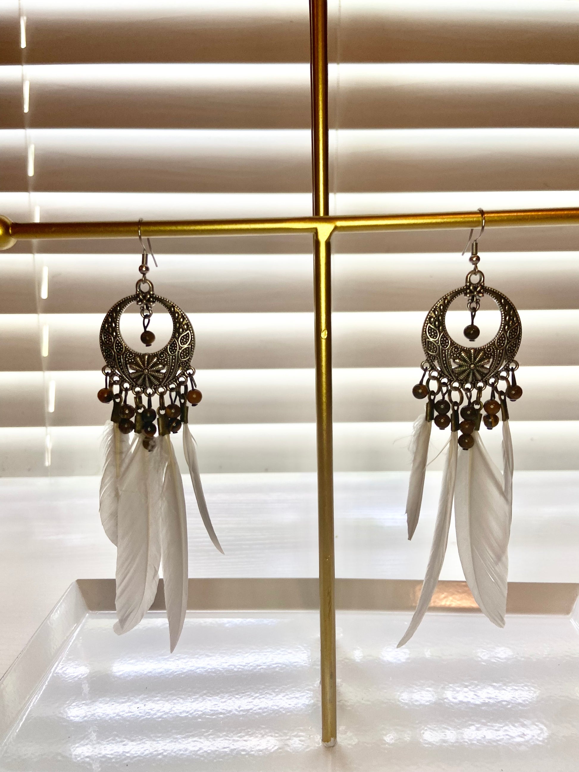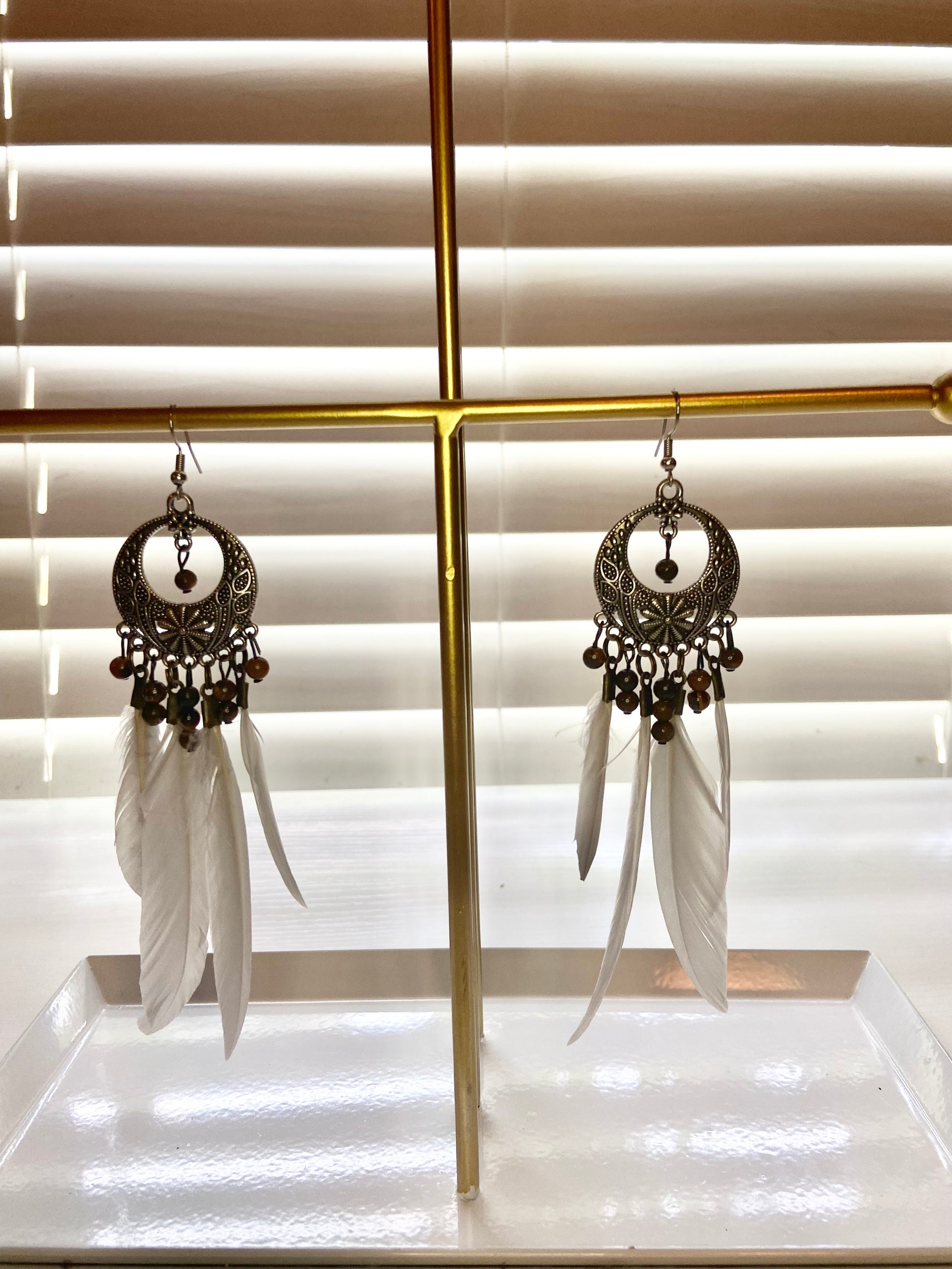 Chandelier earrings made with white feathers, brown seed beads and silver accents.