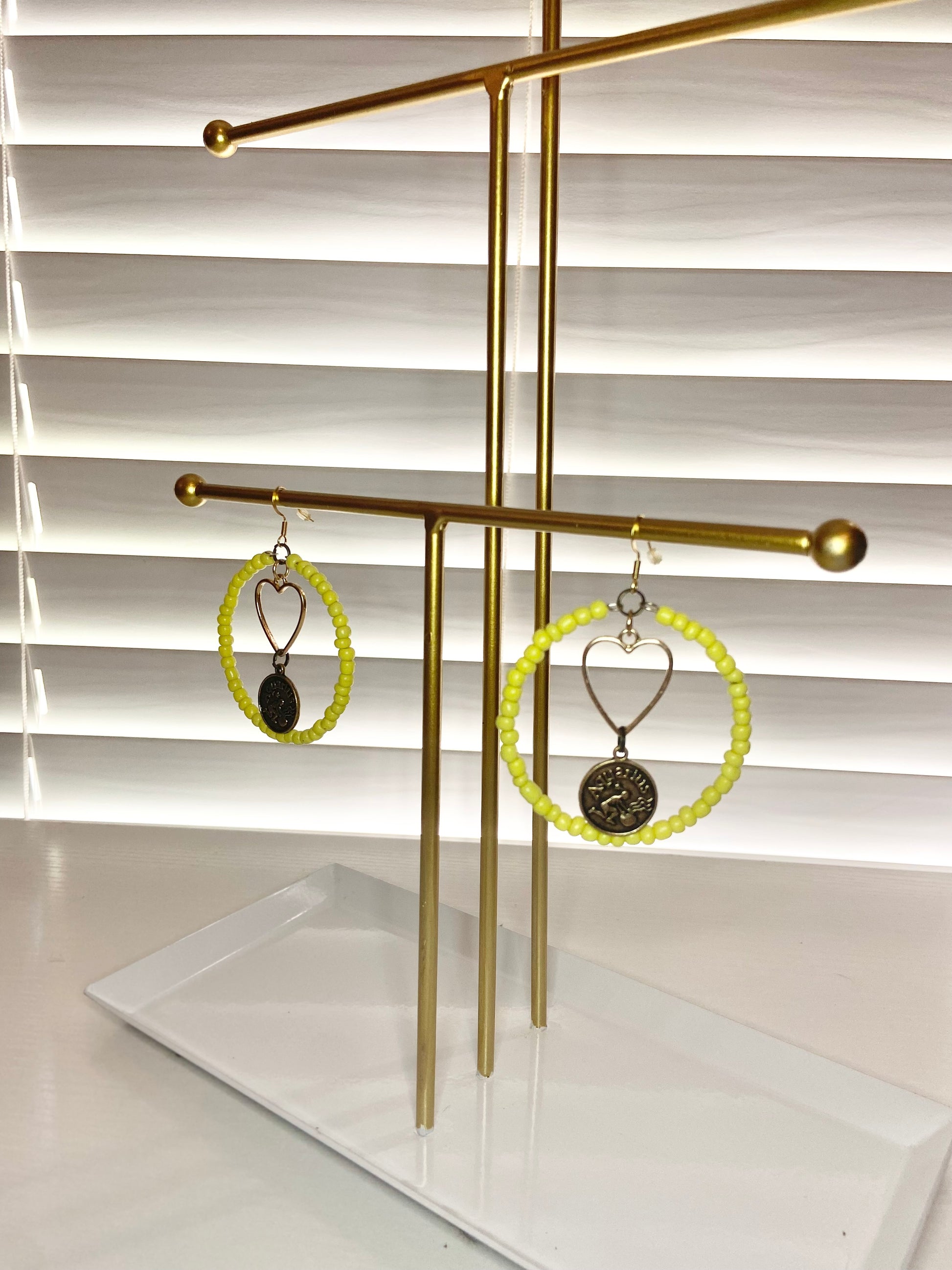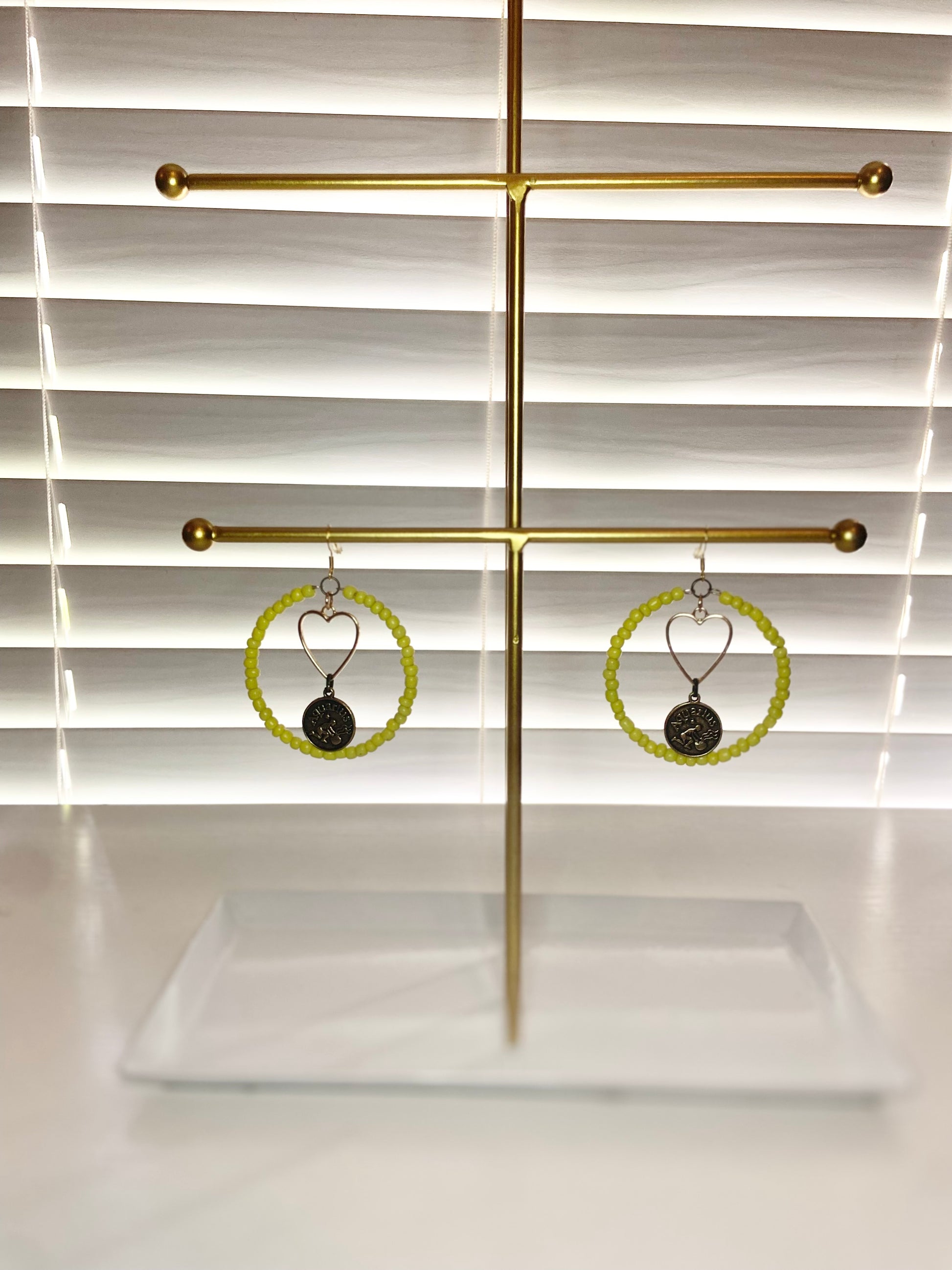 Medium size hoops made with yellow seed beads and an aquarious charm.