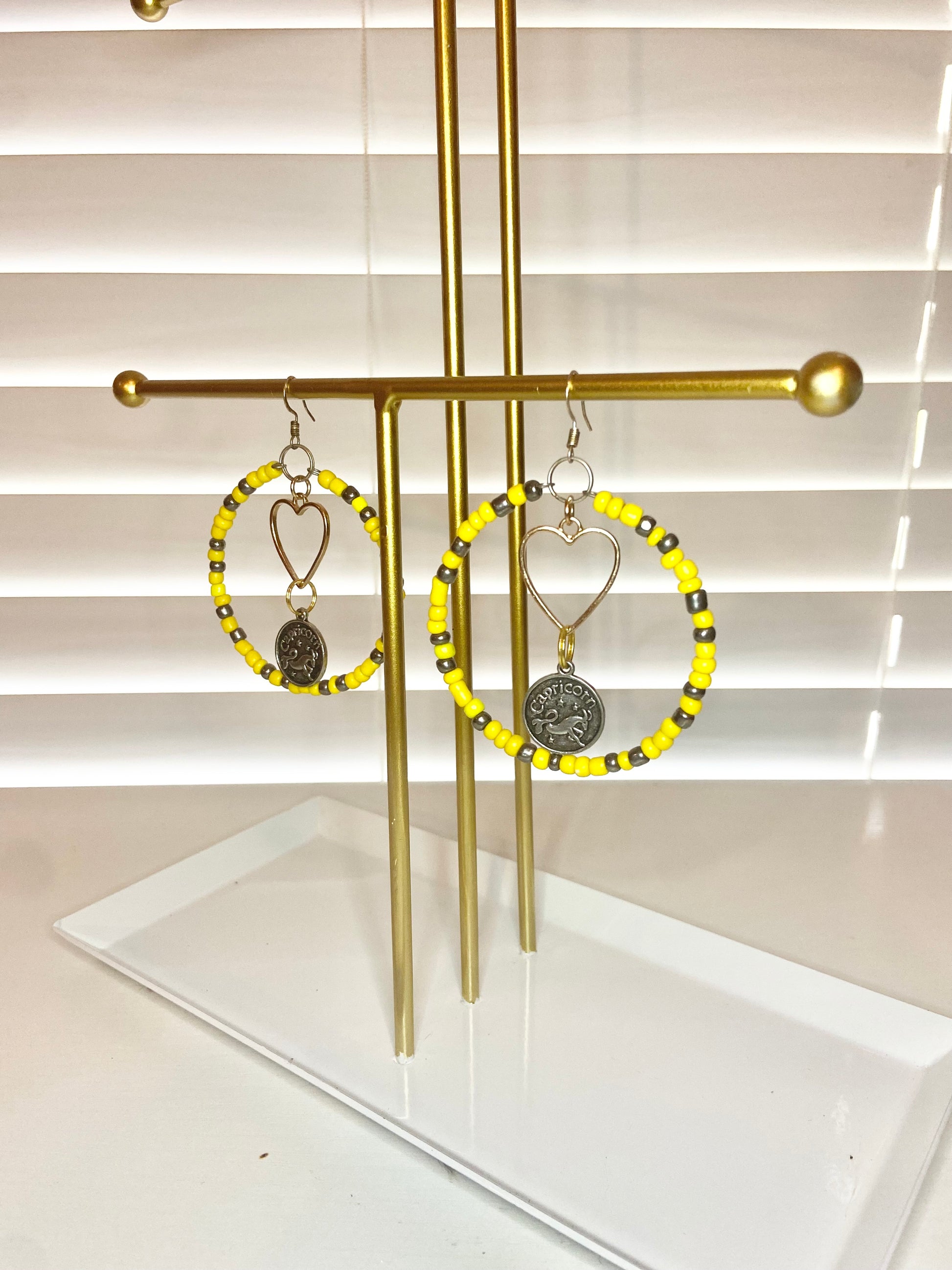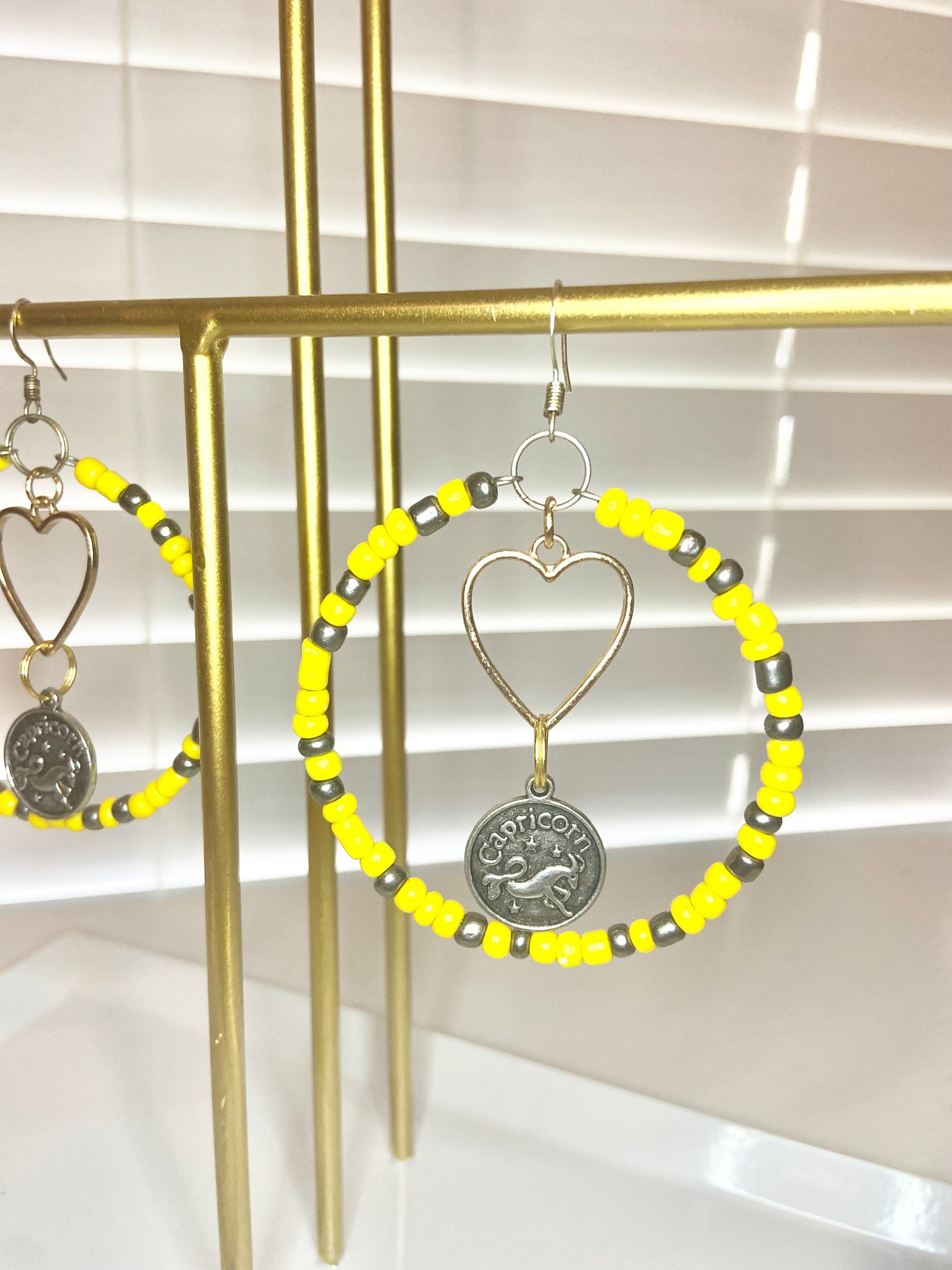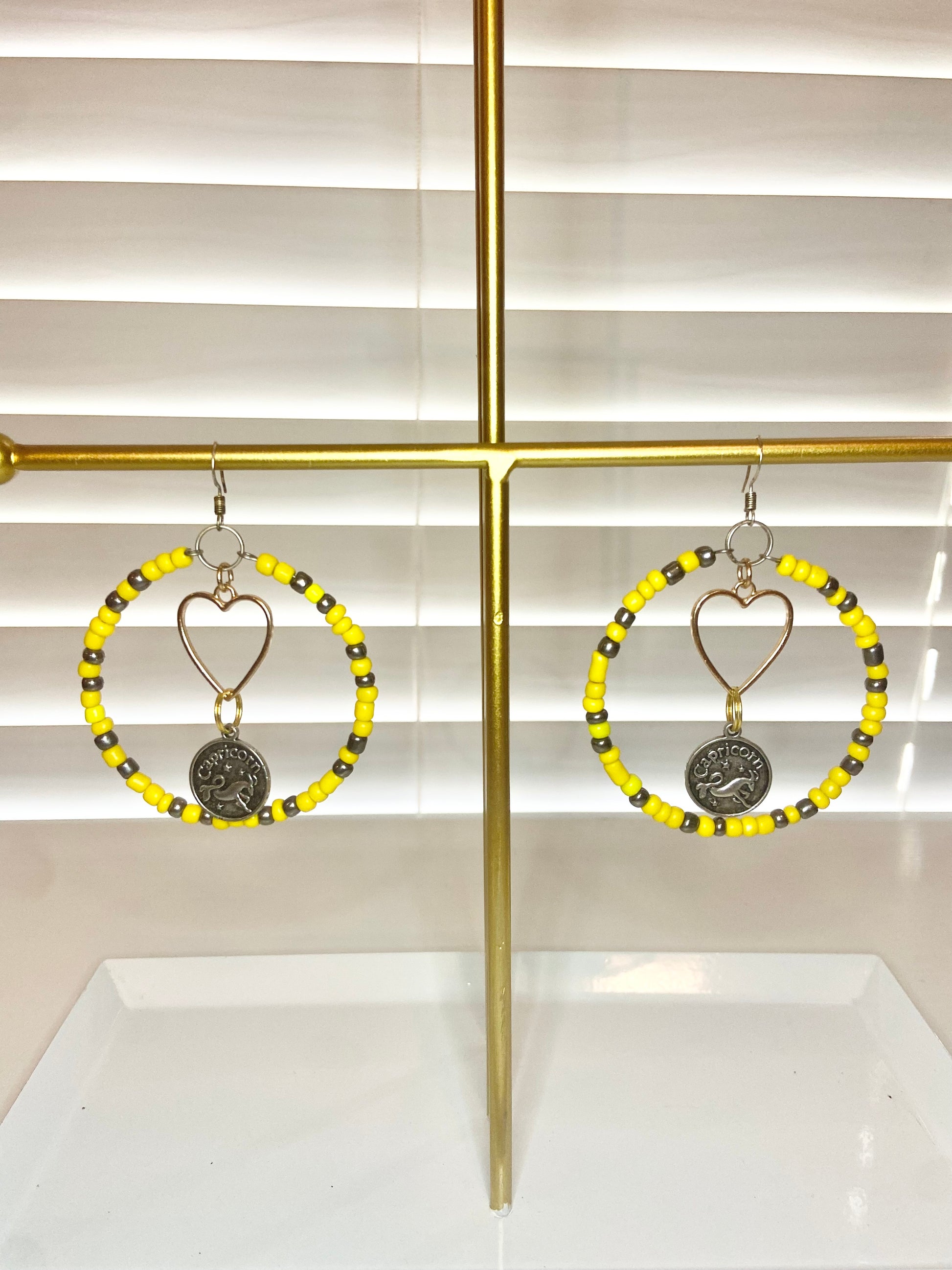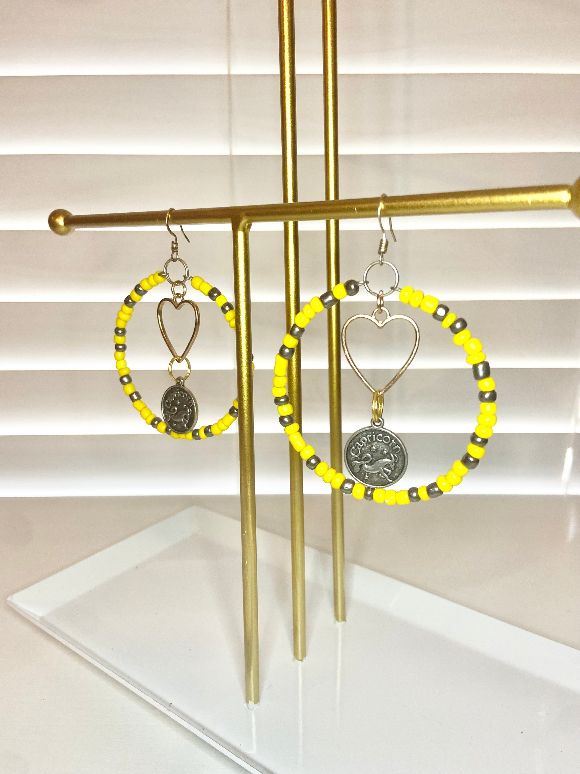 Medium size hoops made with yellow seed beads and silver Capricorn charms.