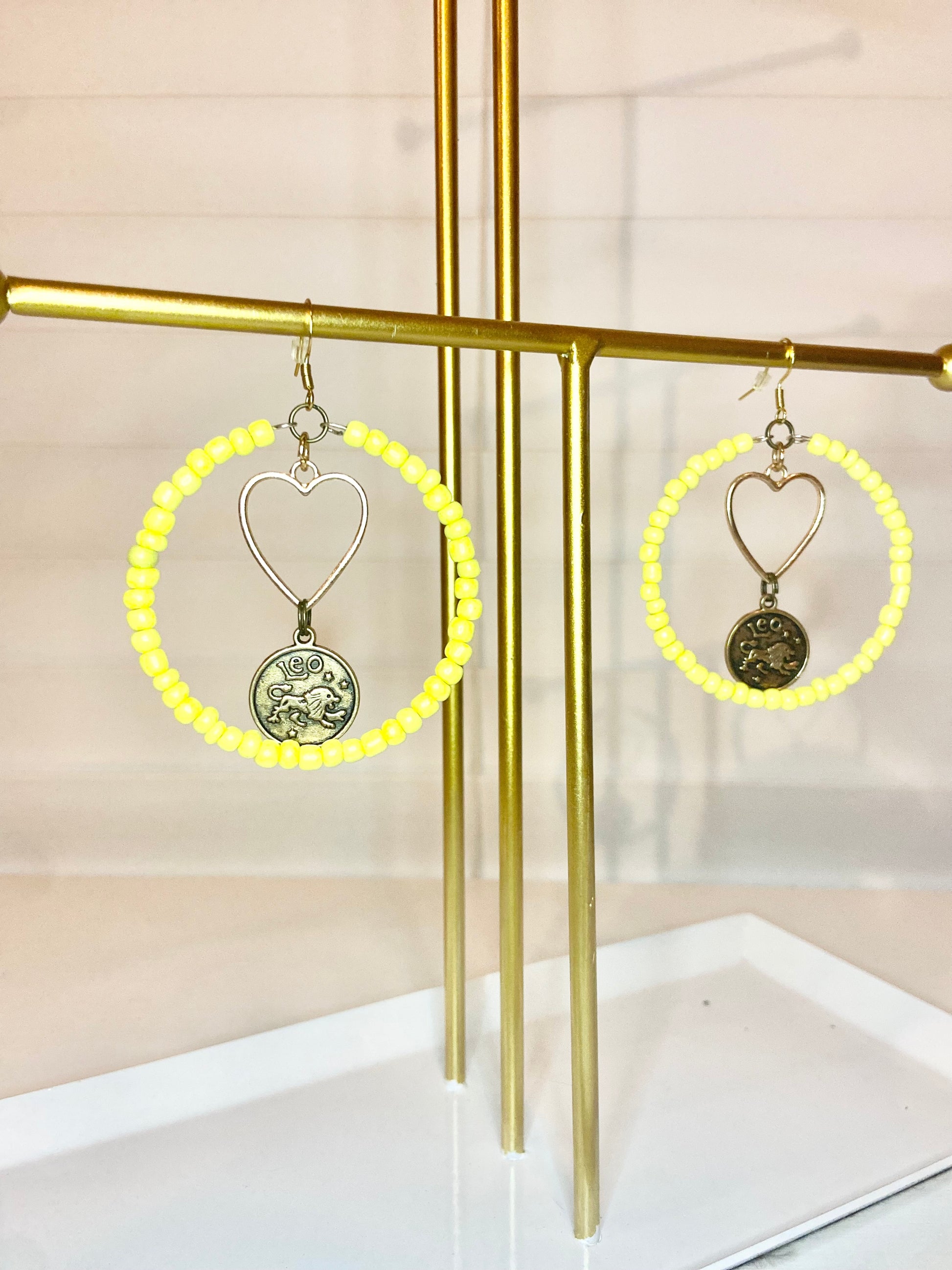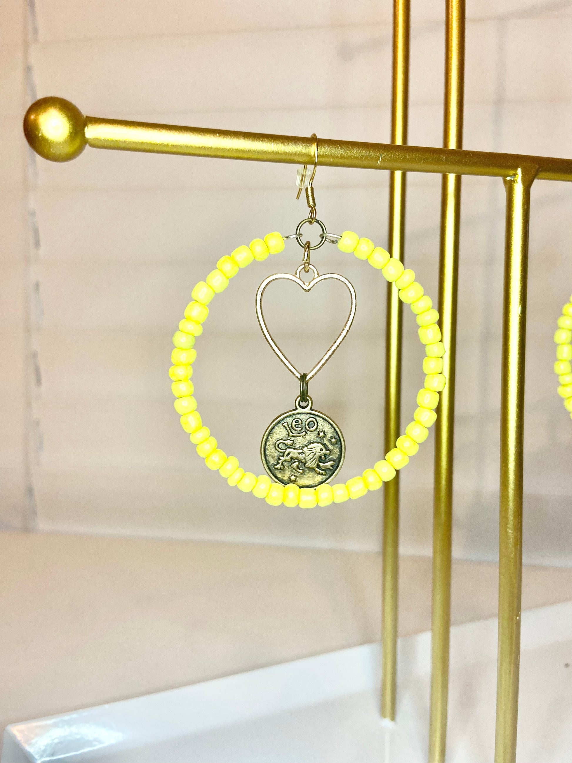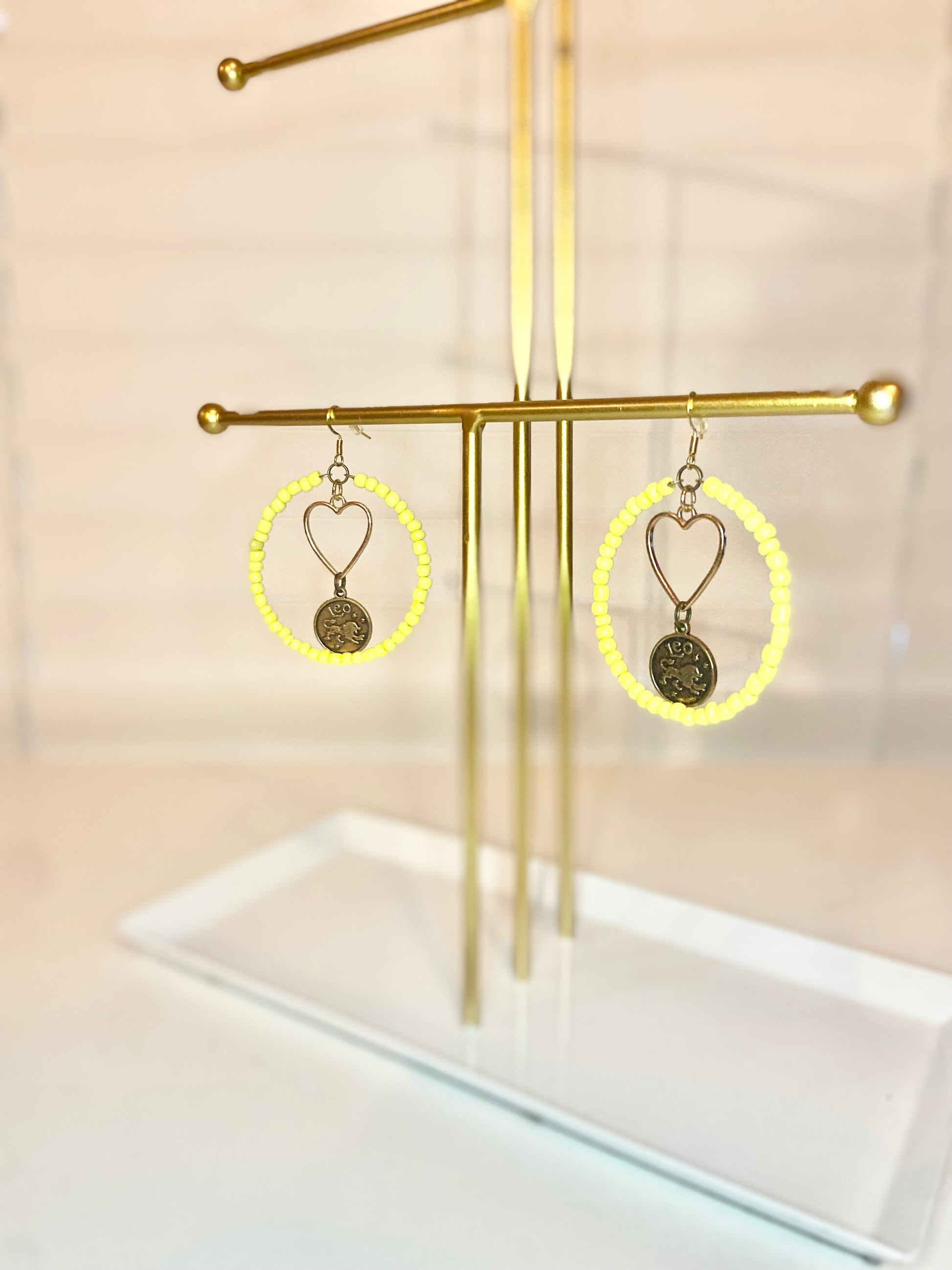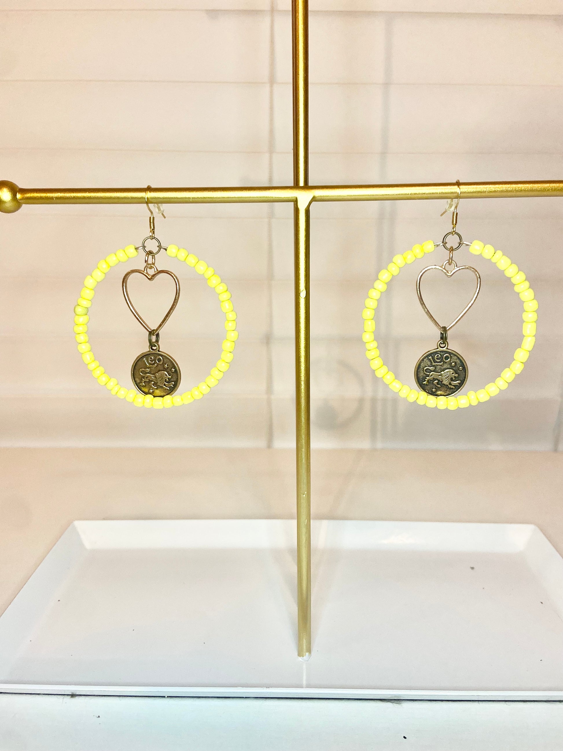 Medium size hoops made with yellow seed beads and a gold leo charm.